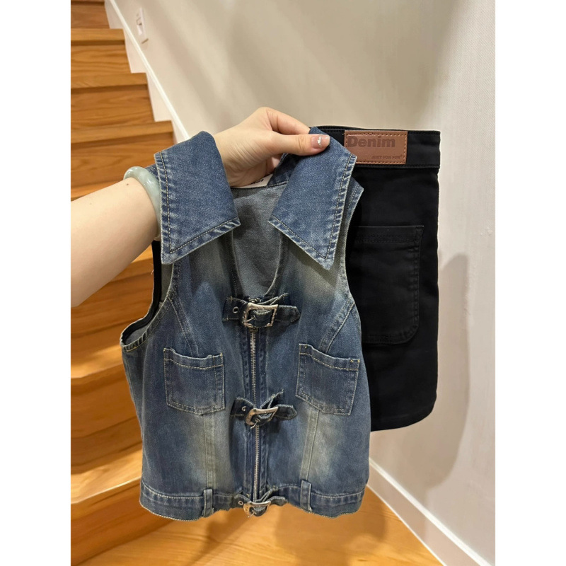 홍콩 스타일 빈티지 슬림 핏 슬리밍 데님 조끼 여성 여름 디자인 뜨거운 소녀 짧은 소매 탑 트렌디스토어 가기
