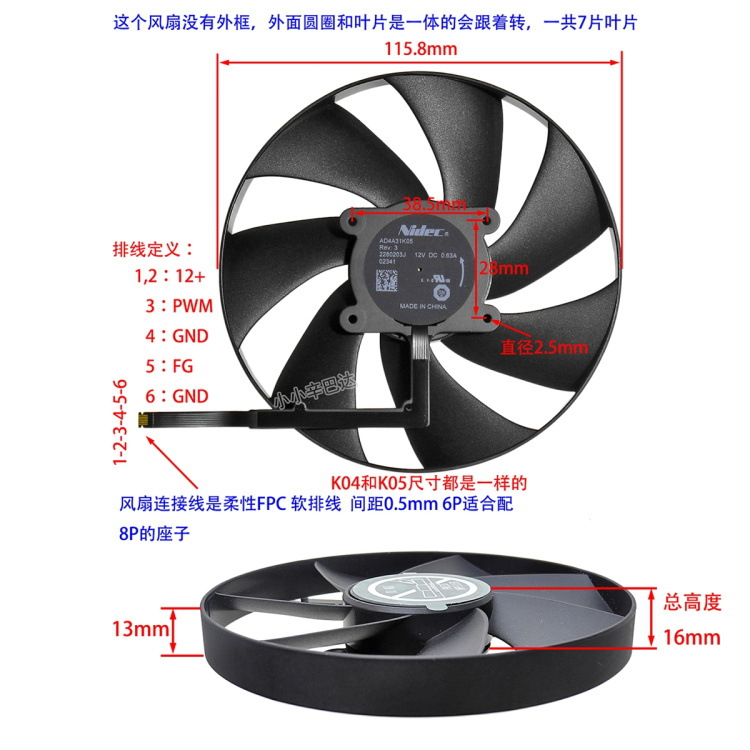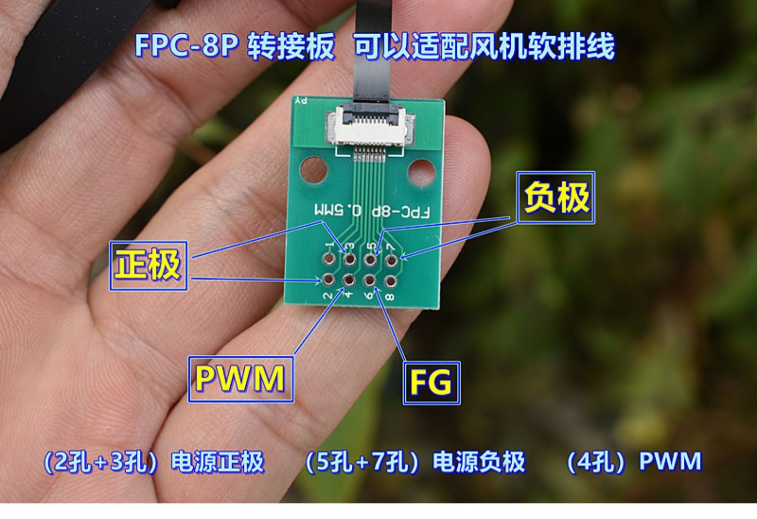 风机连接方式是6P的软排线,一般直接焊接排线很难使用,店主随机配送一个通用PFC转接板,转接板输出的线需要自己焊接了。