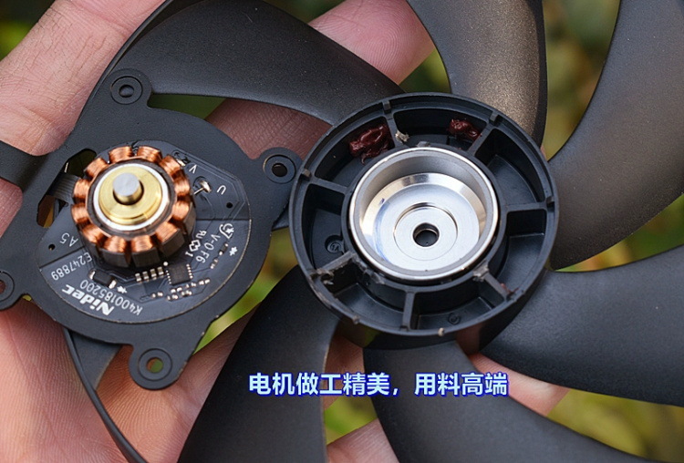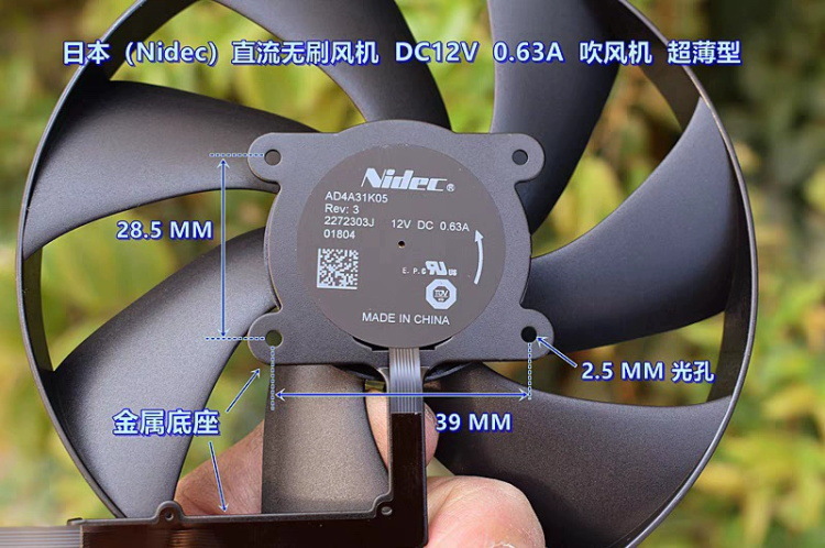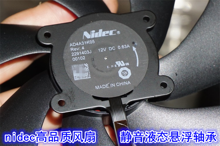 库存日本nidec高端无刷散热风扇,原先是用在4090显卡上面的,支持PWM信号无极调速,风机运行安静,做工用料非常好,长寿液态轴承,转子中间铝合金材质做工精美,电机标称12V,0.63A,实测支持5V-12V之间电压运行。