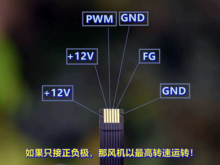 这款风机的第一脚和第二脚是相通的电源正极,第四脚和第六脚是相通的,是接GND,如果只接正负极,风机就以最高转速运转了。如果需要用PWM信号调速,那就在第三脚上输入PWM信号,PWM信号的负极也要并接在GND上,调占空比就是调速了。