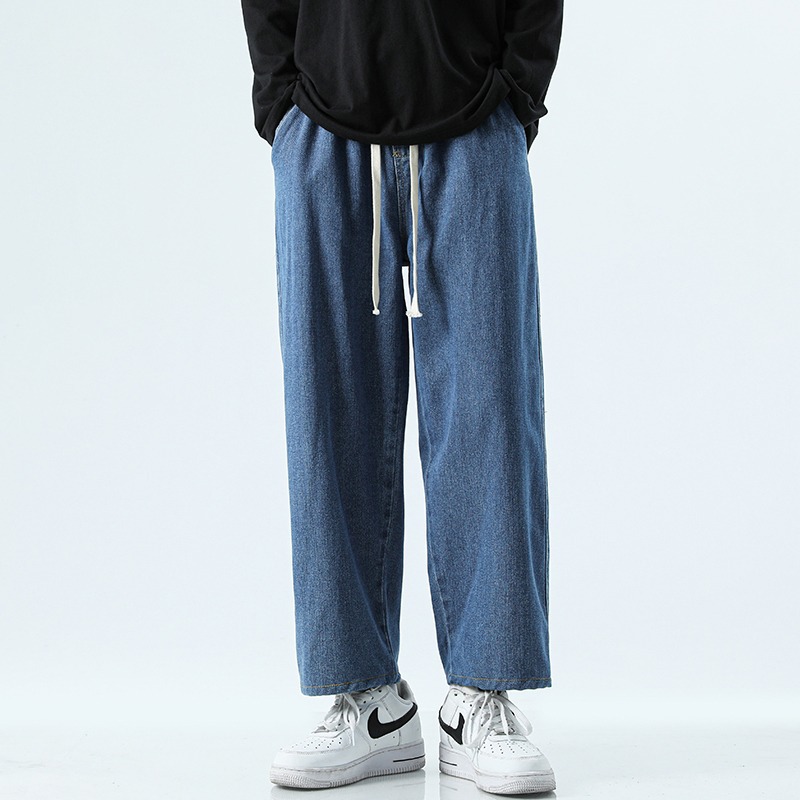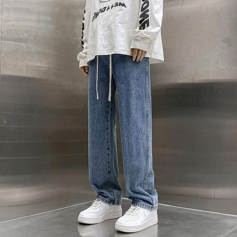 공장 스트레이트 드로우 스트링 스트레이트 데님 바지 남자 캐주얼 한국식 느슨한 내구성 와이드 레그 아빠 바지