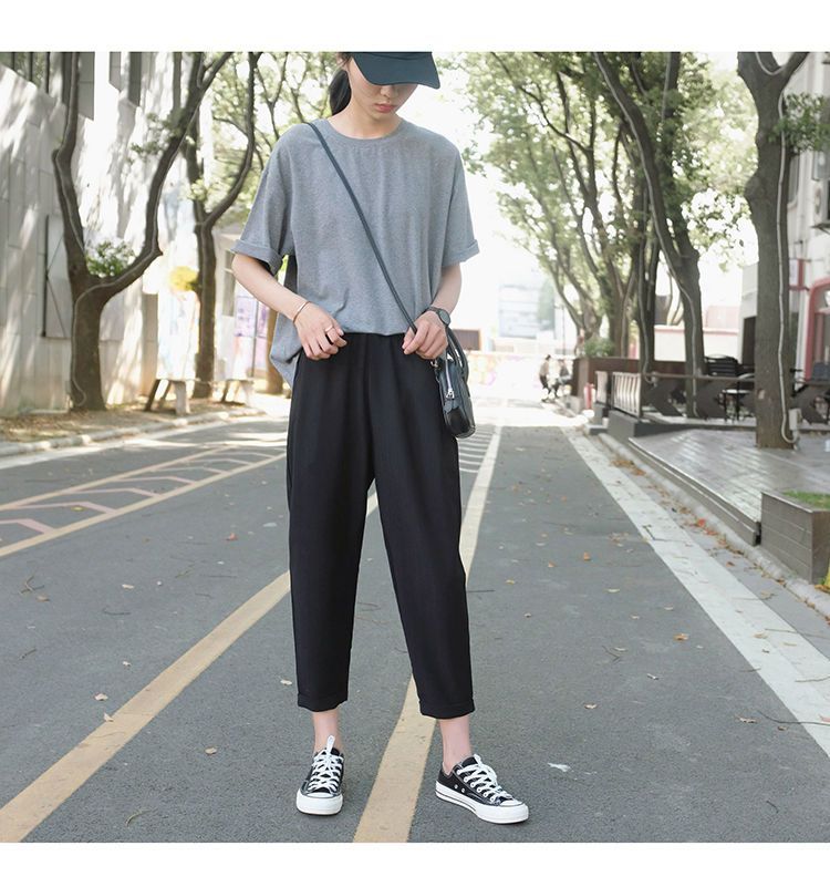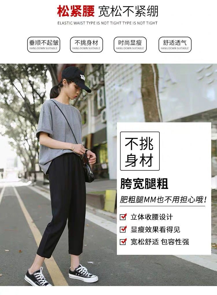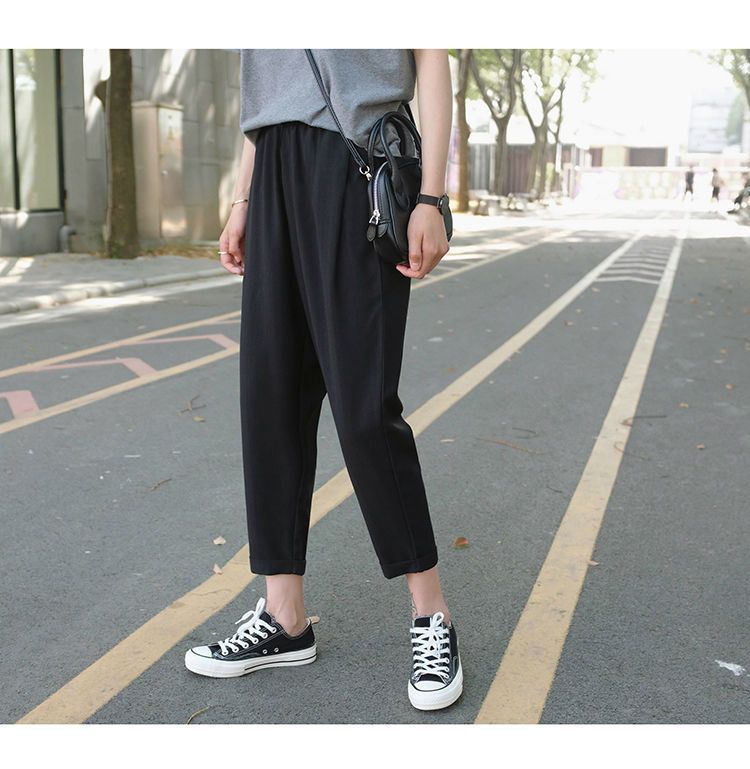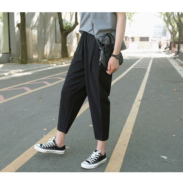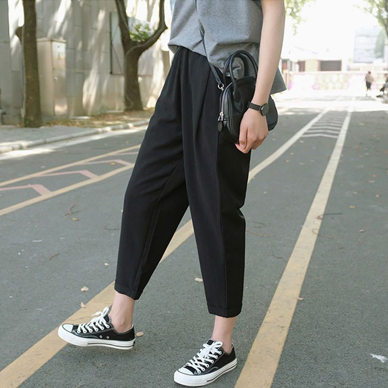 봄과 여름 검은 할렌 바지 여성 높은 허리 느슨한 슬리밍 플러스 사이즈 학생 용 넓은 다리 캐주얼 자른 스트레이트 바지스토어 가기