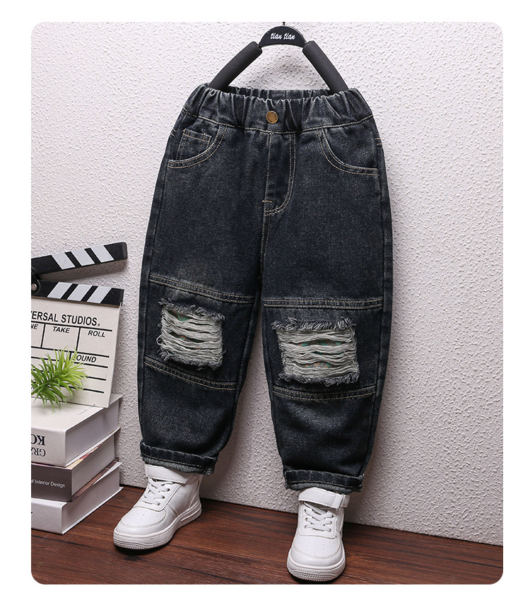 아동용 바지, 가을 신상 남아용 수출용 찢어진 청바지, 패셔너블하고 루즈한 아동용 데님 스트레이트 팬츠 도매스토어 가기