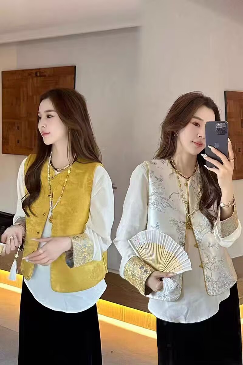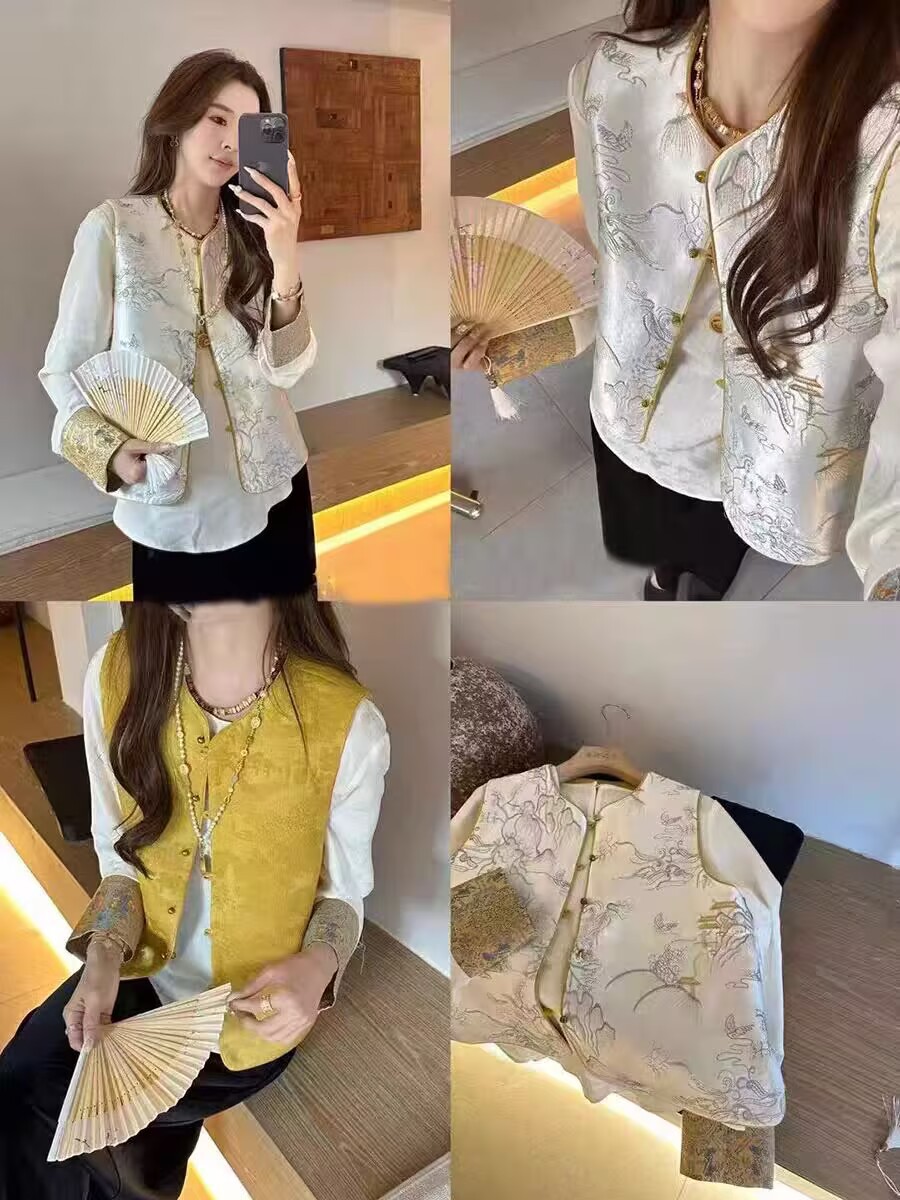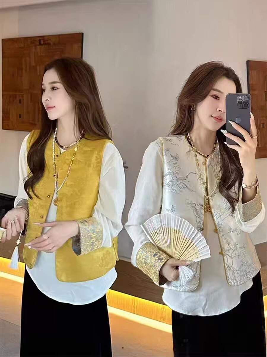 공장 직판 중국풍 여성 자수 조끼 루즈핏 셔츠 봄 양면 착용 조끼 재킷 레트로 스타일