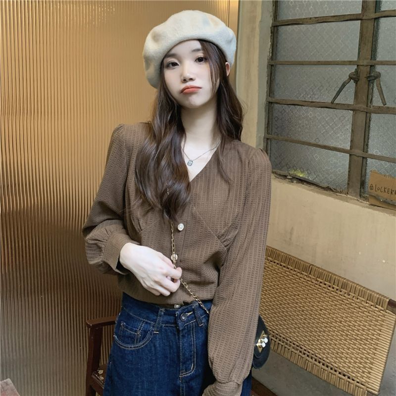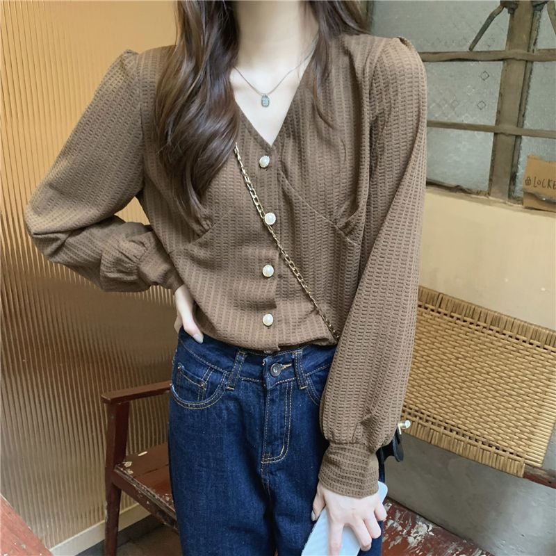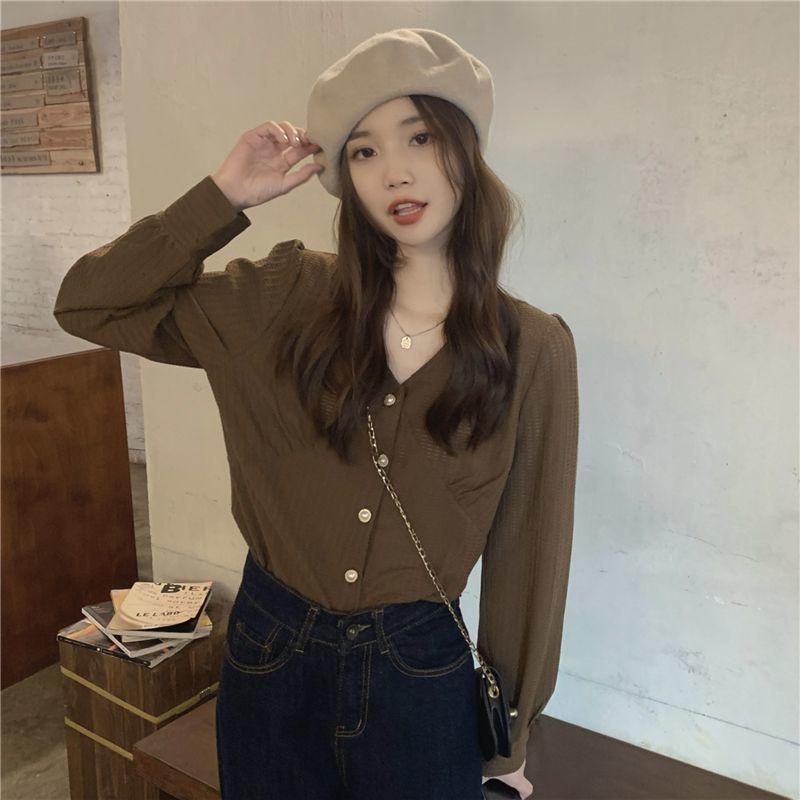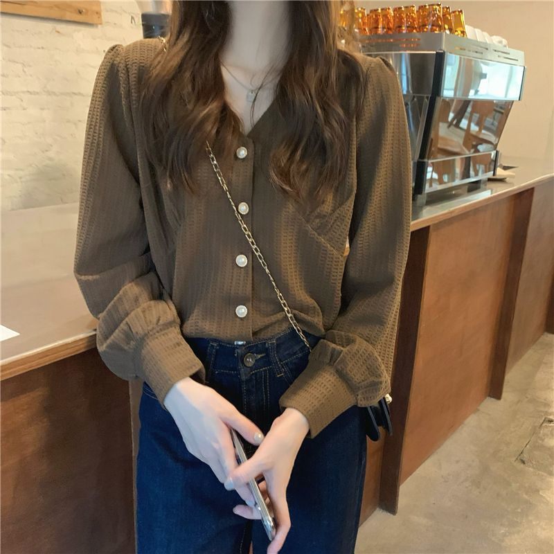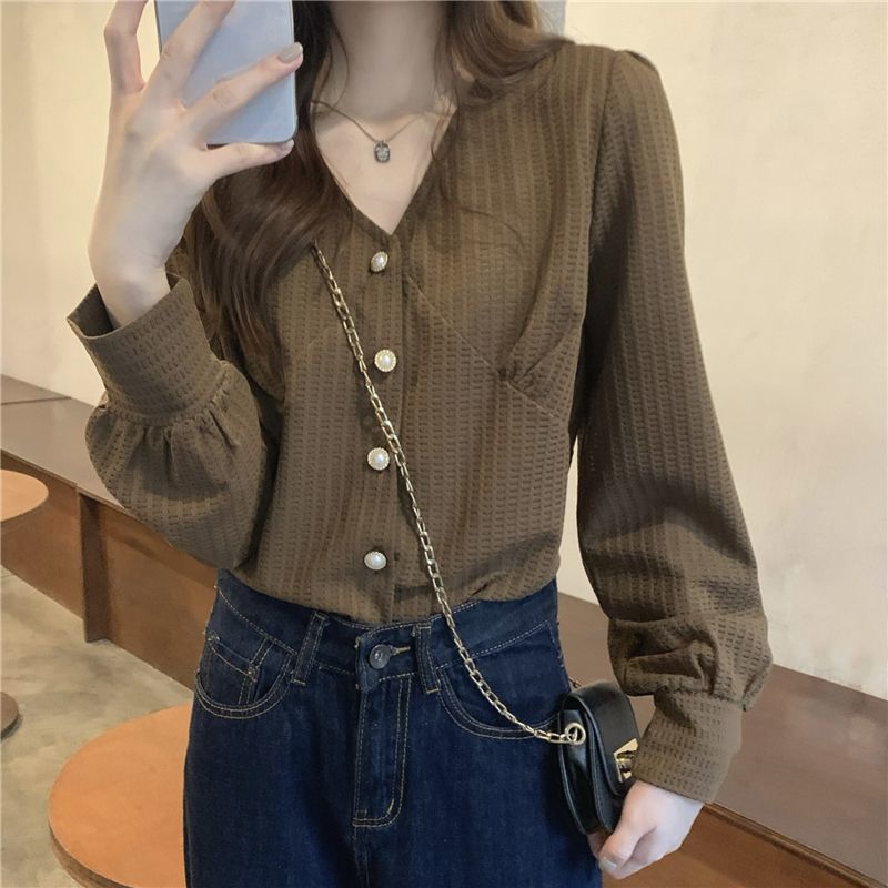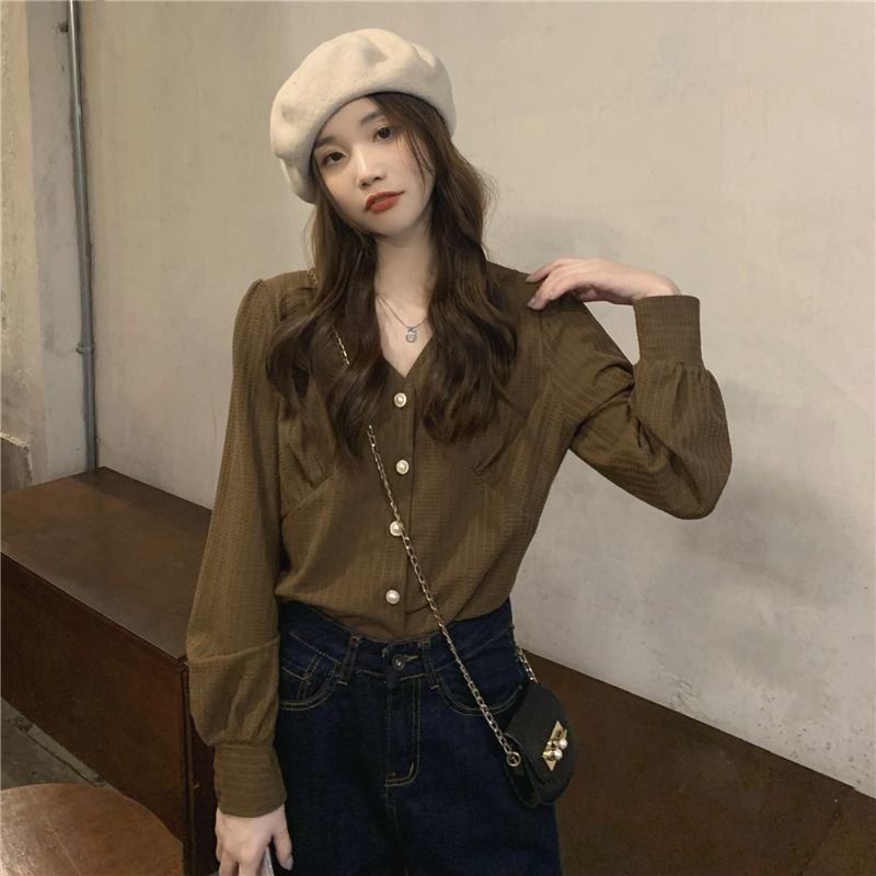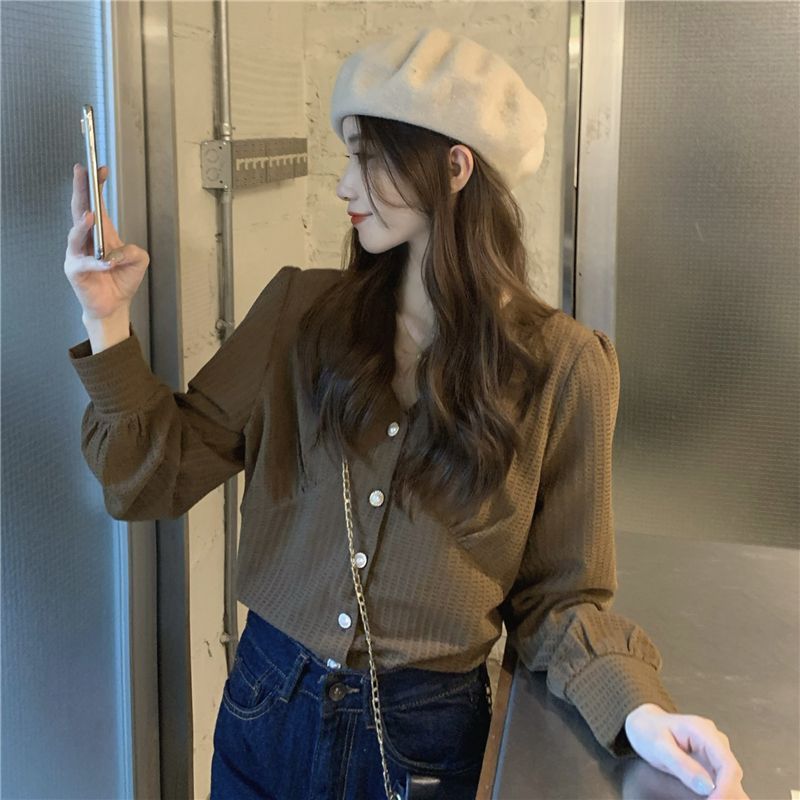 봄과 가을 원피스 2025 새로운 스타일 서양식 작은 셔츠 아름다운 칼라 고급 다크 브라운 프랑스 셔츠 여성 디자인 감각 틈새스토어 가기