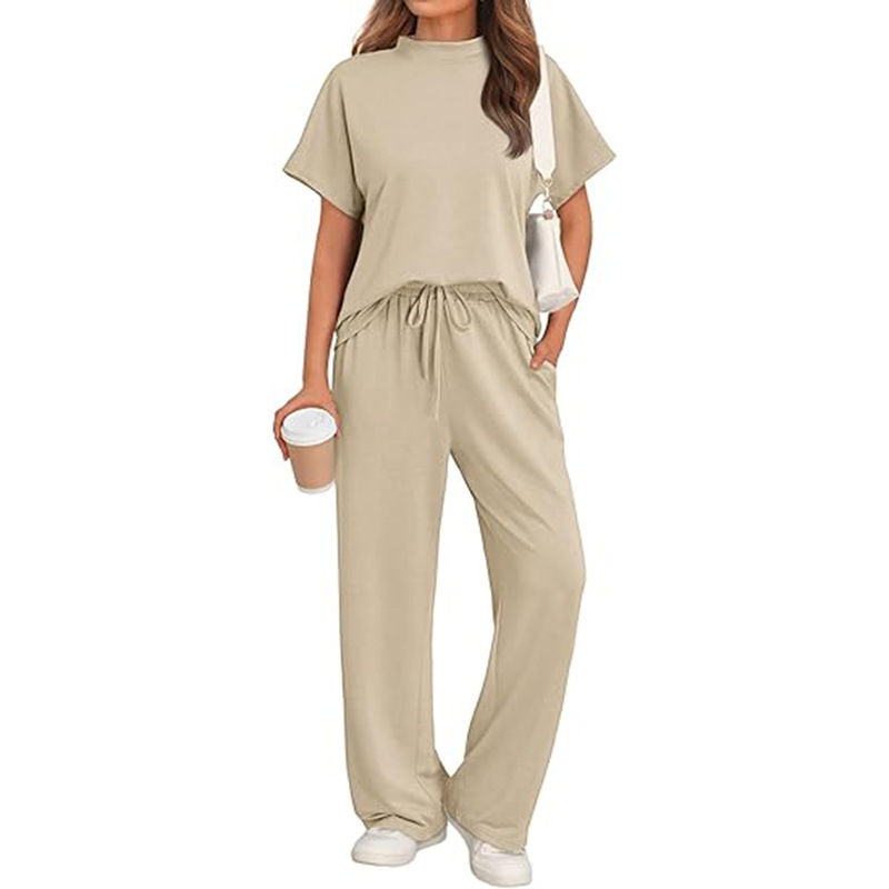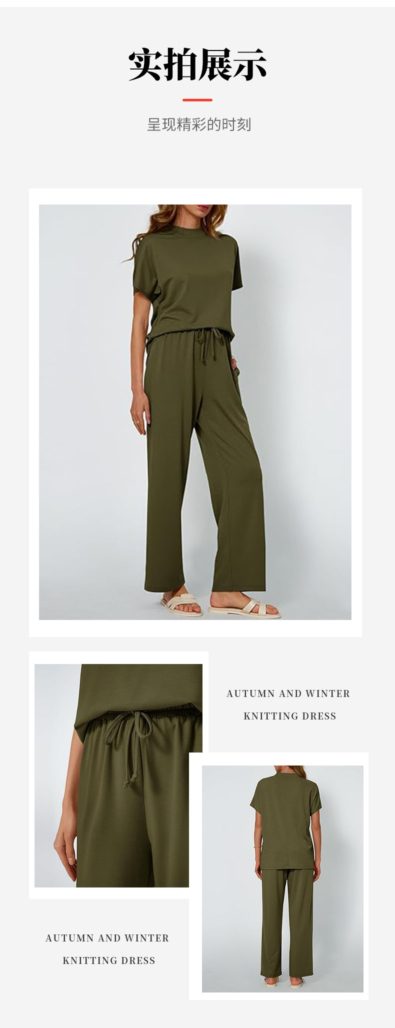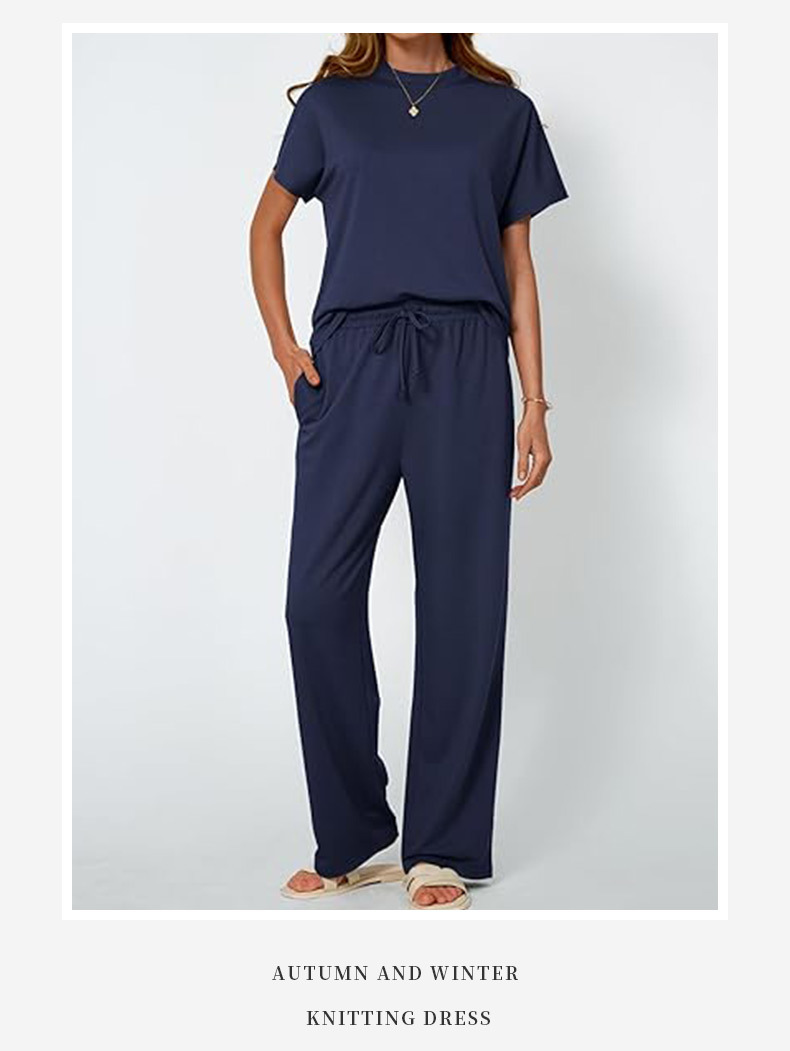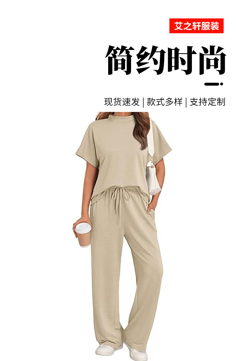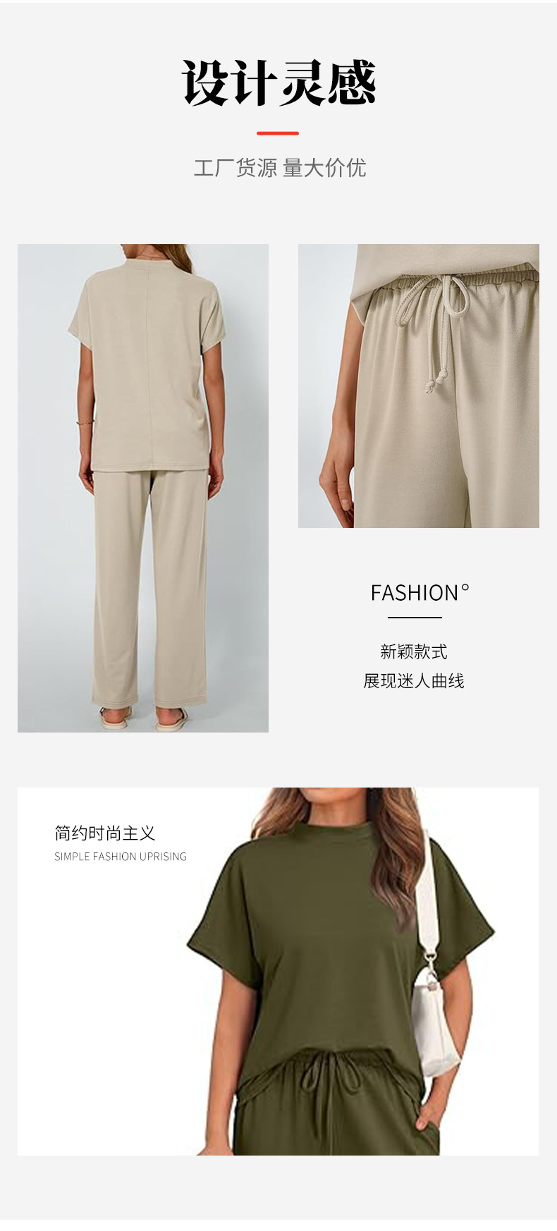 패션 캐주얼 유럽과 미국의 그레이 라운드 넥 반팔 티셔츠 레이스 업 와이드 레그 바지 느슨한 편안한 러닝 스포츠 세트