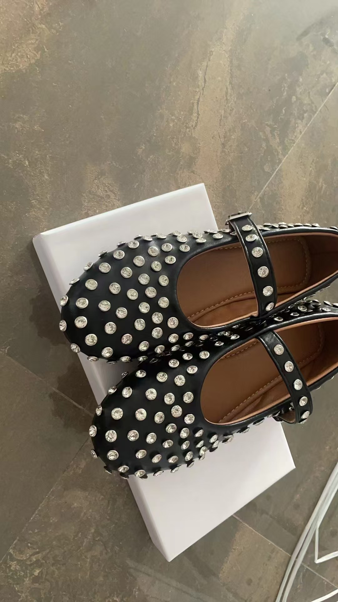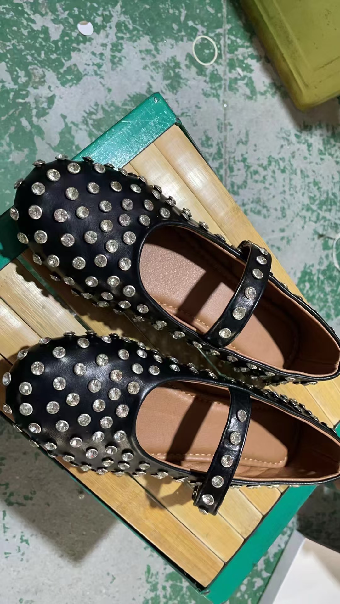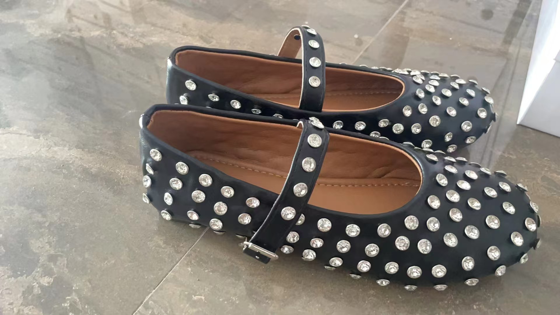 유럽과 미국의 라인스톤 플러스 사이즈 라인스톤 리벳 싱글 슈즈 풀 다이아몬드 벨트 버클 라운드 헤드 플랫 편안한 패션 여성 싱글 슈즈