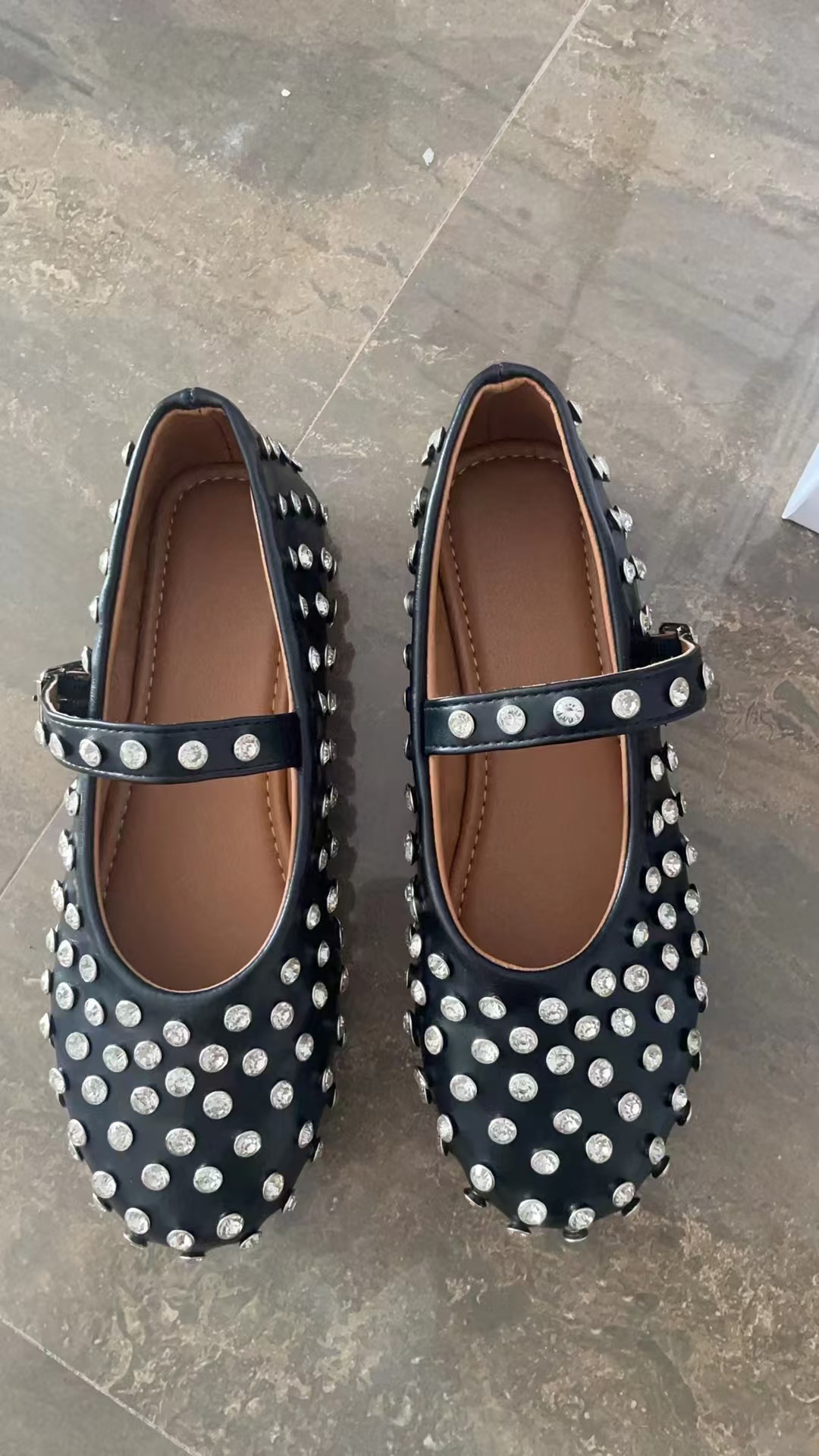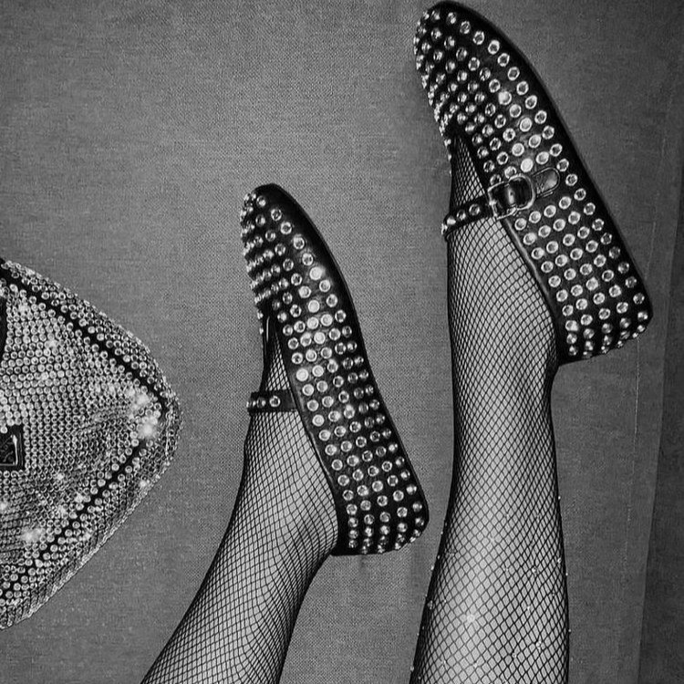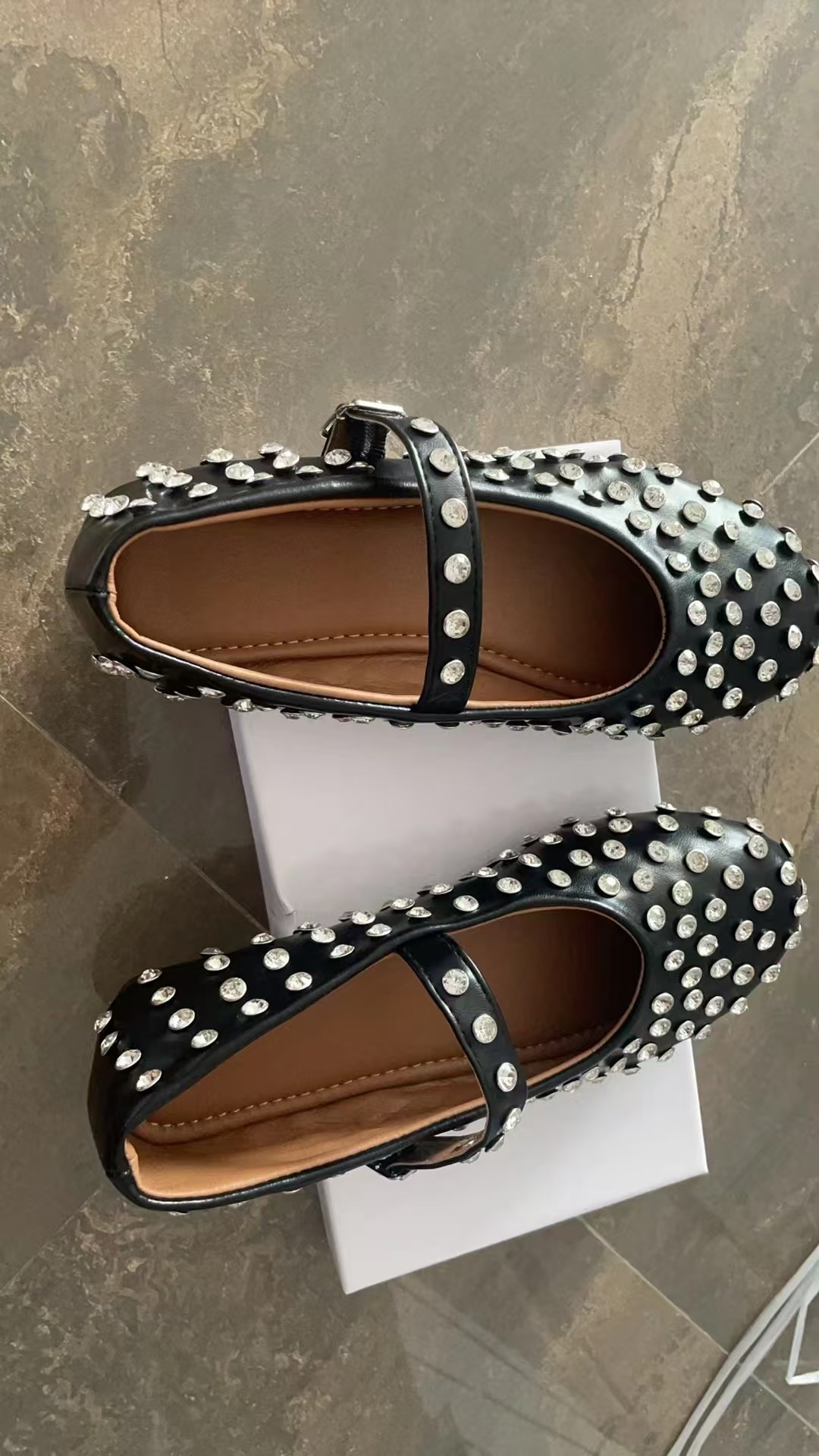 유럽과 미국의 라인스톤 플러스 사이즈 라인스톤 리벳 싱글 슈즈 풀 다이아몬드 벨트 버클 라운드 헤드 플랫 편안한 패션 여성 싱글 슈즈