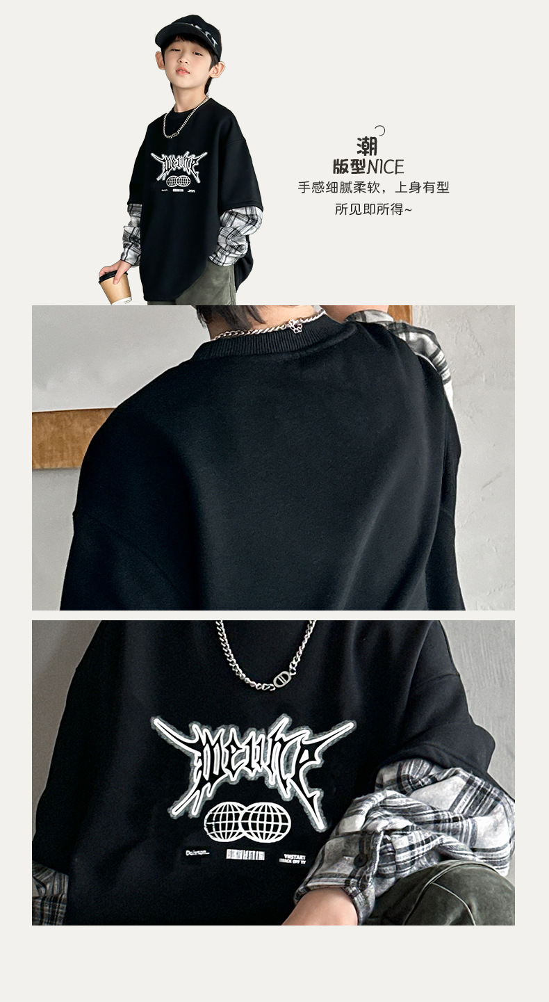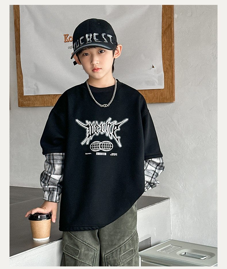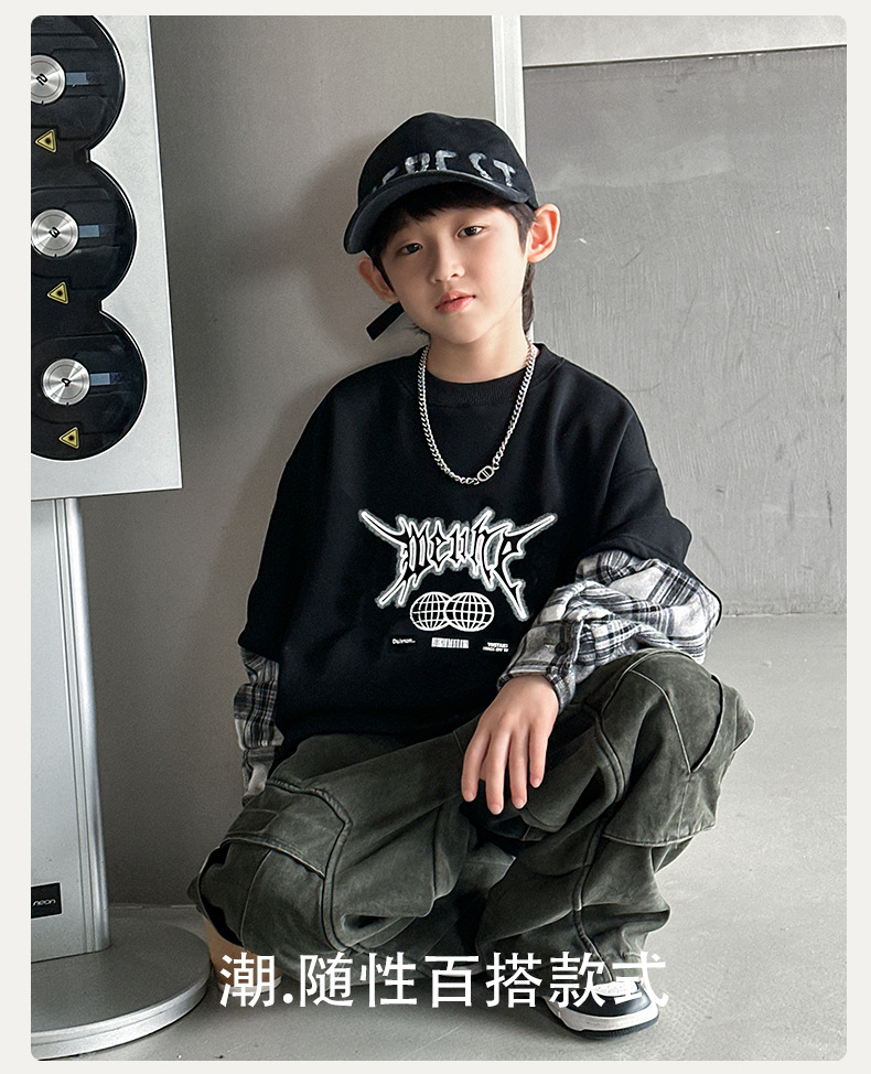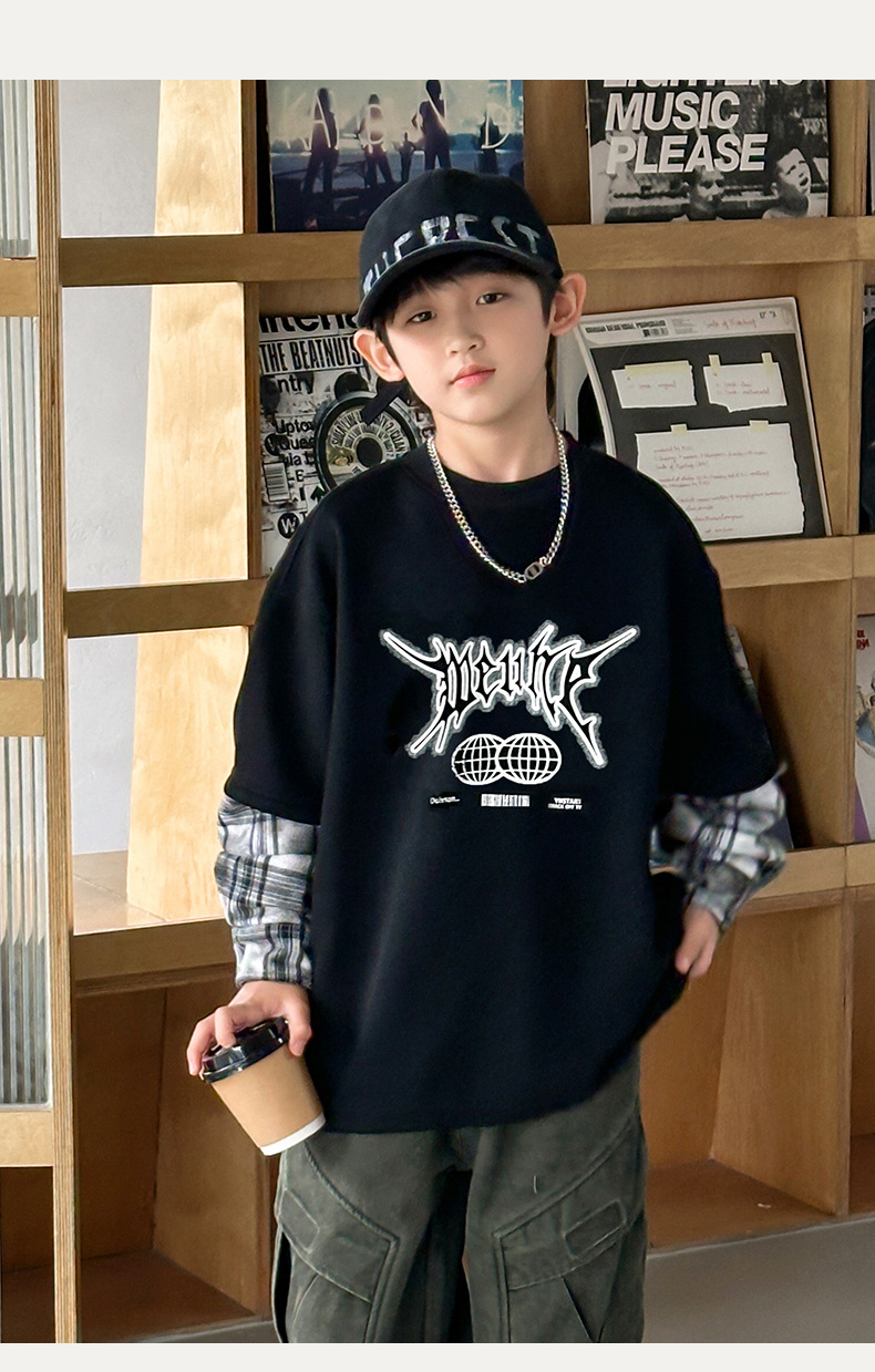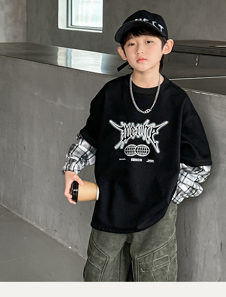 소년 가짜 투피스 긴팔 티셔츠 봄, 가을 2025 새로운 어린이 가을 바닥 셔츠 큰 소년 가을 운동복스토어 가기