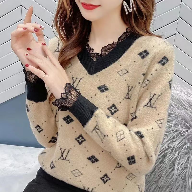 가을과 겨울 새로운 도착 밍크 벨벳 스웨터 여성의 V-Neck 레이스 느슨한 올 매치 니티드베이스 셔츠 두꺼운 탑 트렌디