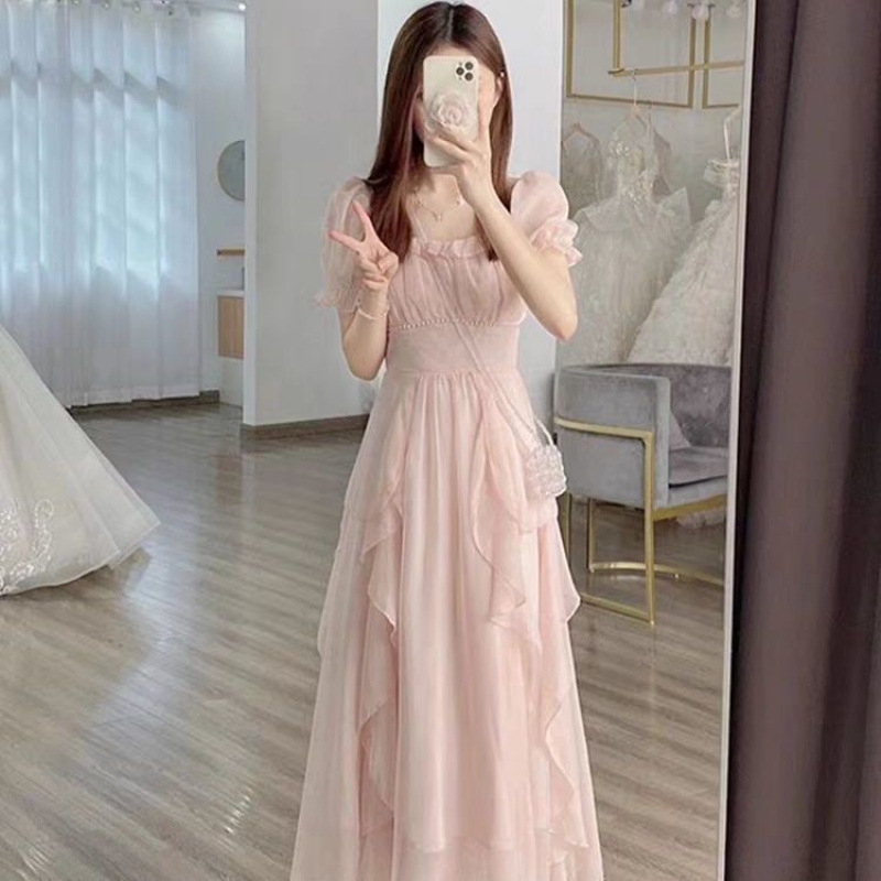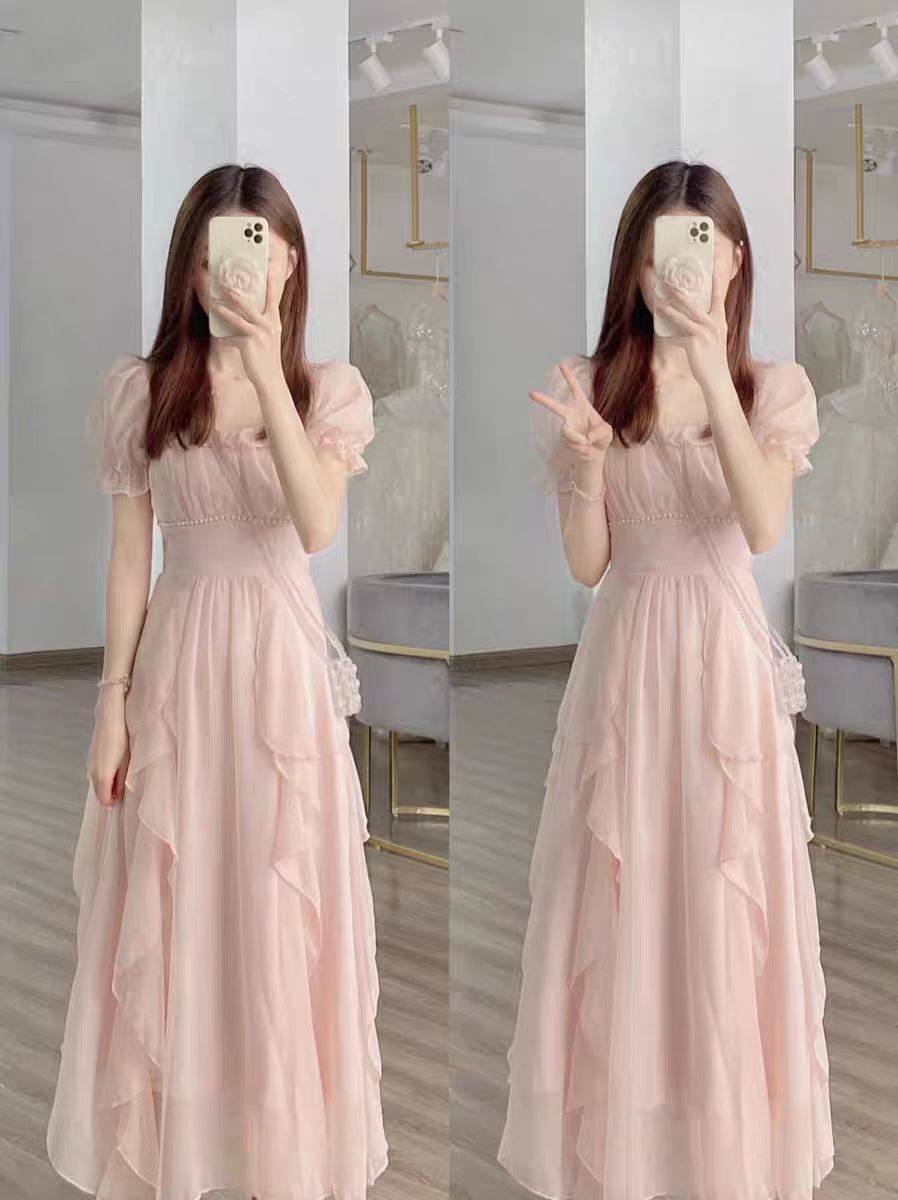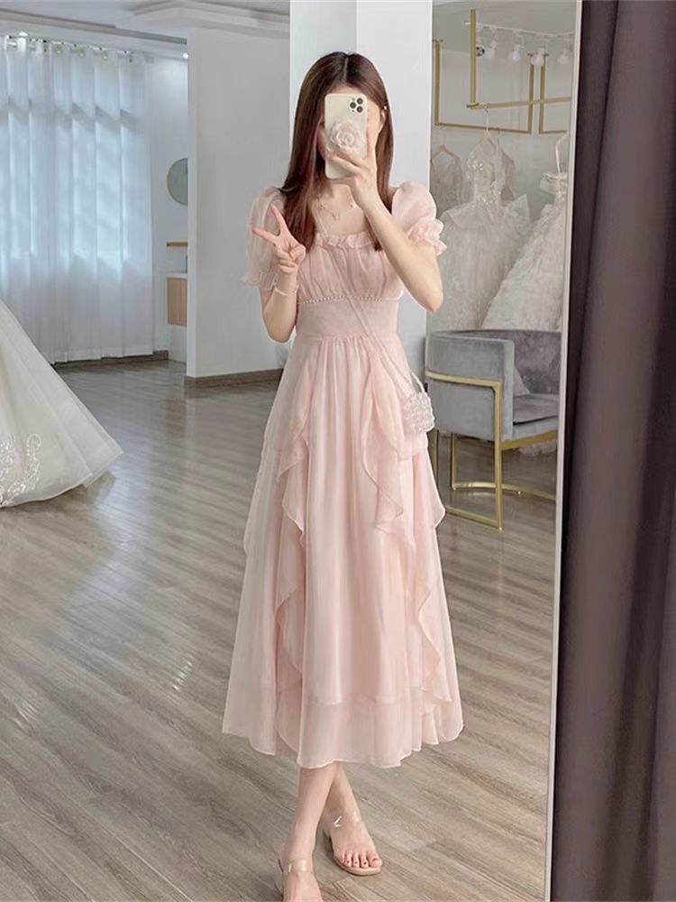 프랑스 스타일 Platycodon 핑크 스퀘어 칼라 원피스 여성 여름 부드러운 스타일 우아한 요정 긴 원피스 질감 하이 엔드 원피스스토어 가기