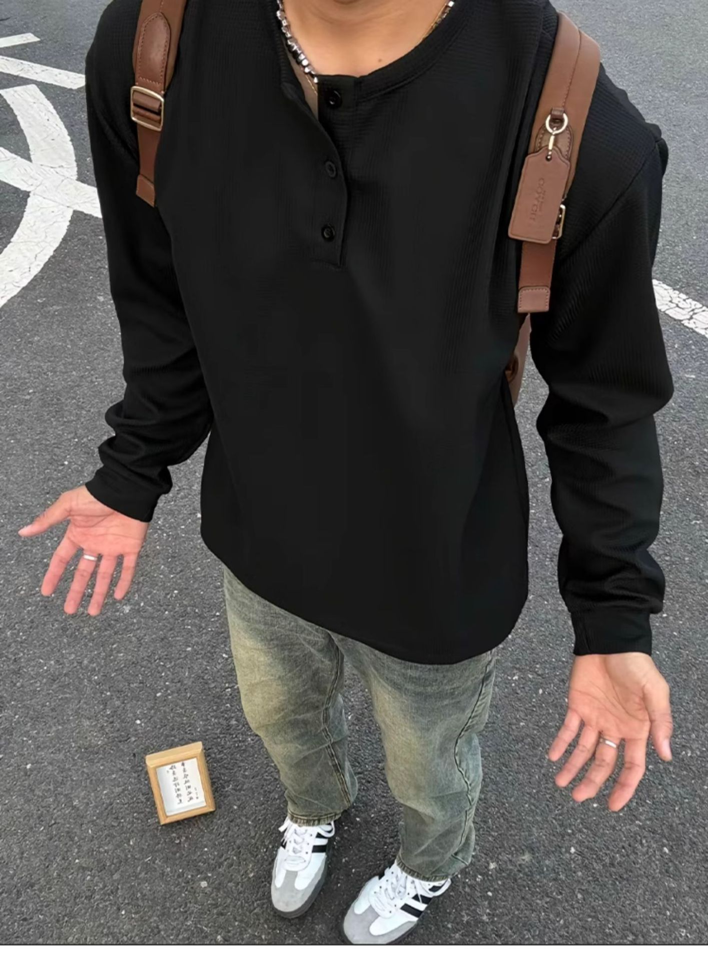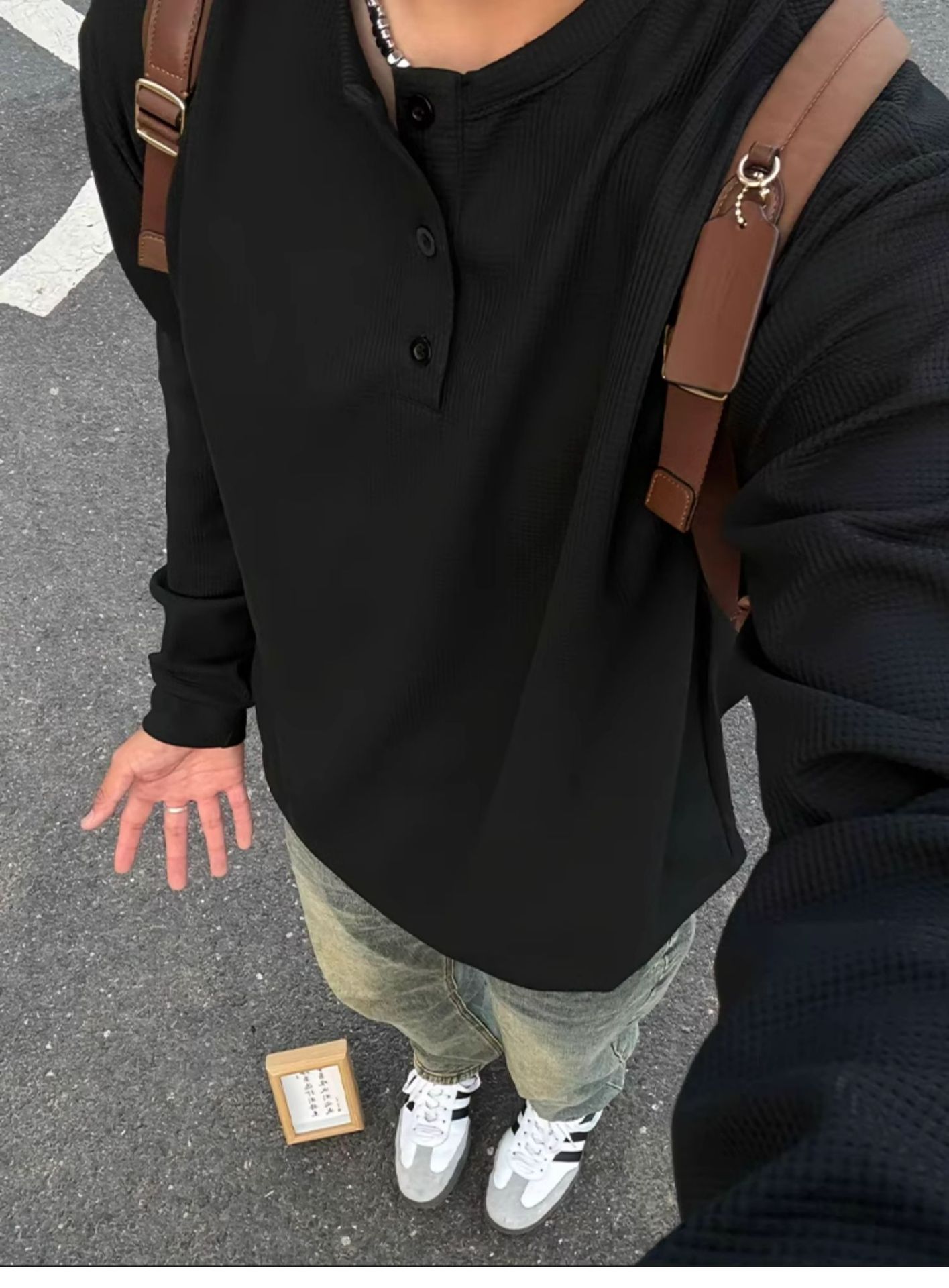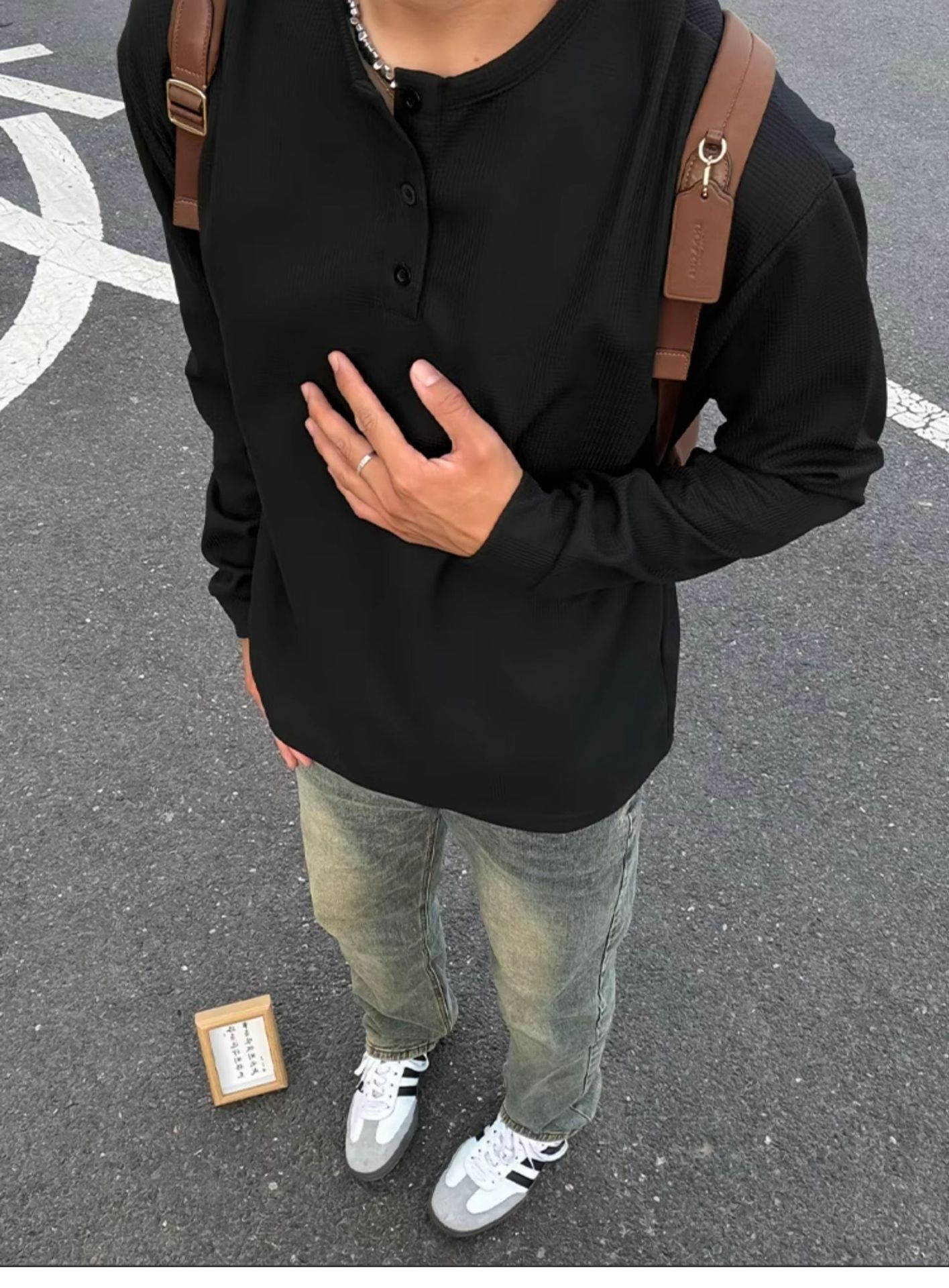 클린 핏 블랙 아메리칸 스타일 헨리 칼라 긴팔 티셔츠 남성 봄과 가을 와플 스웨터 틈새 내베이스 셔츠