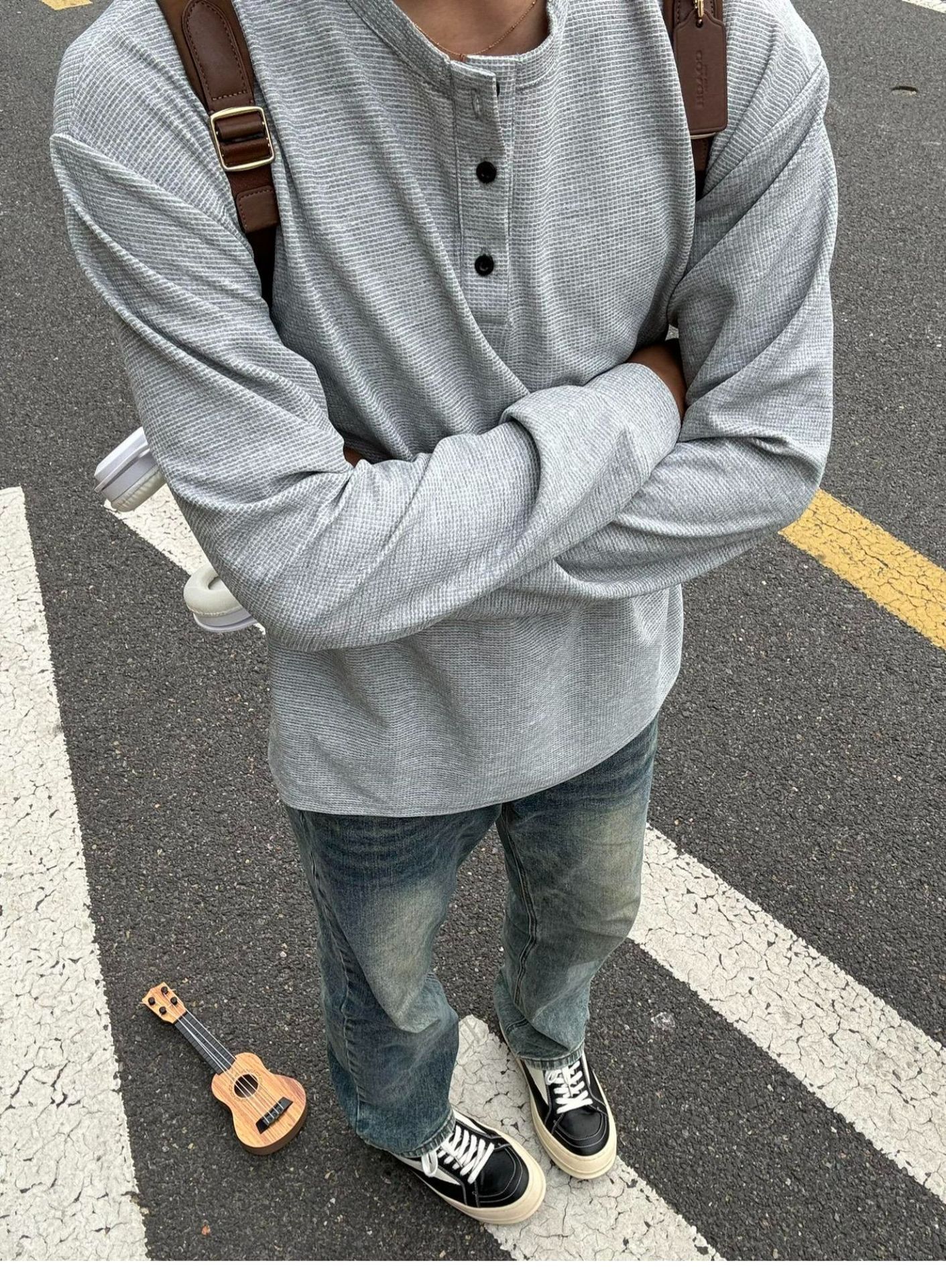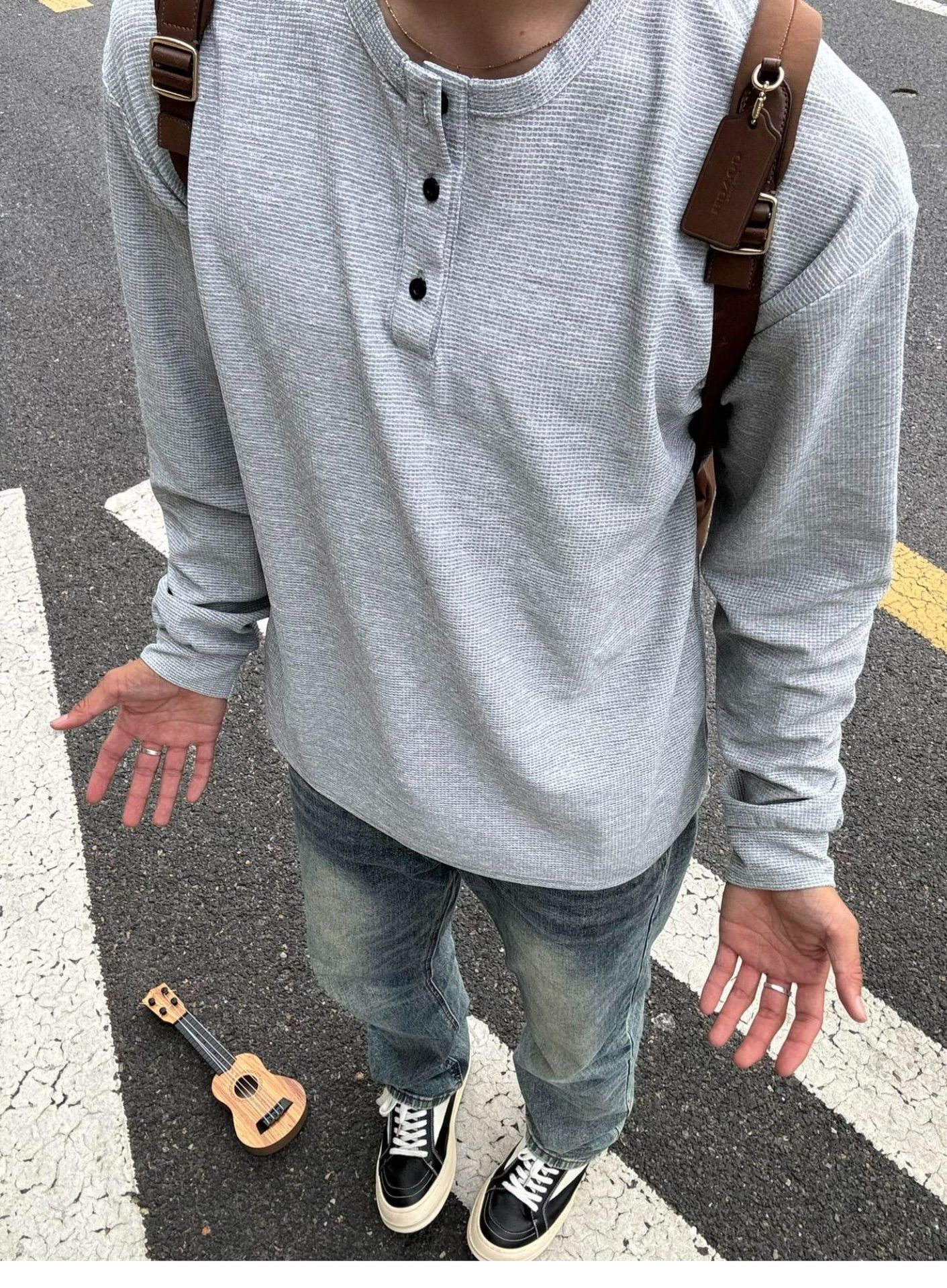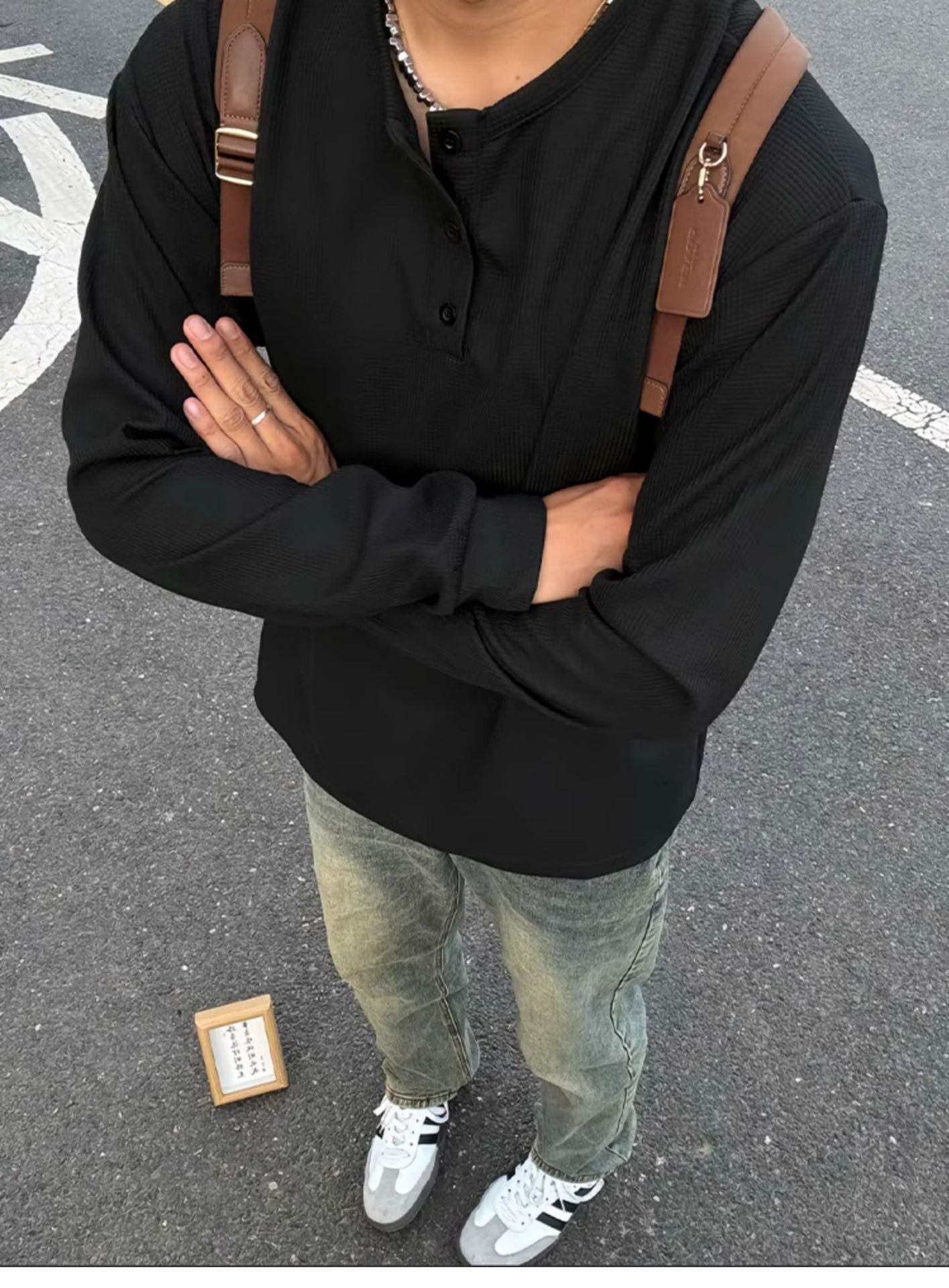 클린 핏 블랙 아메리칸 스타일 헨리 칼라 긴팔 티셔츠 남성 봄과 가을 와플 스웨터 틈새 내베이스 셔츠
