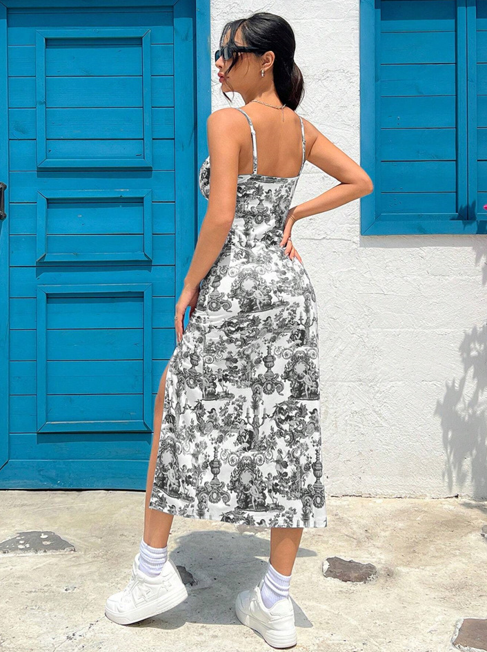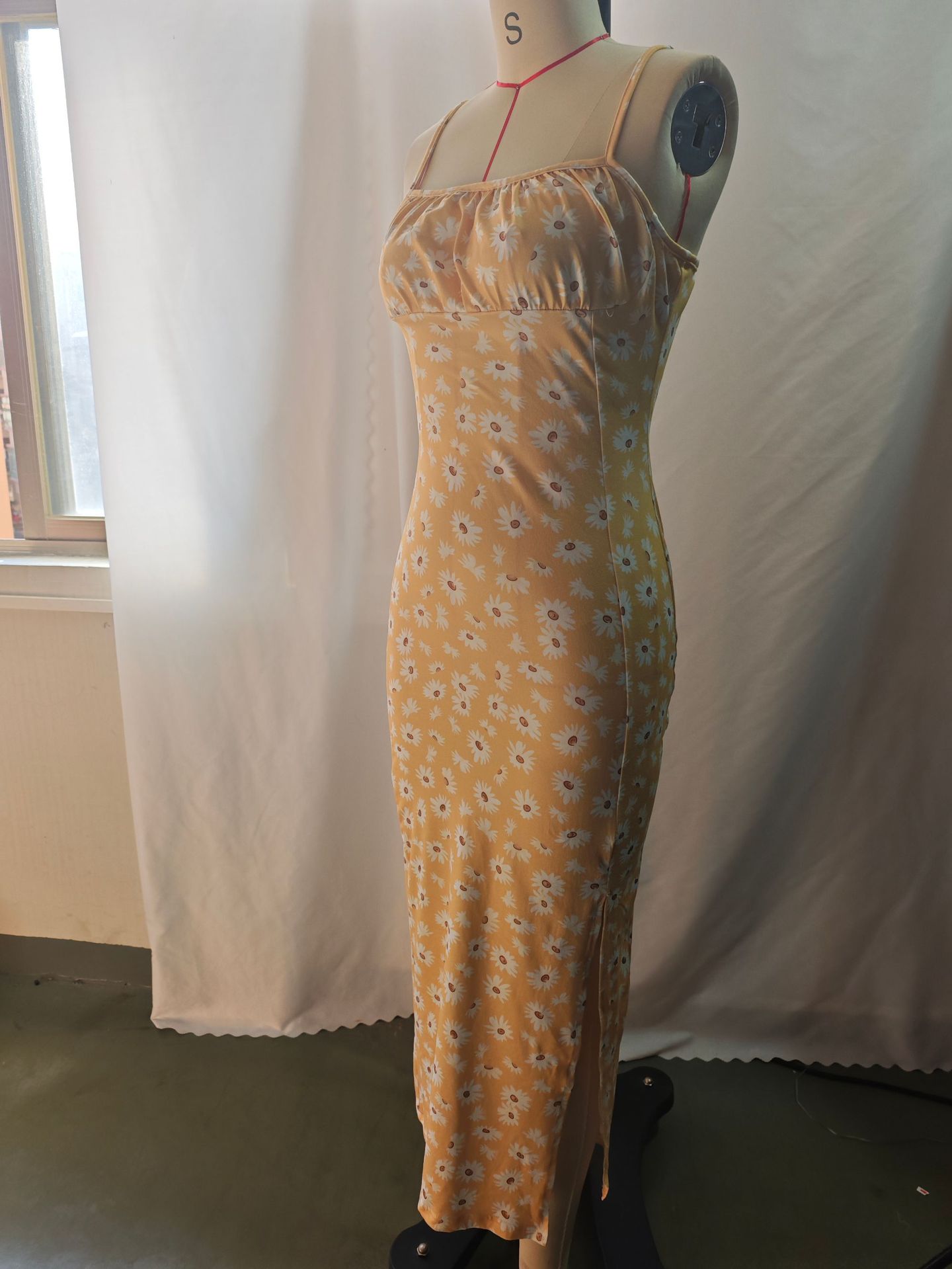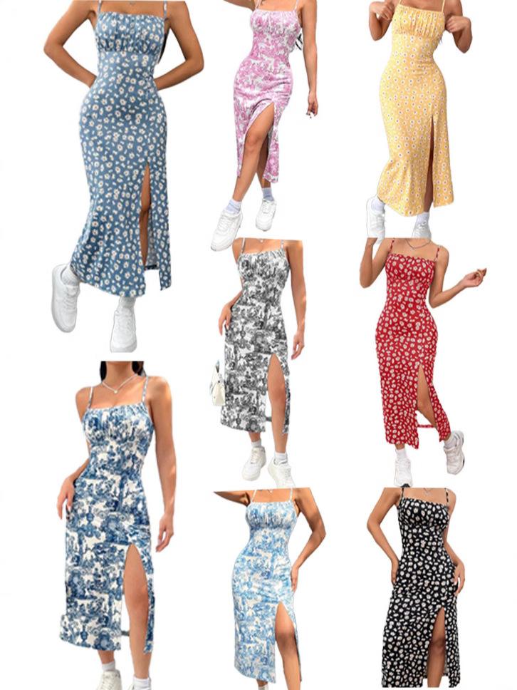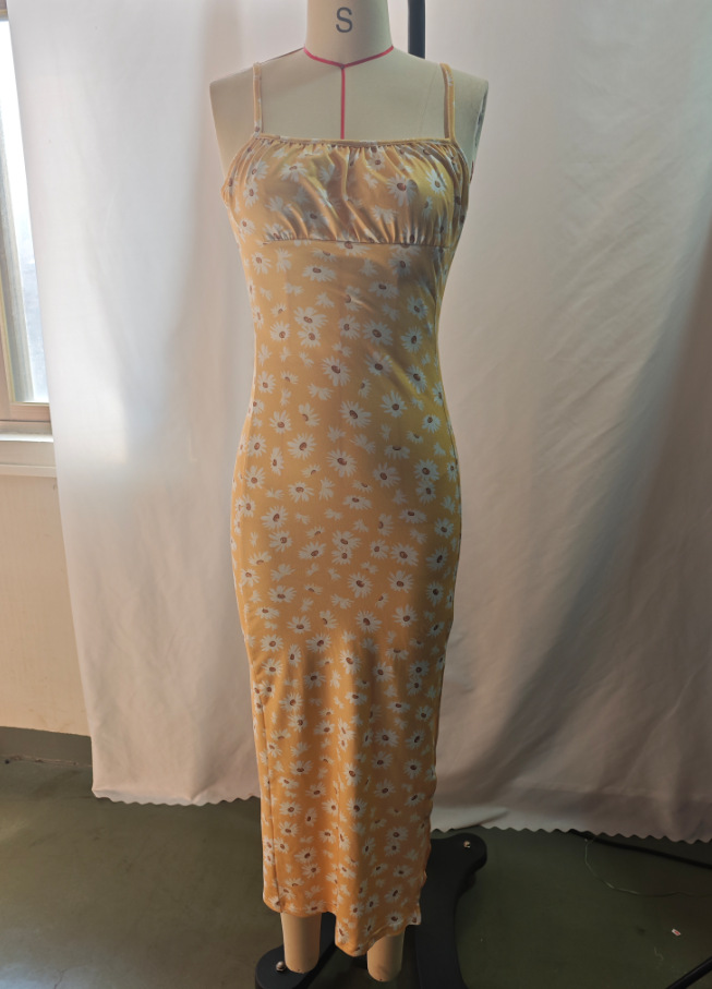 국경 간 25 년 폭발 가을 멜빵 포장 가슴 높은 슬릿 작은 데이지 레오파드 무늬 엉덩이 긴 원피스스토어 가기