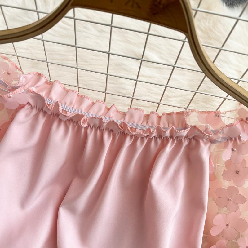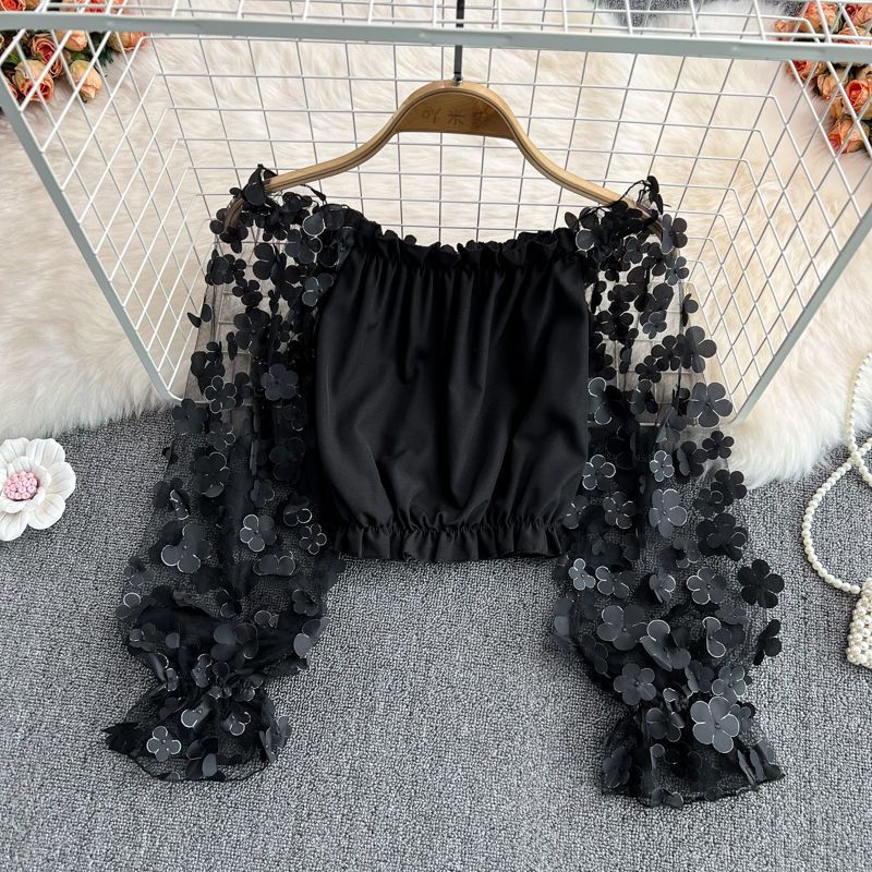 여성의 오프 숄더 3 차원 꽃 원점 메쉬 스티칭 쉬폰 셔츠 느슨한 허리 서양식 짧은 어깨 탑 여름스토어 가기