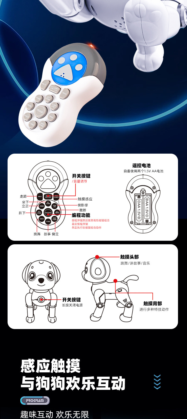 국경 원격 제어 지능형 프로그래밍 로봇 개는 유도 노래와 춤 전기 동반자 애완 동물 어린이 장난감을 터치 할 수 있습니다스토어 가기