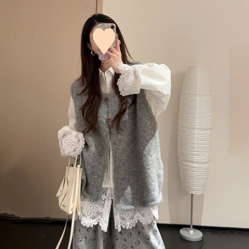 이른 봄 한국 스타일 달콤한 대학 스타일 그레이 니트 조끼 카디건 여성 화이트 할로우 셔츠 투피스 세트