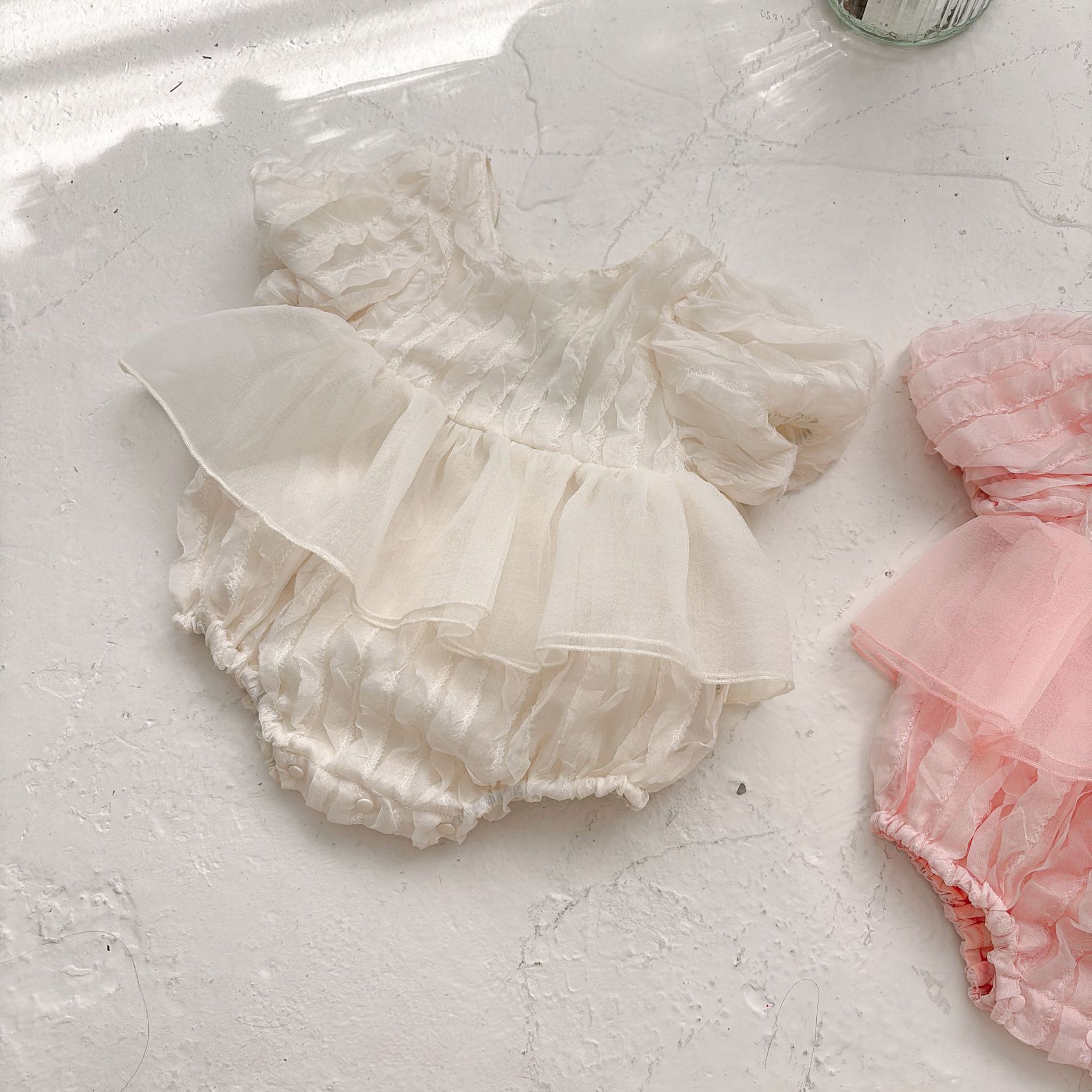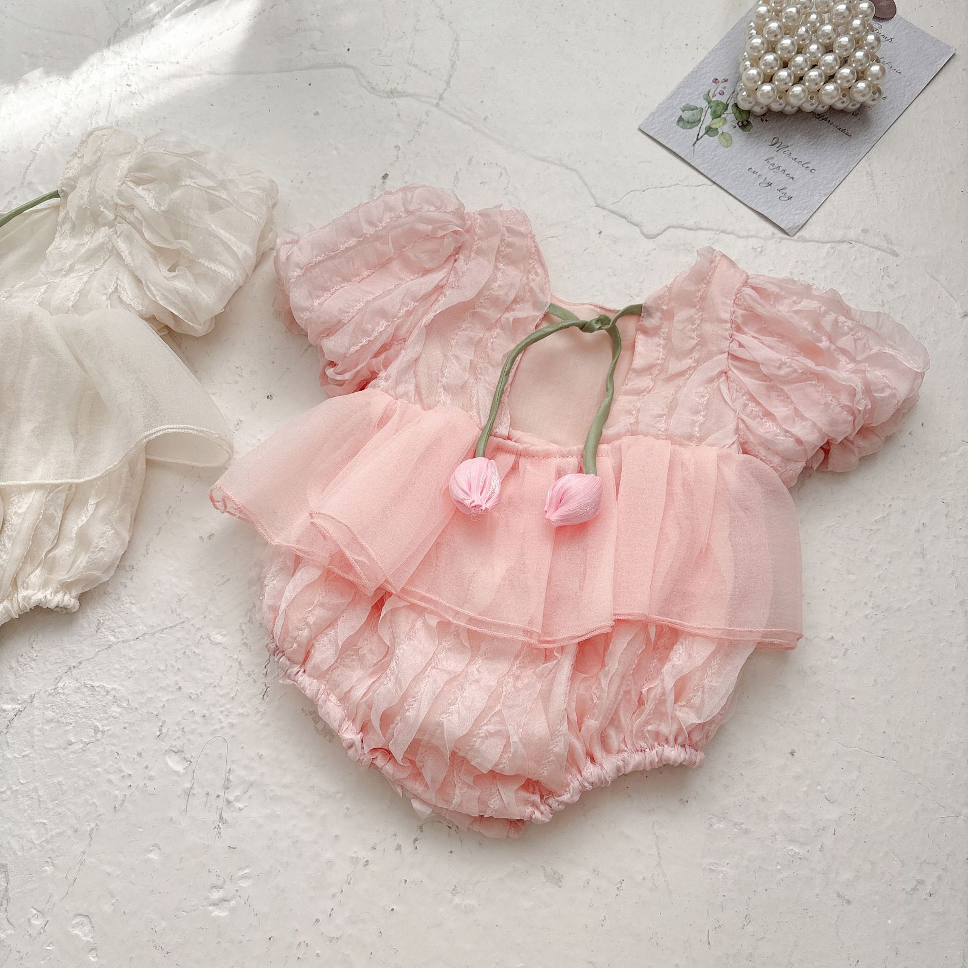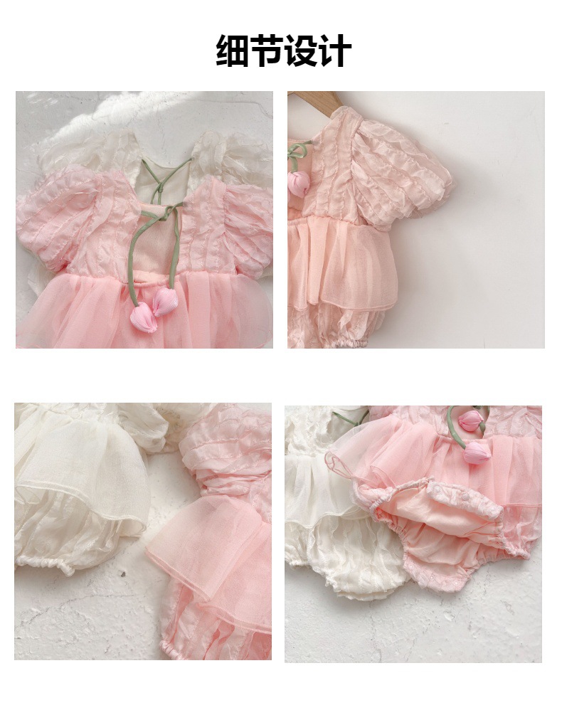 여름 새로운 아기 소녀 달콤한 퍼프 소매 반팔 점프 수트 아기 스타일러스 튤립 백리스 보름달 옷