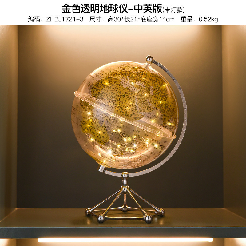 • 황금색 투명 지구본 - 중국어 및 영어 버전(조명 포함)