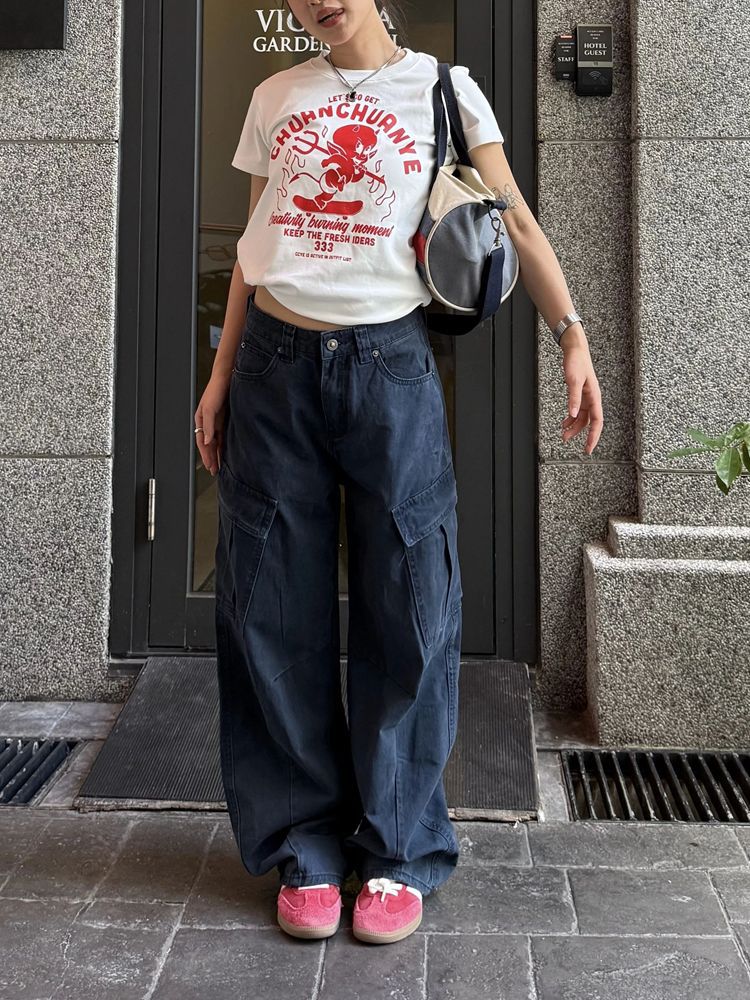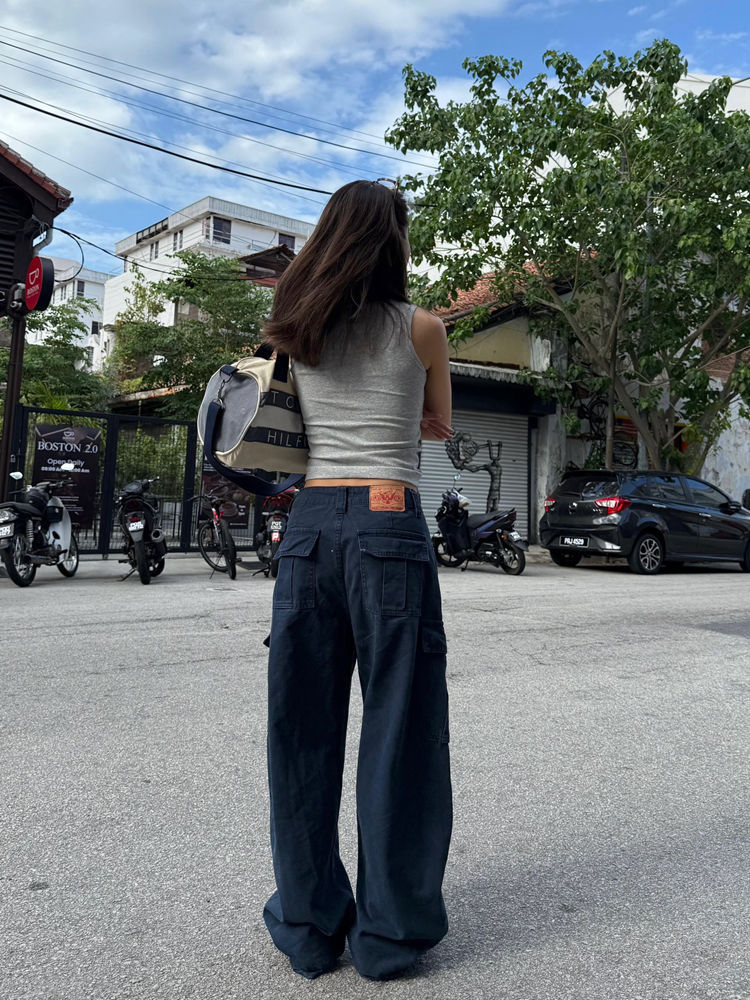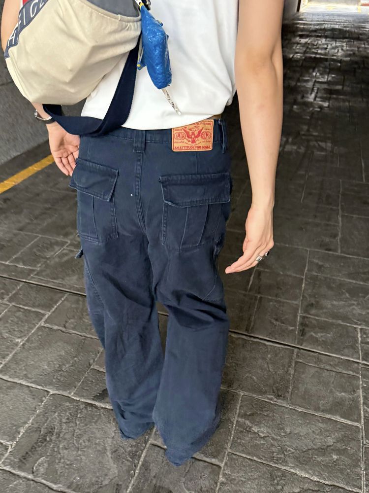 아메리칸 스타일 레트로 멀티 포켓 툴링 청바지 여성의 봄과 가을 하이 스트리트 디자인 센스 스트레이트 루즈 슬리밍 와이드 레그 바지스토어 가기