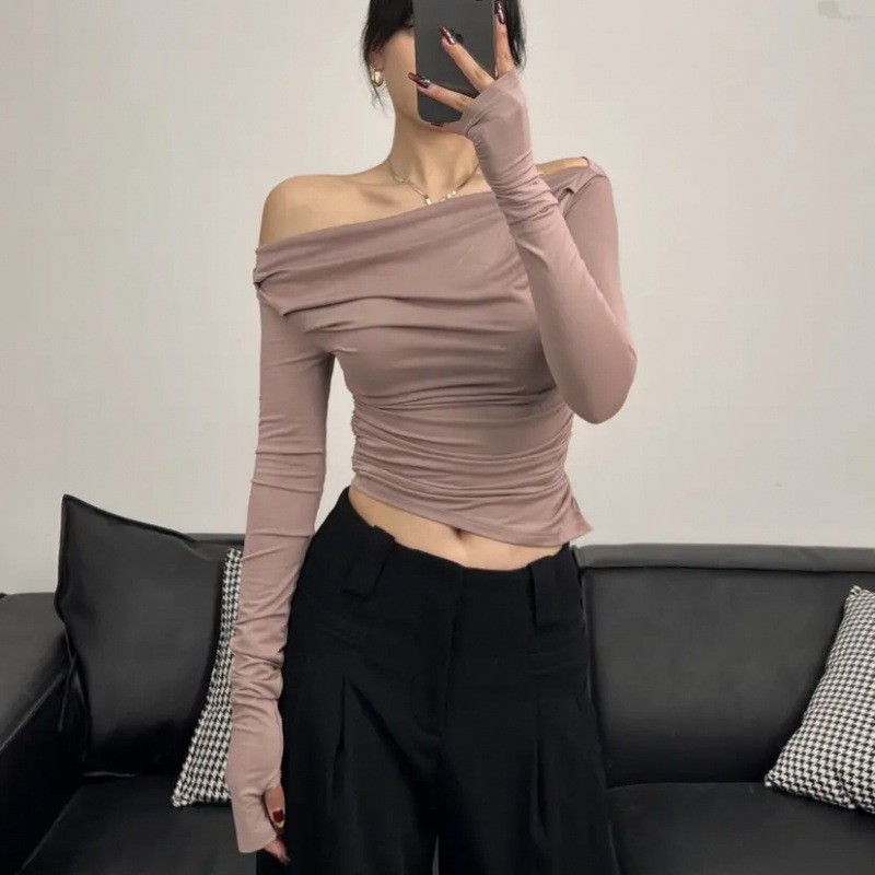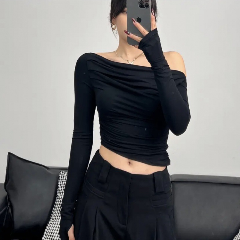 불규칙한 오프 숄더 긴팔 티셔츠 여성 오프 숄더 봄과 가을 디자인 틈새 유럽과 미국의 핫 걸 짧은 이너 탑스토어 가기
