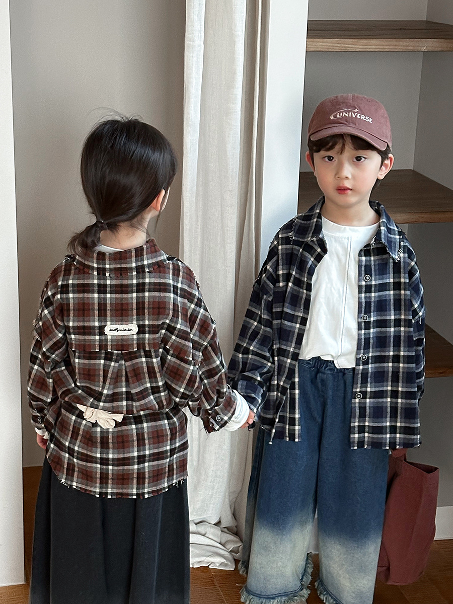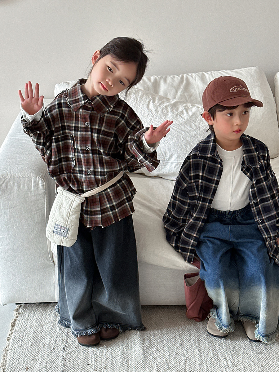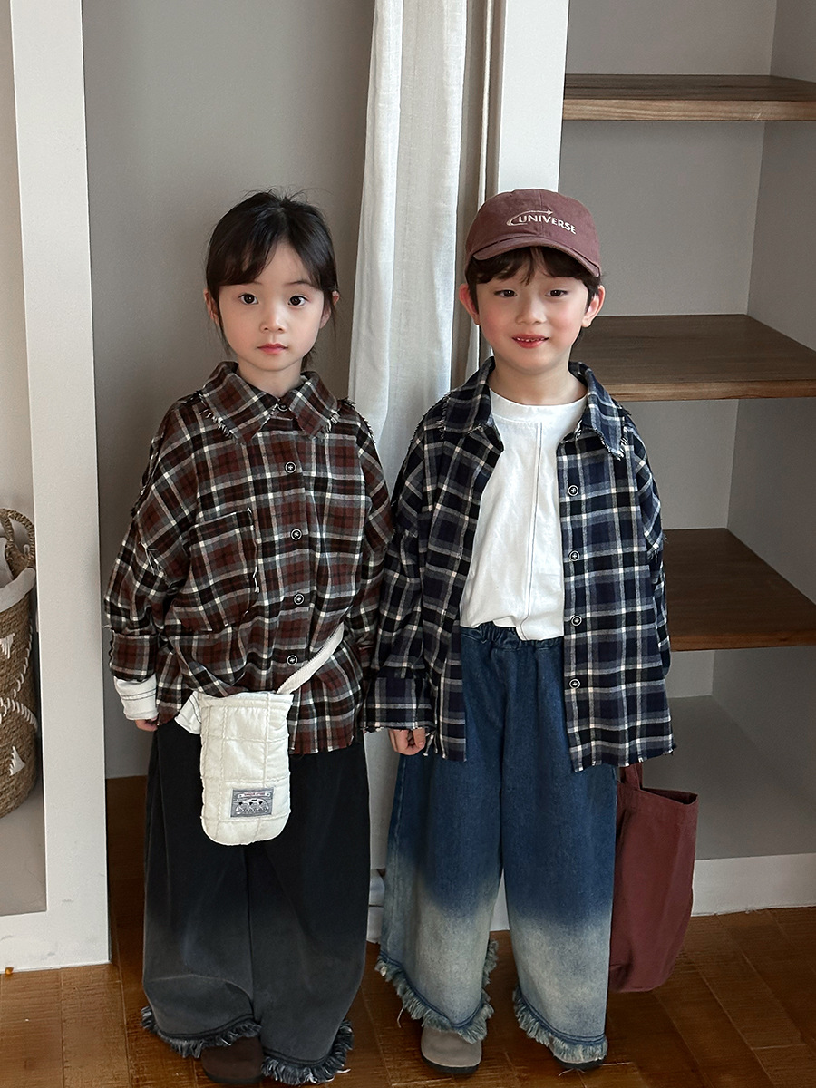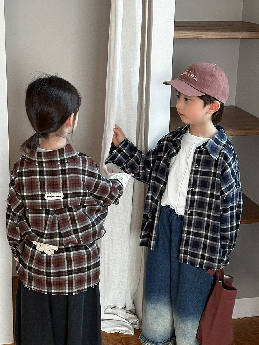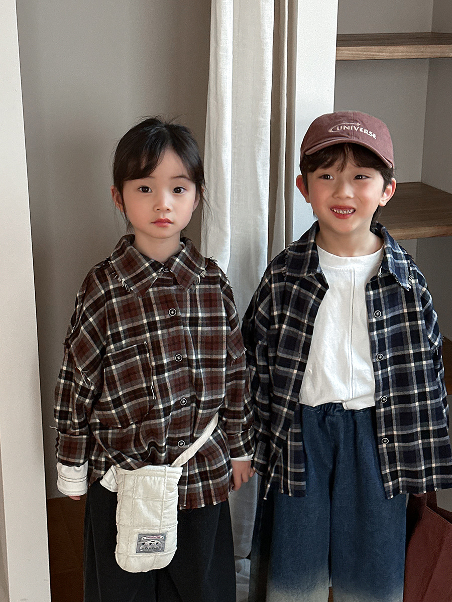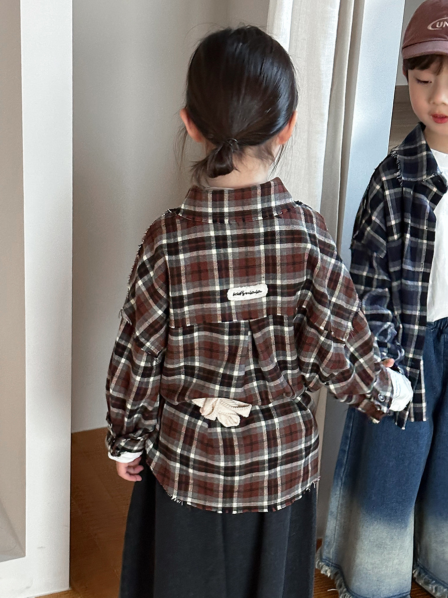 Jiaye 어린이 제품 2025 어린이 가을 새로운 격자 무늬 긴팔 셔츠 남성과 여성 베이비 포레스트 복고풍 모피 가장자리 재킷스토어 가기