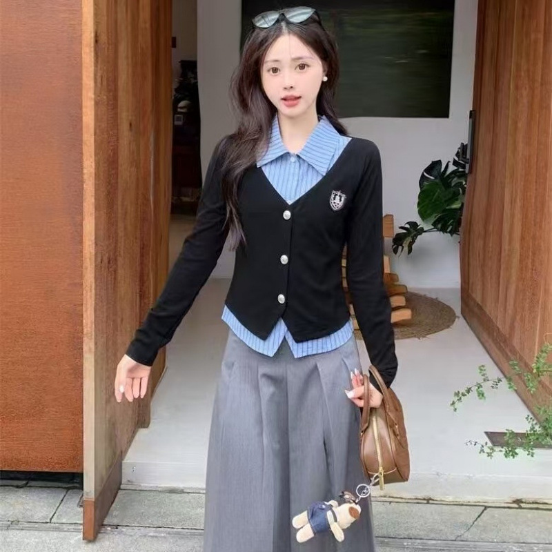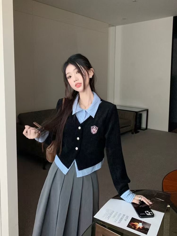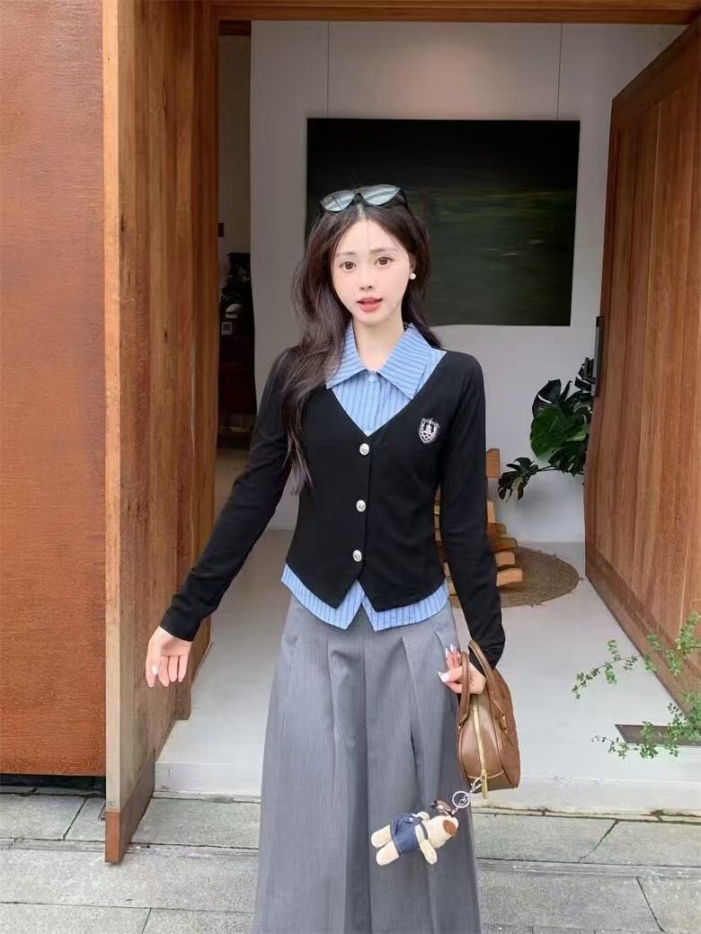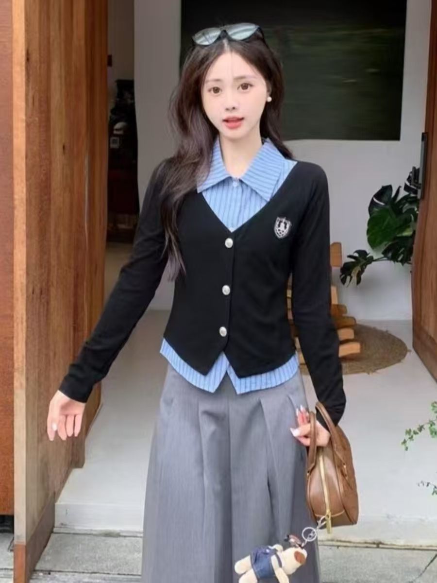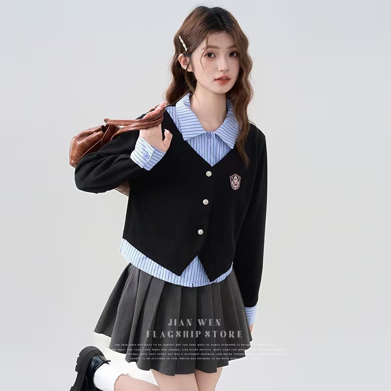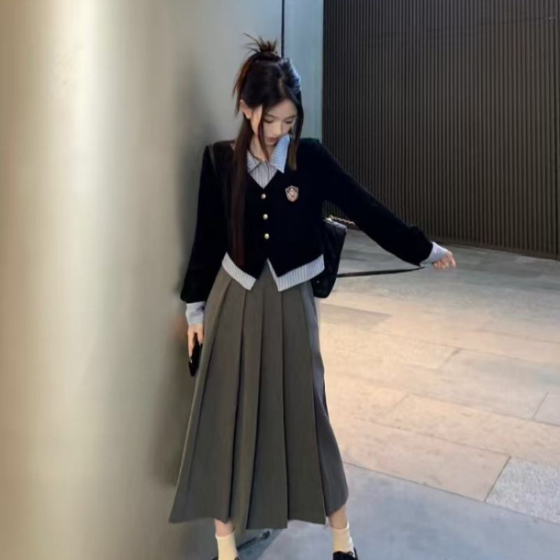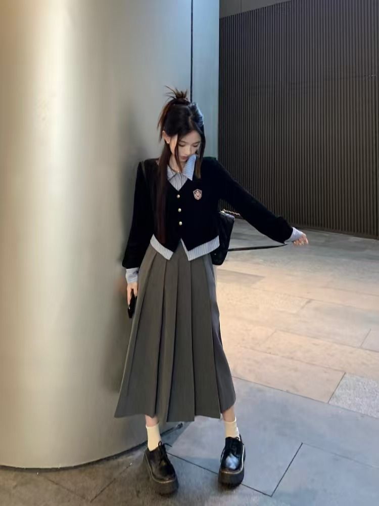 가짜 투피스 셔츠 탑 여성 가을과 겨울 2025 새로운 회색 스커트 학업 스타일 세트 스커트스토어 가기