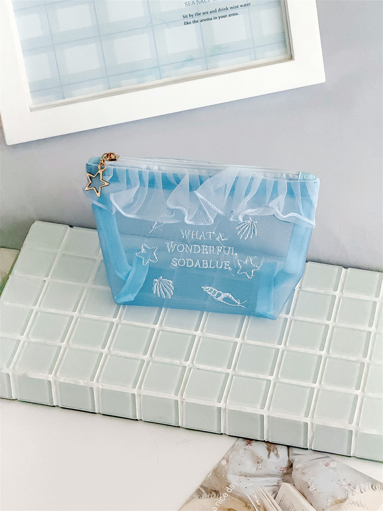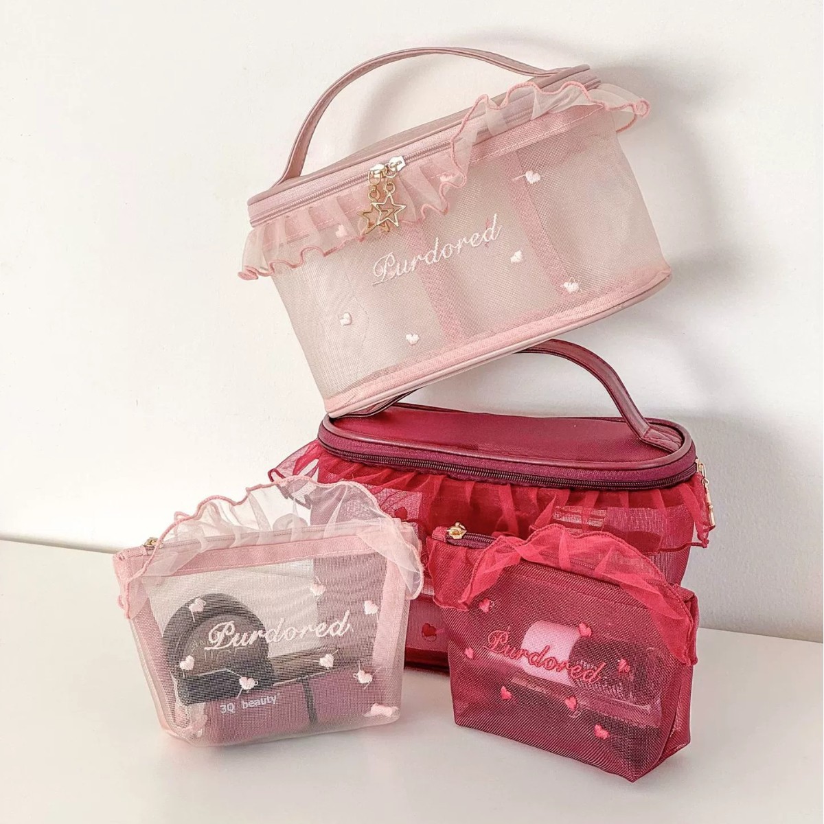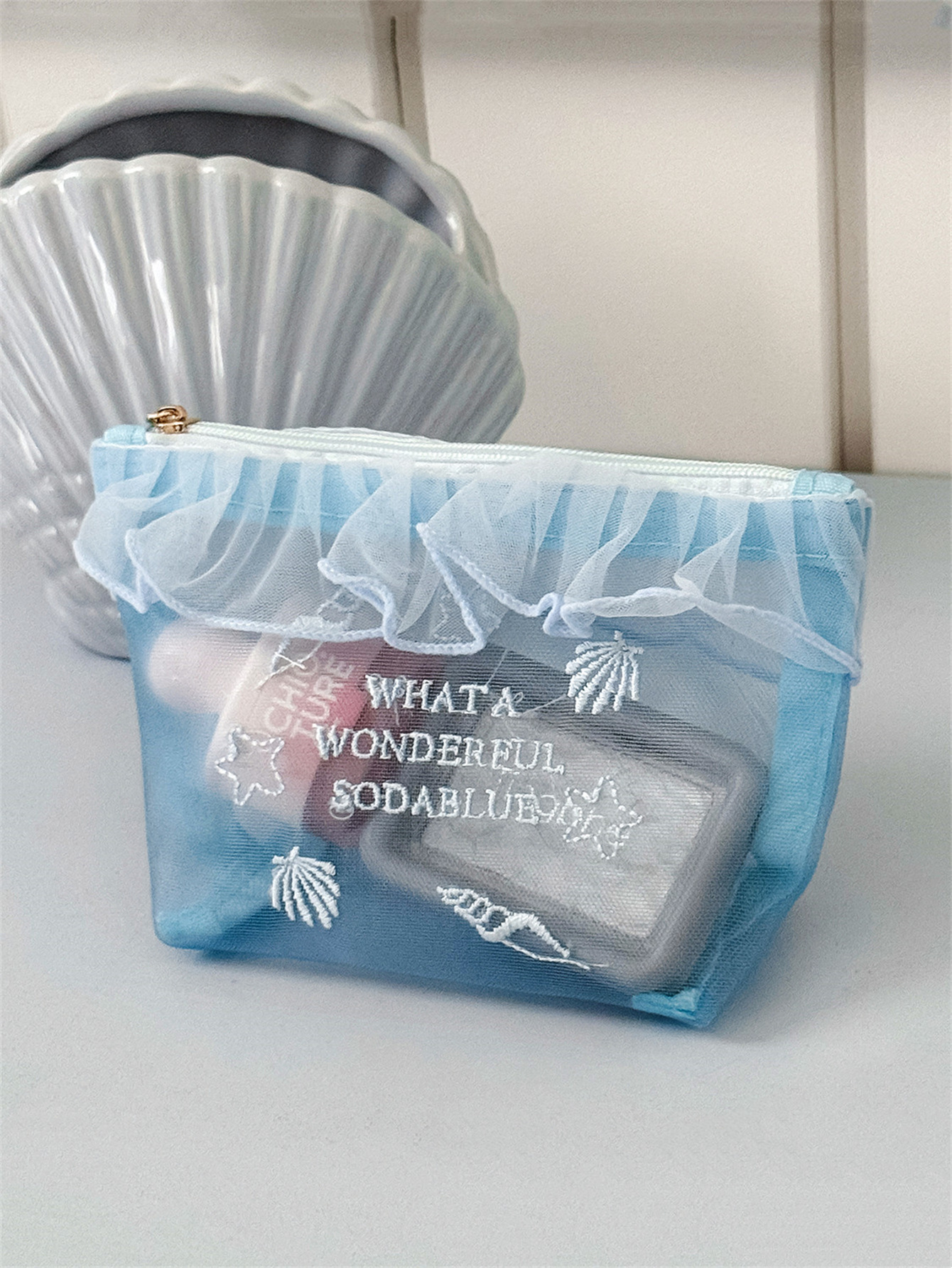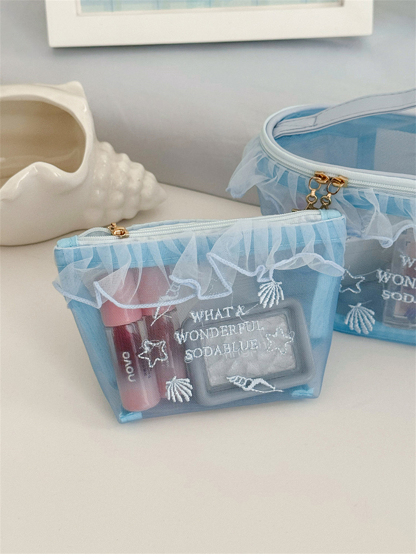 荷叶边透气网纱包高颜值学生便携口红小样收纳包