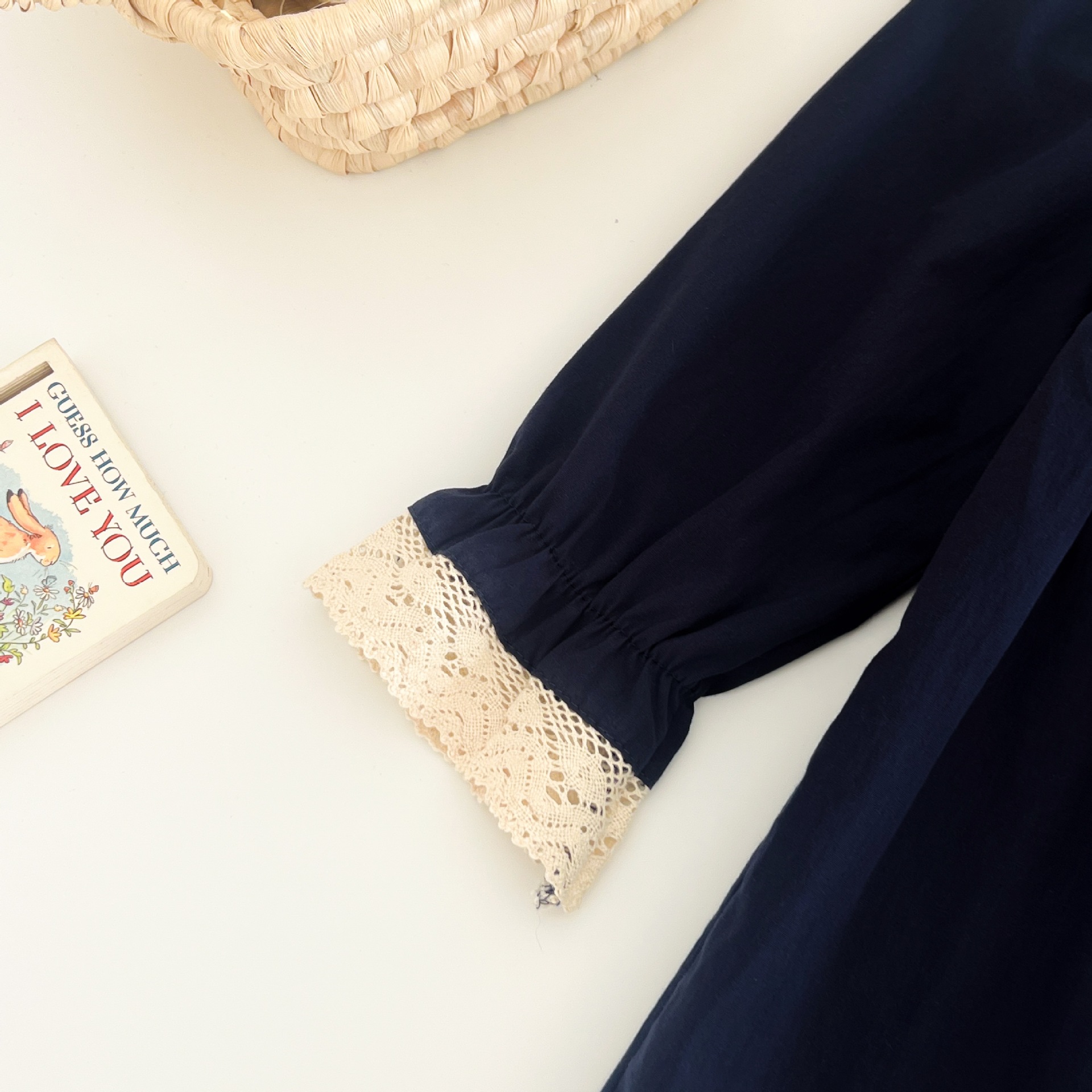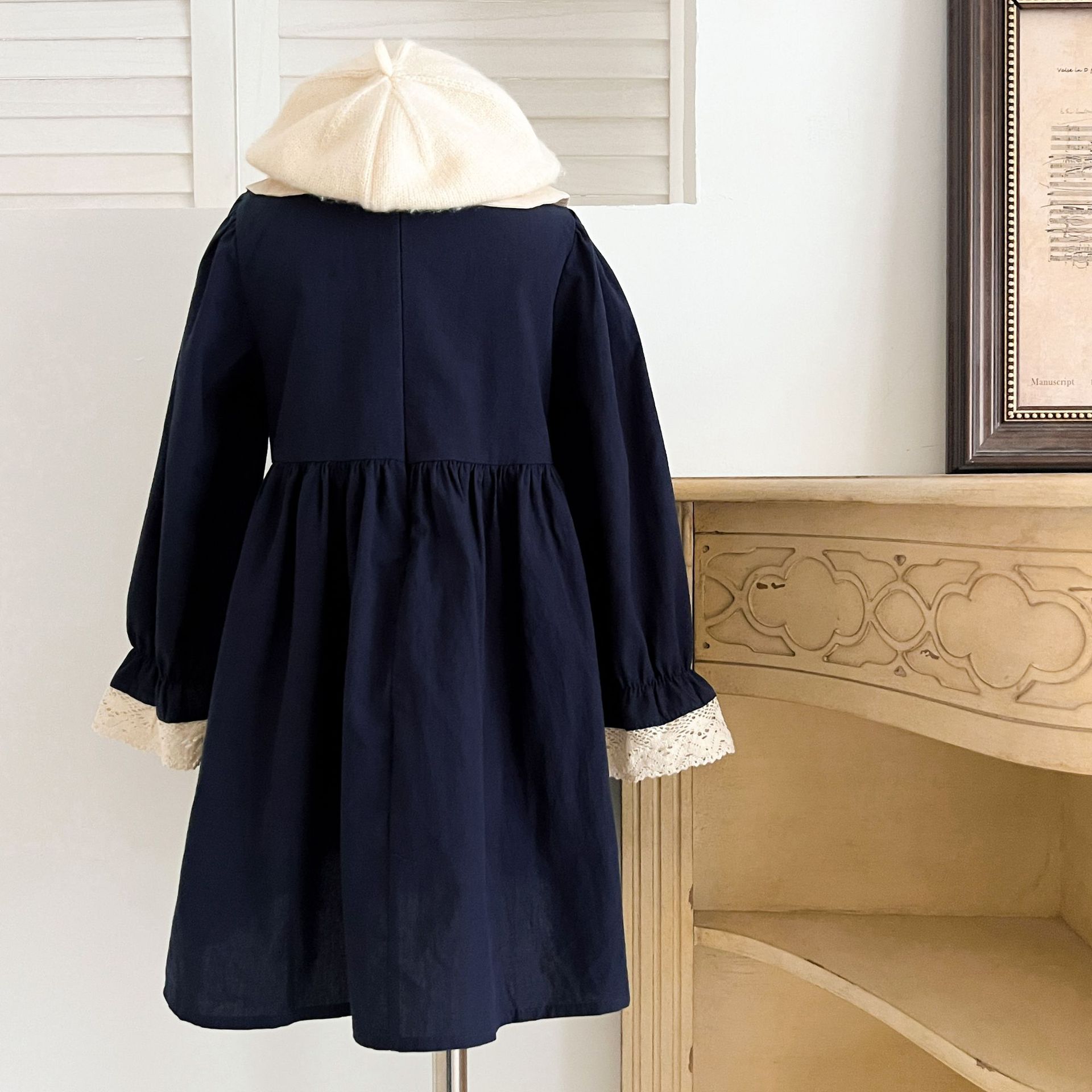 소녀의 인형 목걸이 토끼 원피스 봄 가을 한국 스타일 긴 소매 네이비 옷깃 공주 원피스 세련된 패션