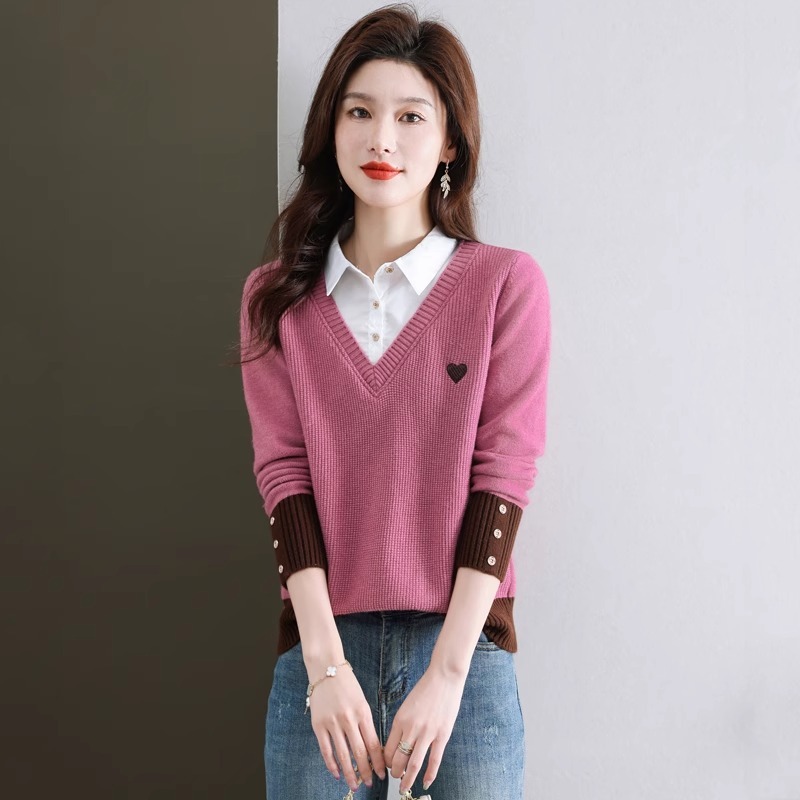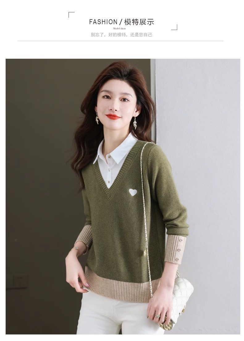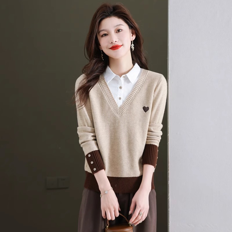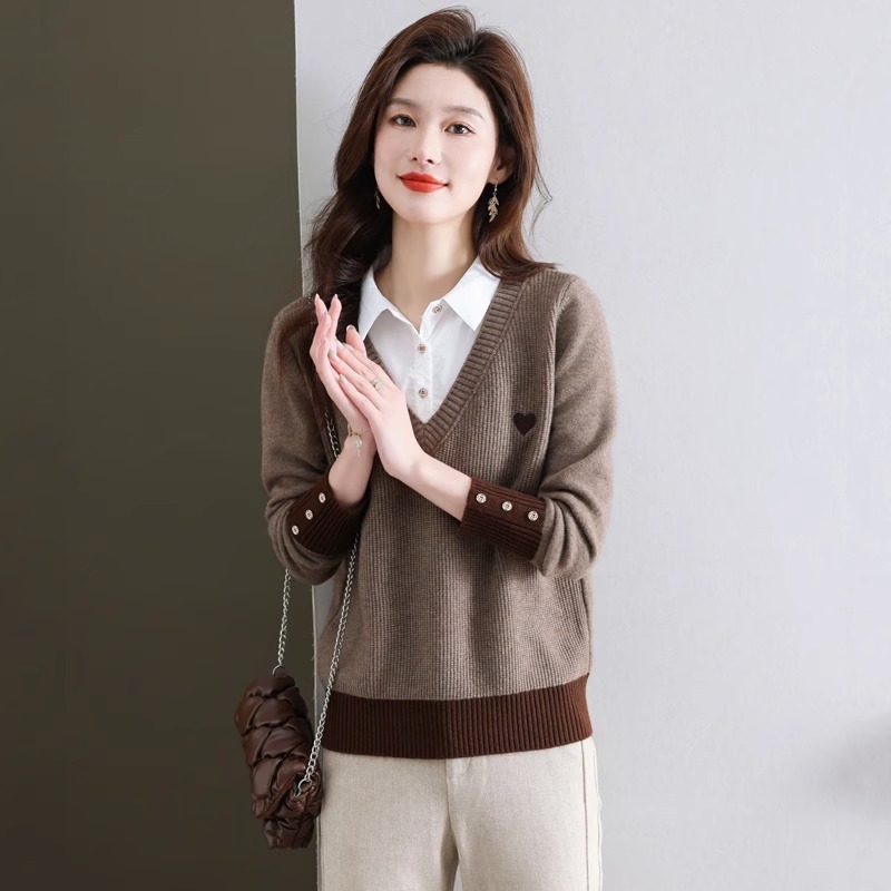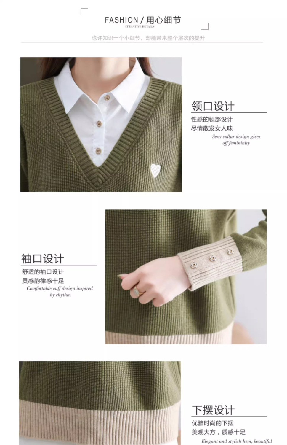 셔츠 칼라 가짜 투피스 스웨터 여성의 봄 2025 새로운 두꺼운 터틀넥 폭발 스타일 니트 베이스 셔츠 탑스토어 가기