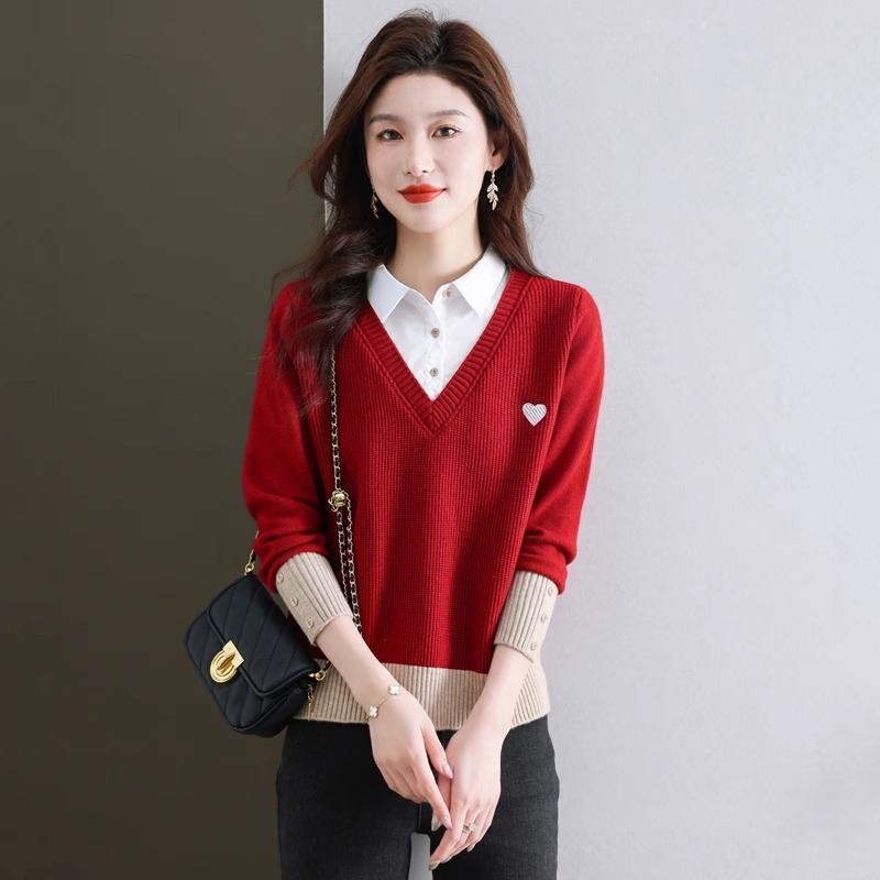 셔츠 칼라 가짜 투피스 스웨터 여성의 봄 2025 새로운 두꺼운 터틀넥 폭발 스타일 니트 베이스 셔츠 탑