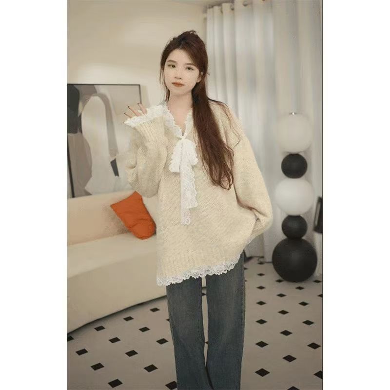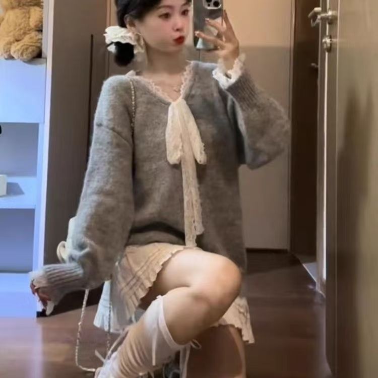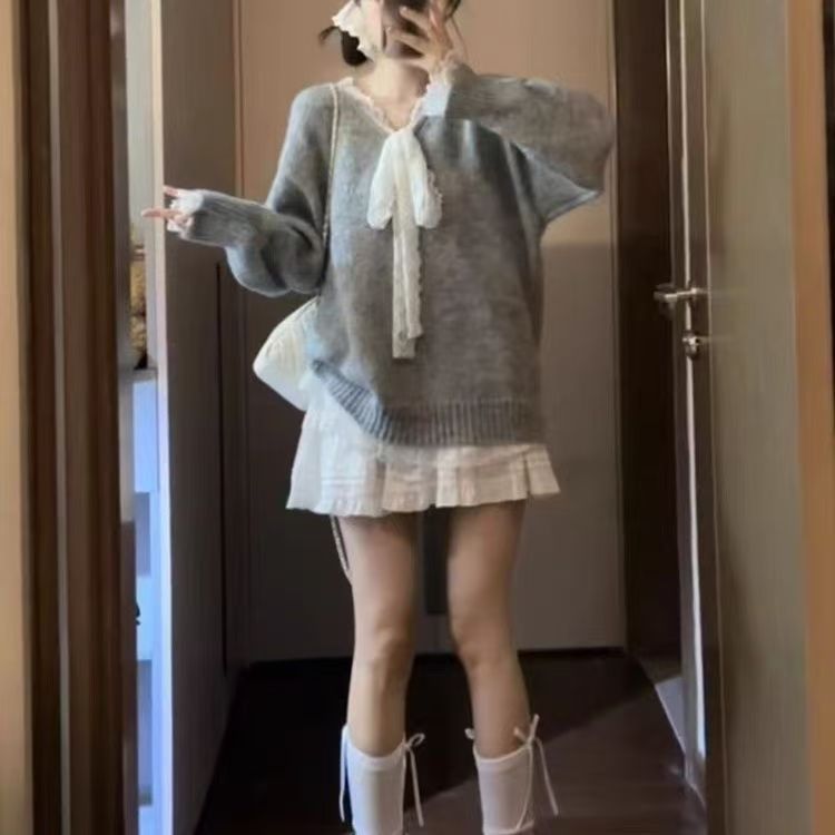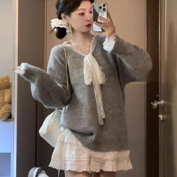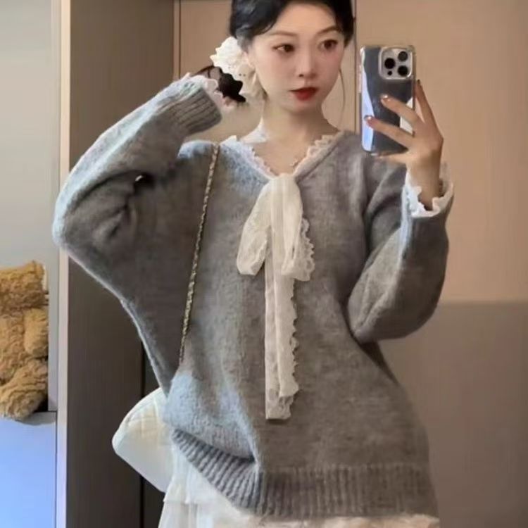 회색 레이스 활 바느질 느슨한 긴 소매 스웨터 가을 겨울 가을 게으른 2024스토어 가기