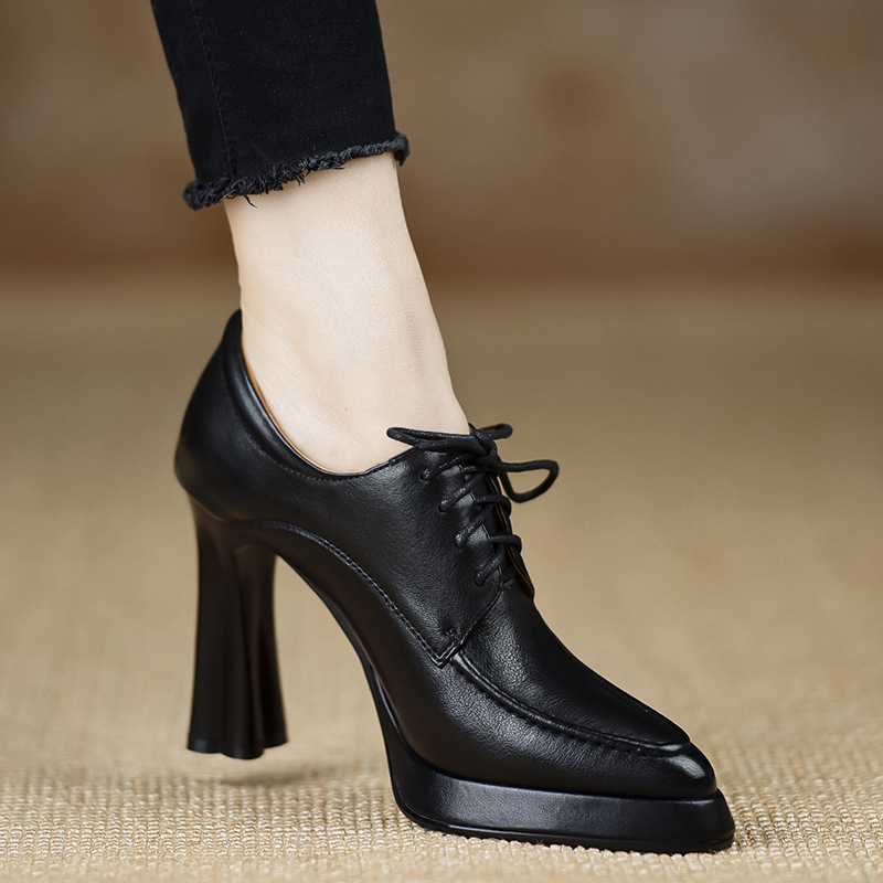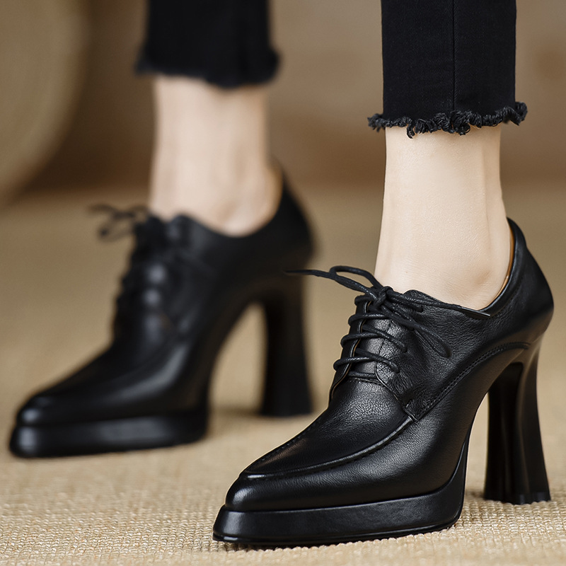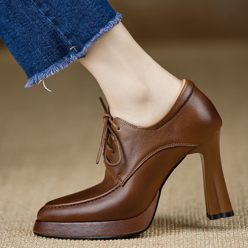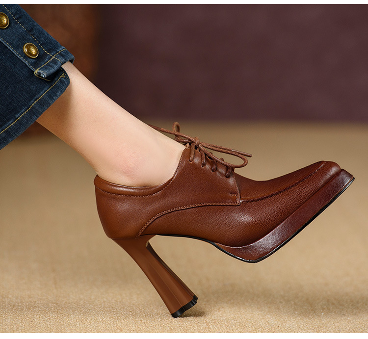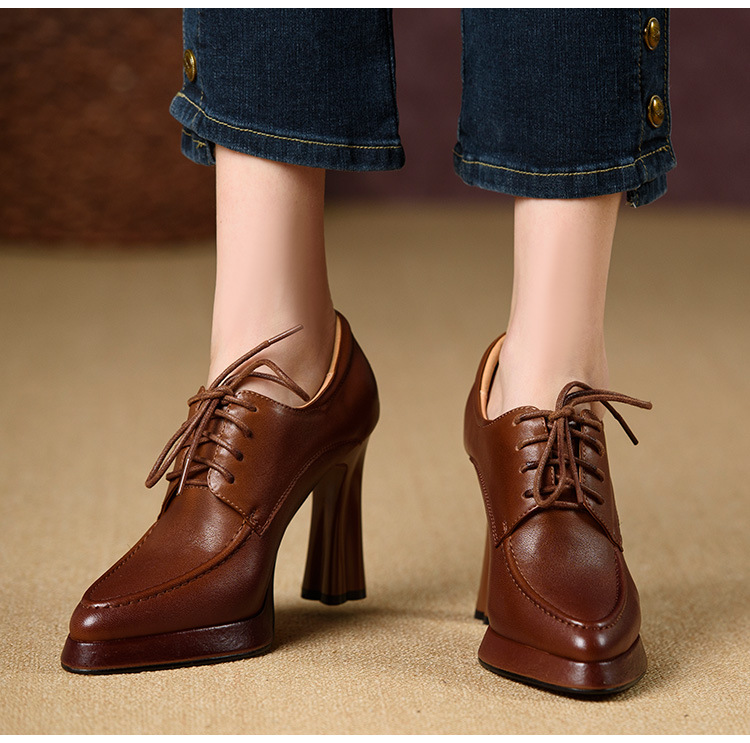 여성용 스퀘어 헤드 플랫폼 두꺼운 밑창 싱글 레이어 신발 피곤하지 않은 피트 가죽 하이힐 여성 두꺼운 힐 신발 레이스 업 가죽 신발스토어 가기