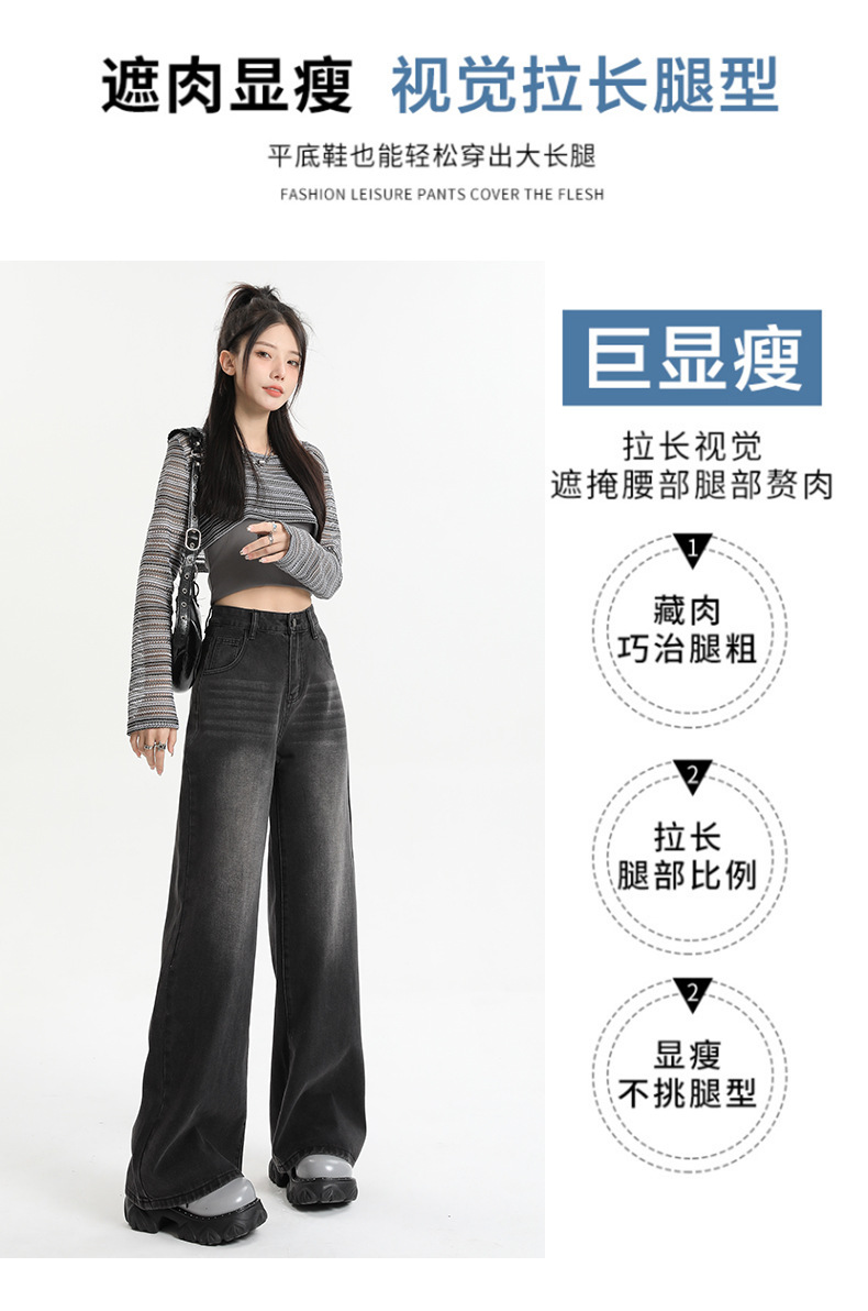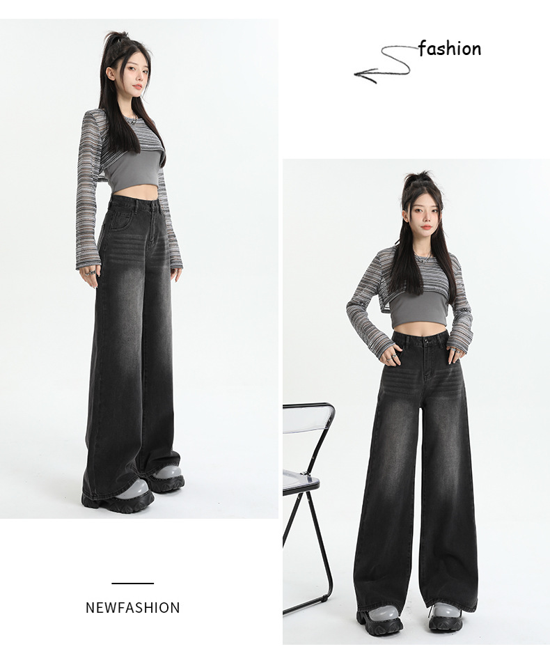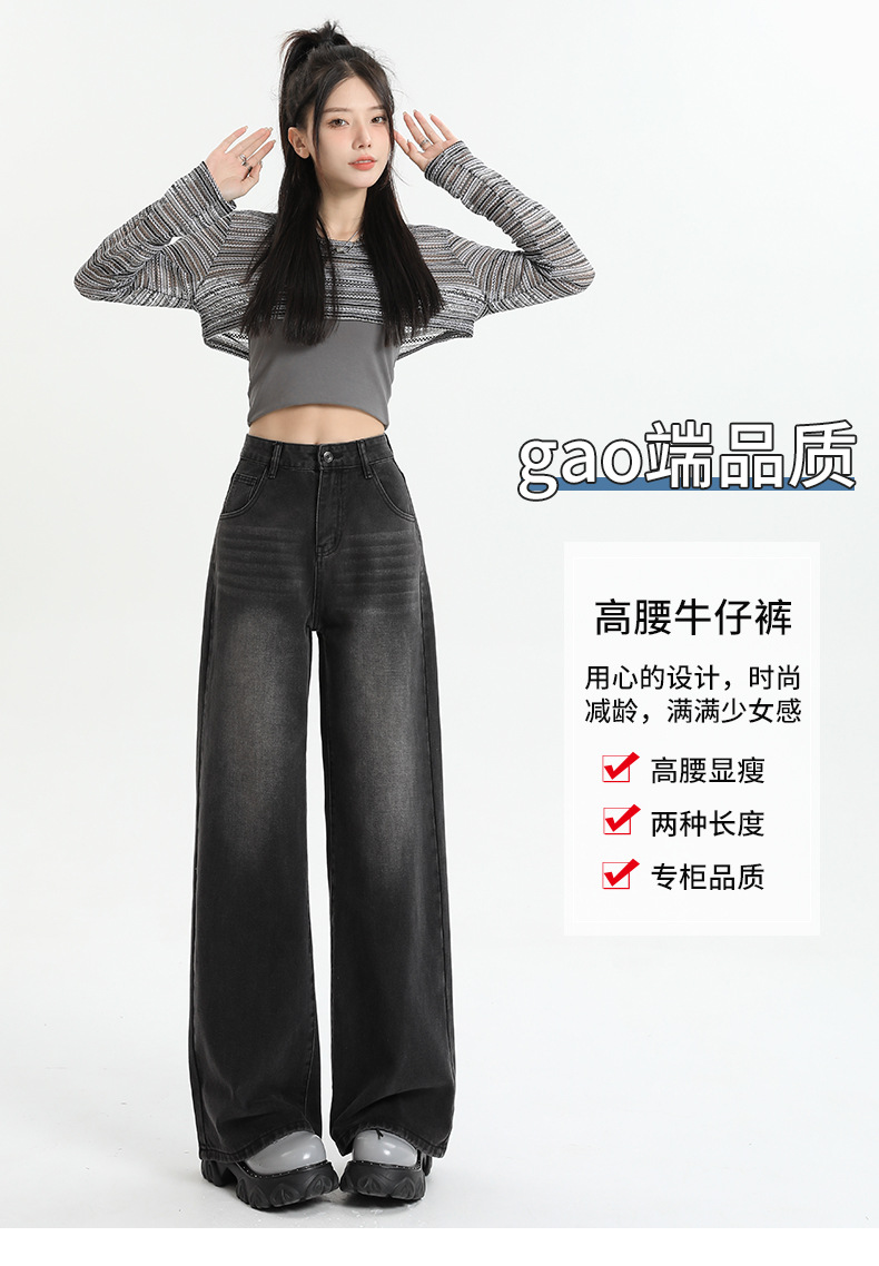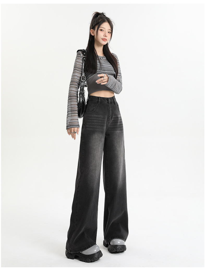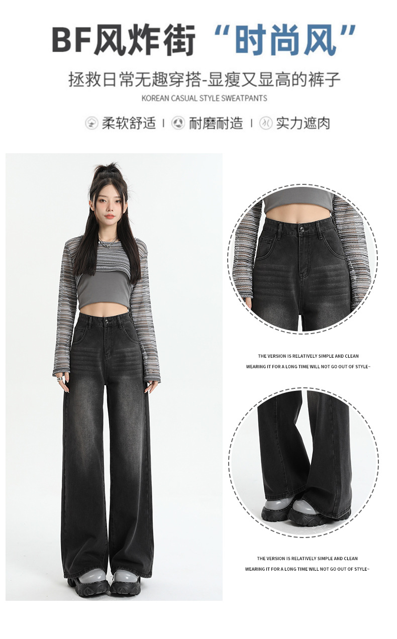 아메리칸 스타일 하이 웨이스트 블랙 그레이 스트레이트 세탁 청바지 여성용 루즈 슬리밍 올 매치 트렌디 와이드 레그 트렌디 한 바지스토어 가기