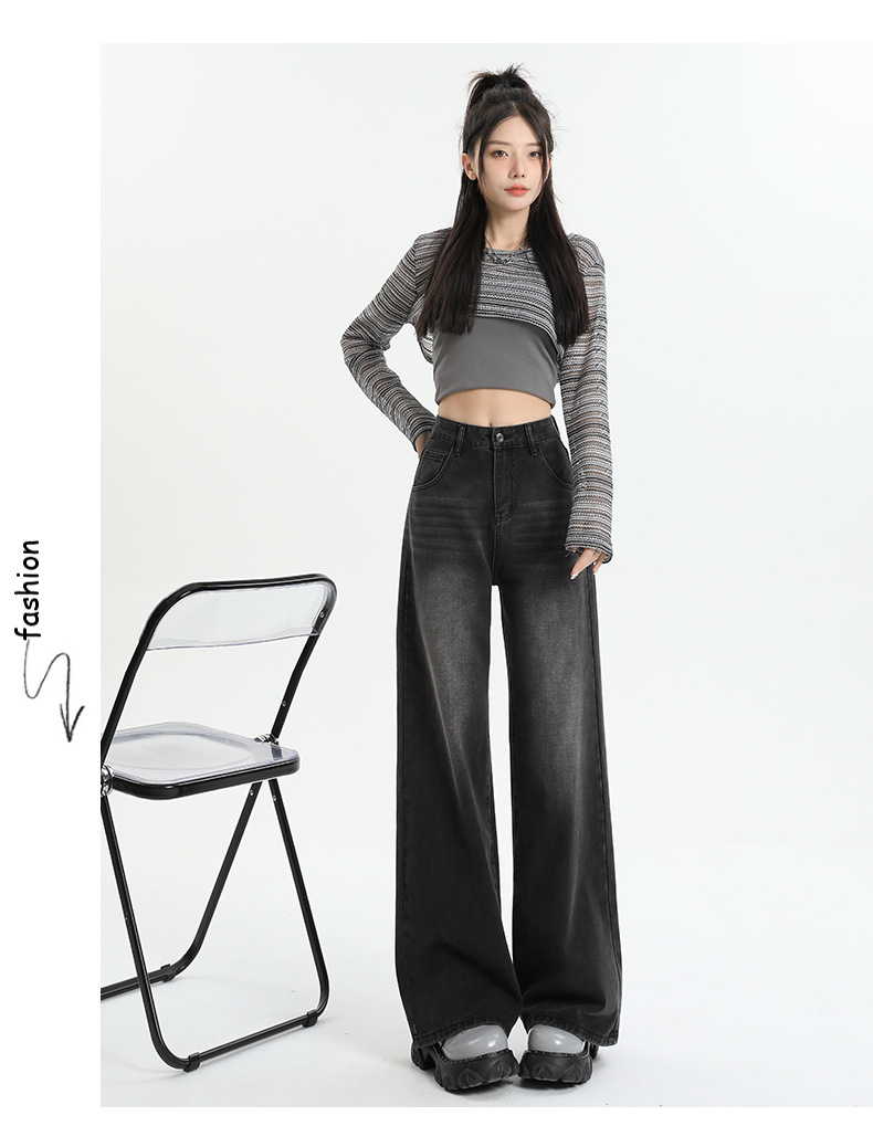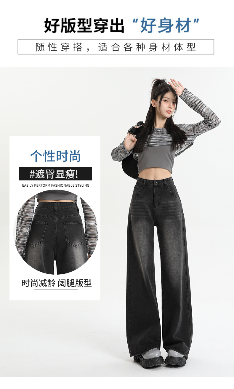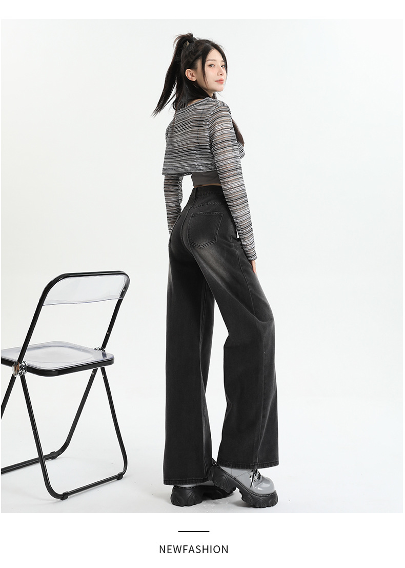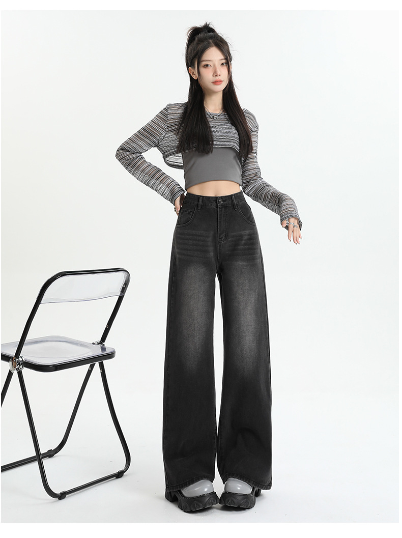 아메리칸 스타일 하이 웨이스트 블랙 그레이 스트레이트 세탁 청바지 여성용 루즈 슬리밍 올 매치 트렌디 와이드 레그 트렌디 한 바지스토어 가기