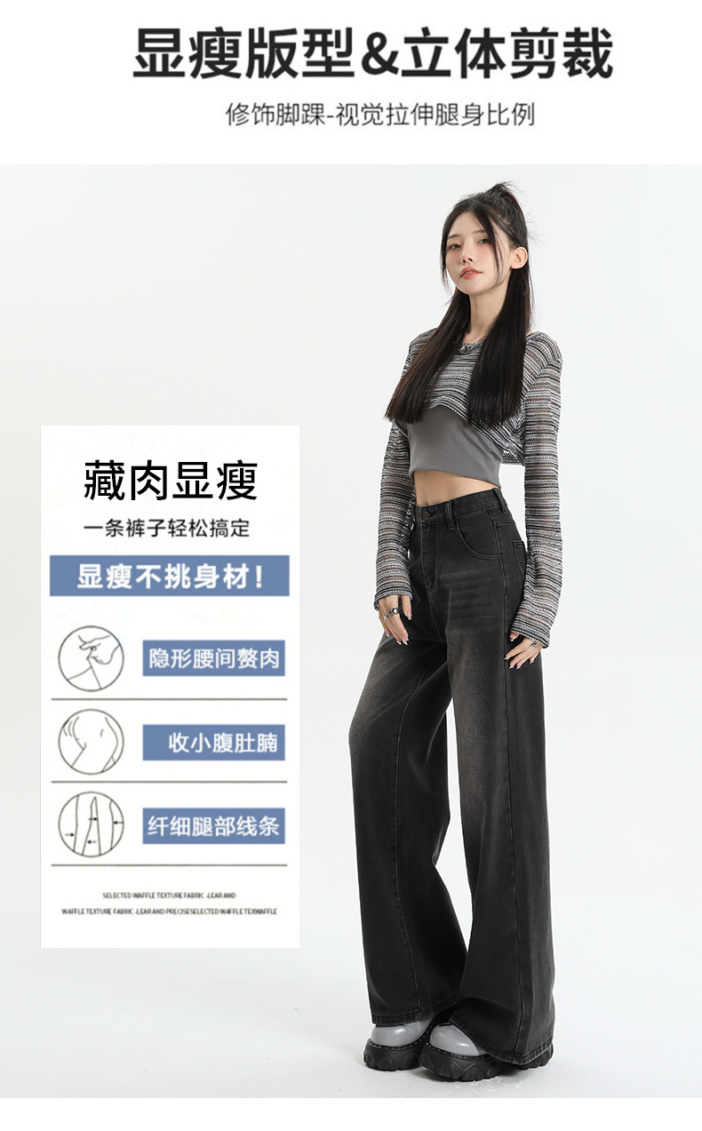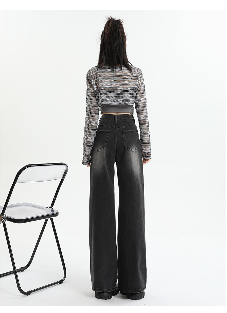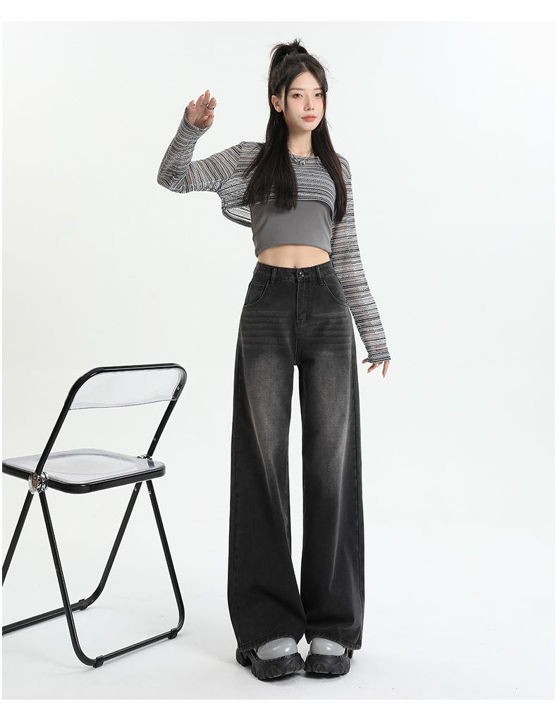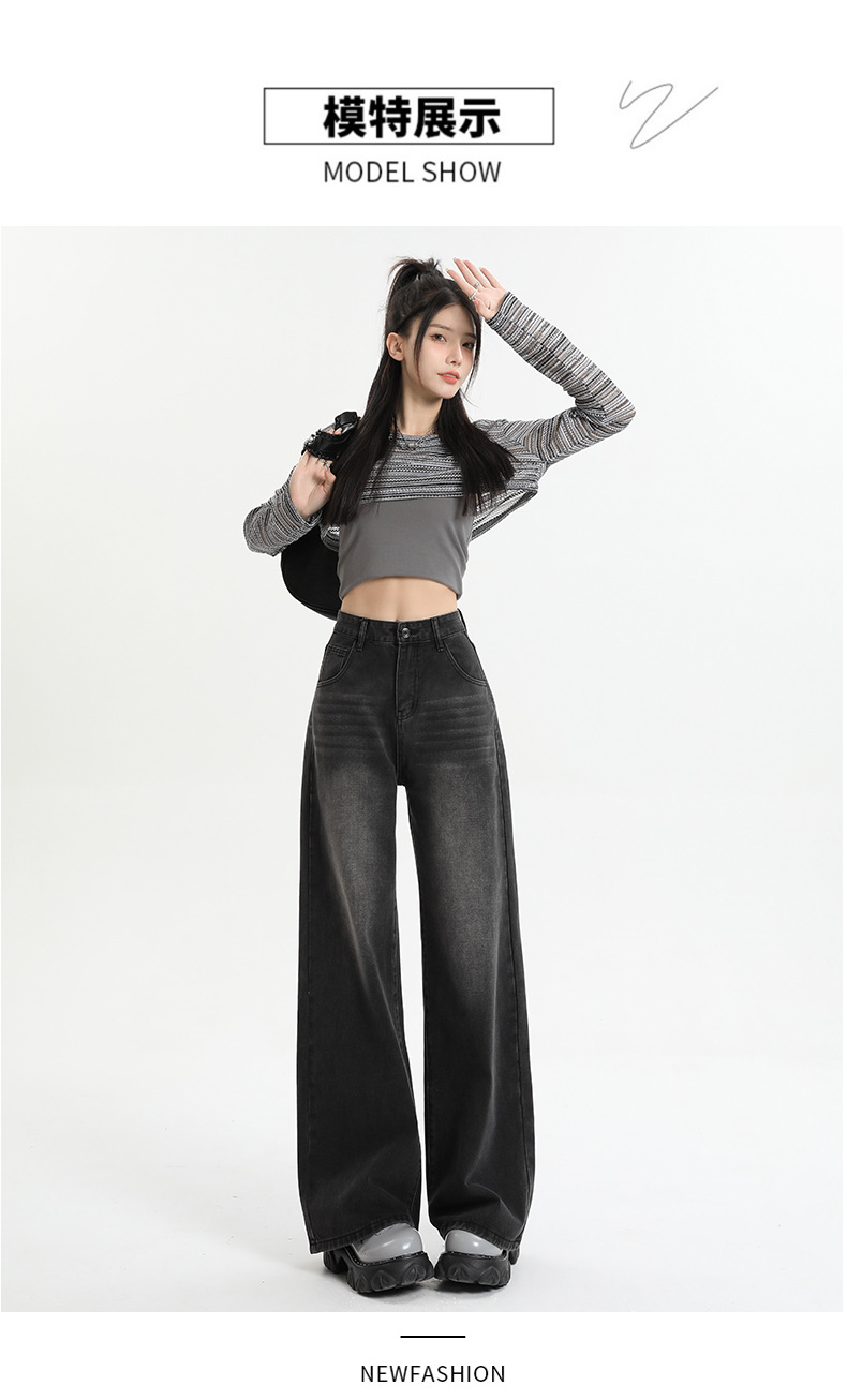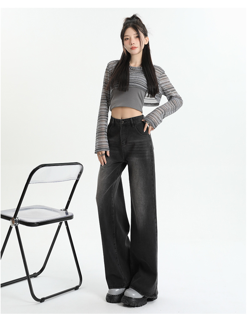 아메리칸 스타일 하이 웨이스트 블랙 그레이 스트레이트 세탁 청바지 여성용 루즈 슬리밍 올 매치 트렌디 와이드 레그 트렌디 한 바지스토어 가기