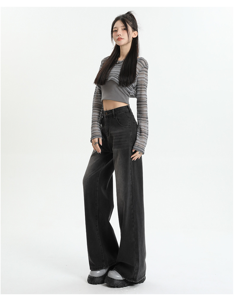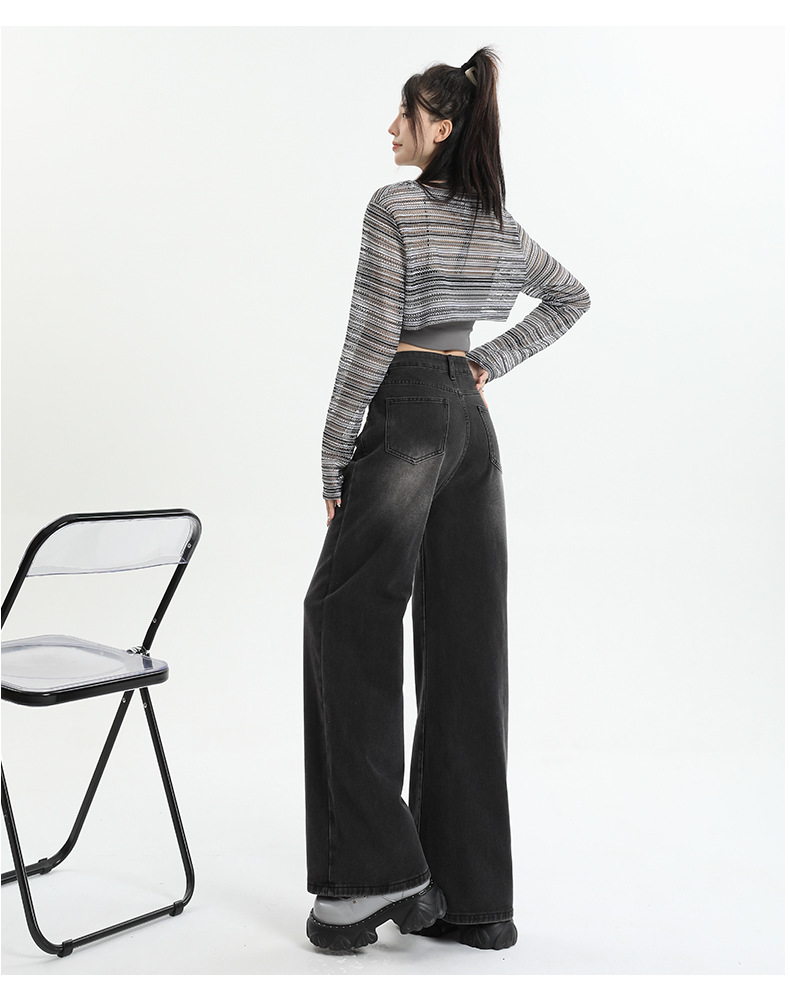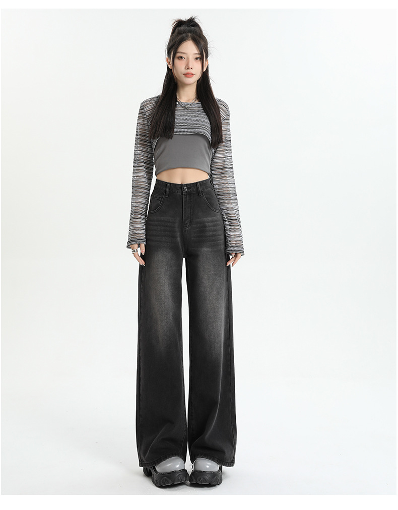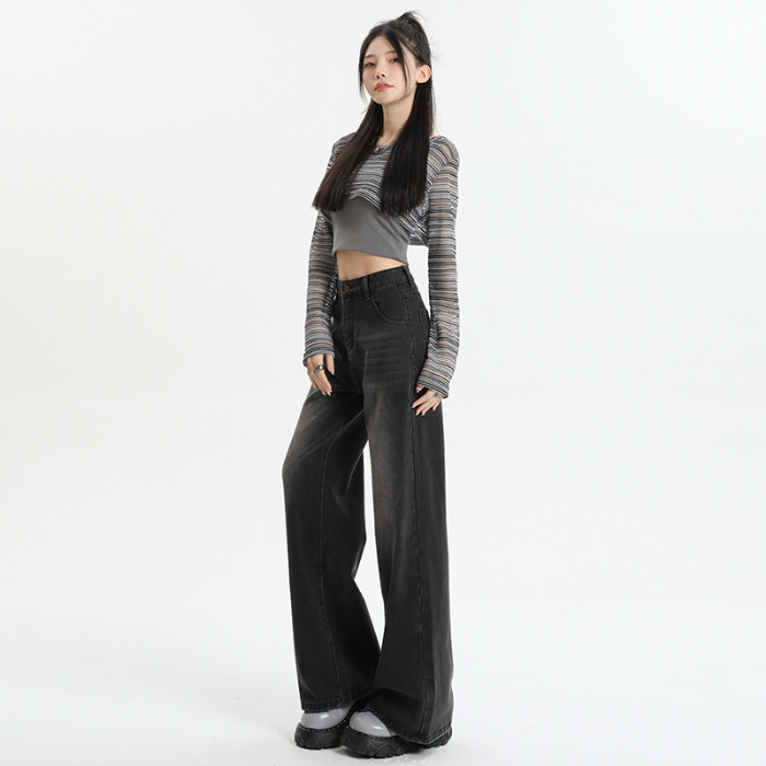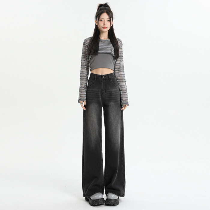 아메리칸 스타일 하이 웨이스트 블랙 그레이 스트레이트 세탁 청바지 여성용 루즈 슬리밍 올 매치 트렌디 와이드 레그 트렌디 한 바지