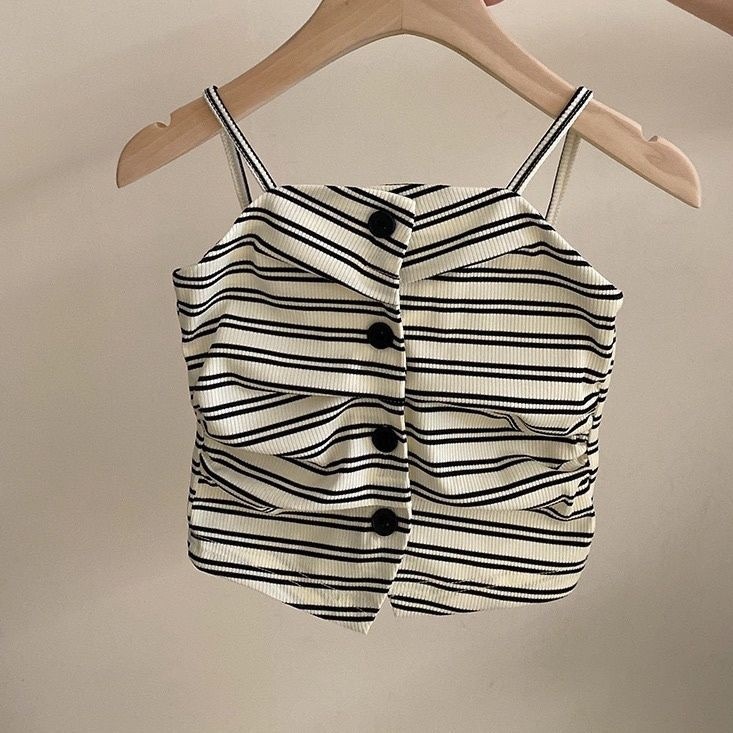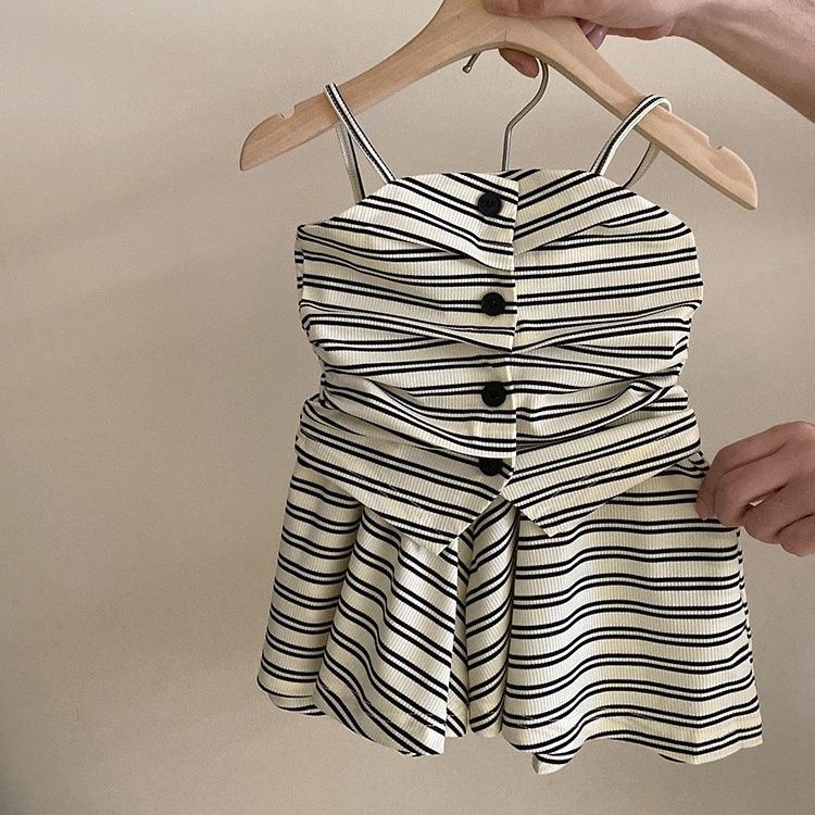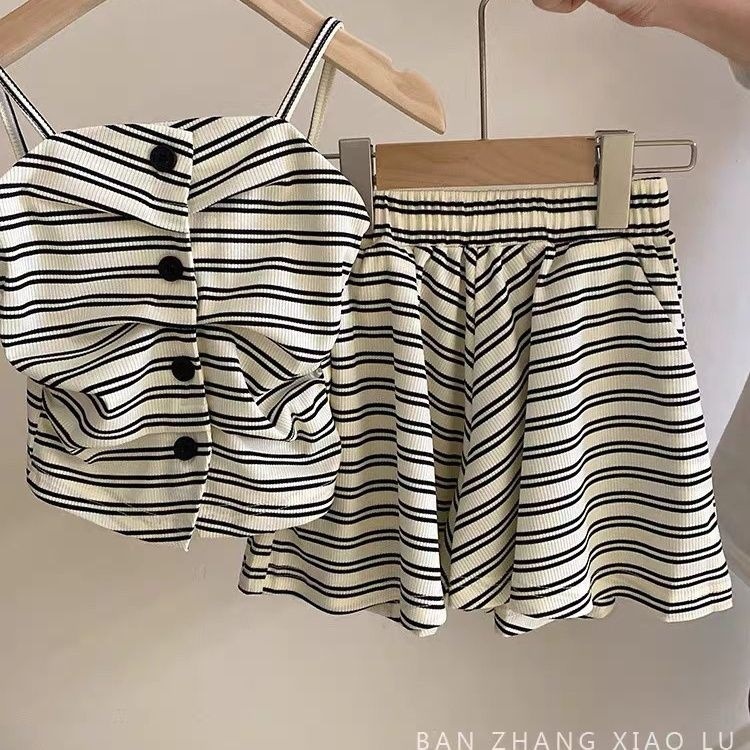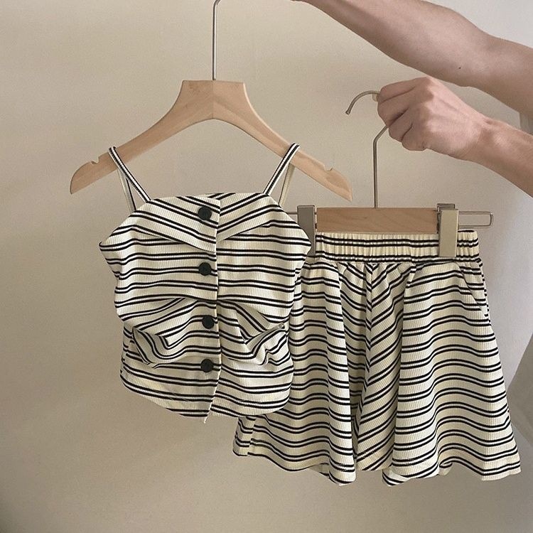 여름 새로운 스타일 서양식 디자인 팬티 스트라이프 슬링 반바지 투피스 소녀 트렌디 캐주얼 스트라이프 세트스토어 가기
