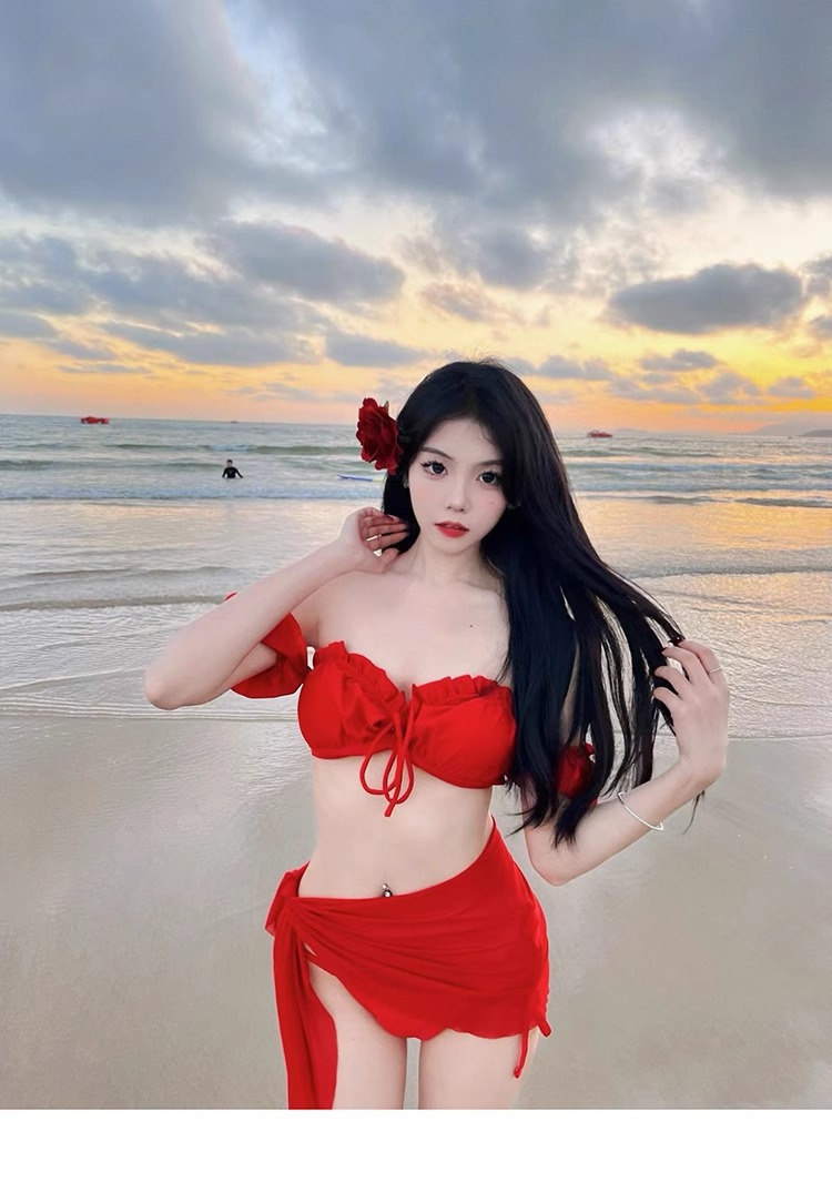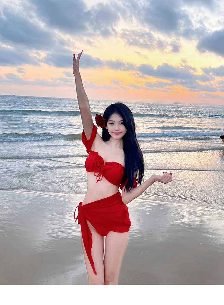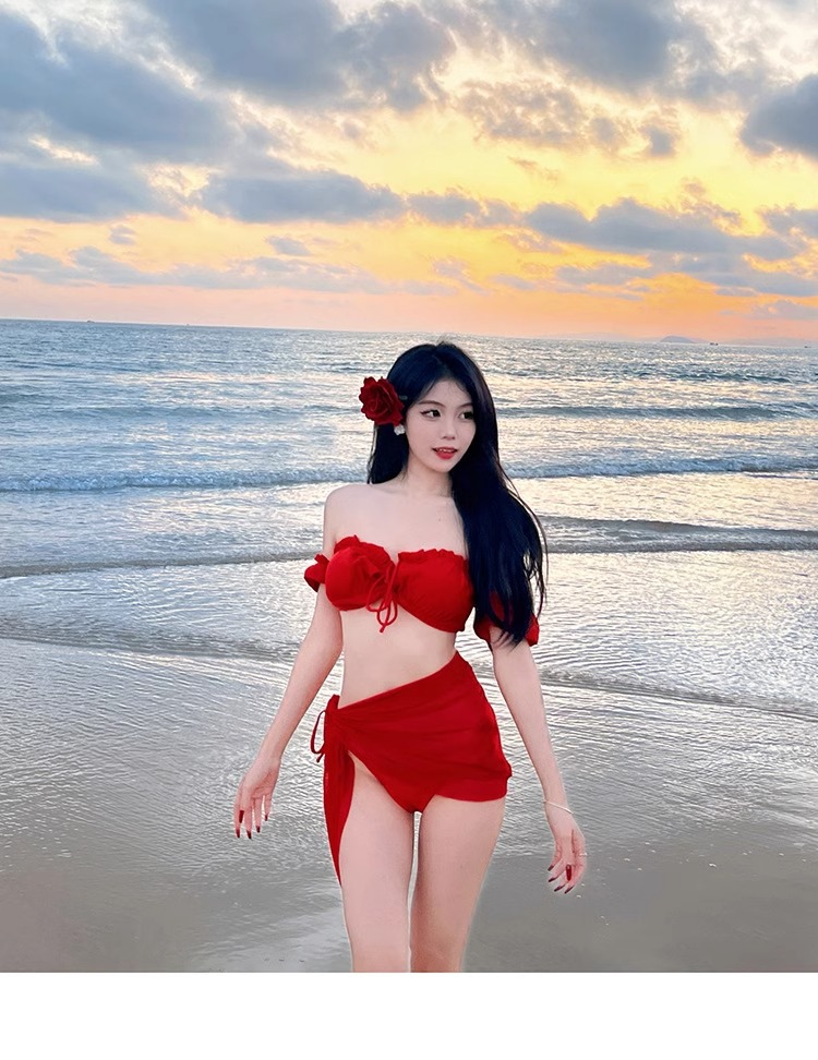 • 7723 빨간색 쓰리피스 수영복 + [머리꽃]