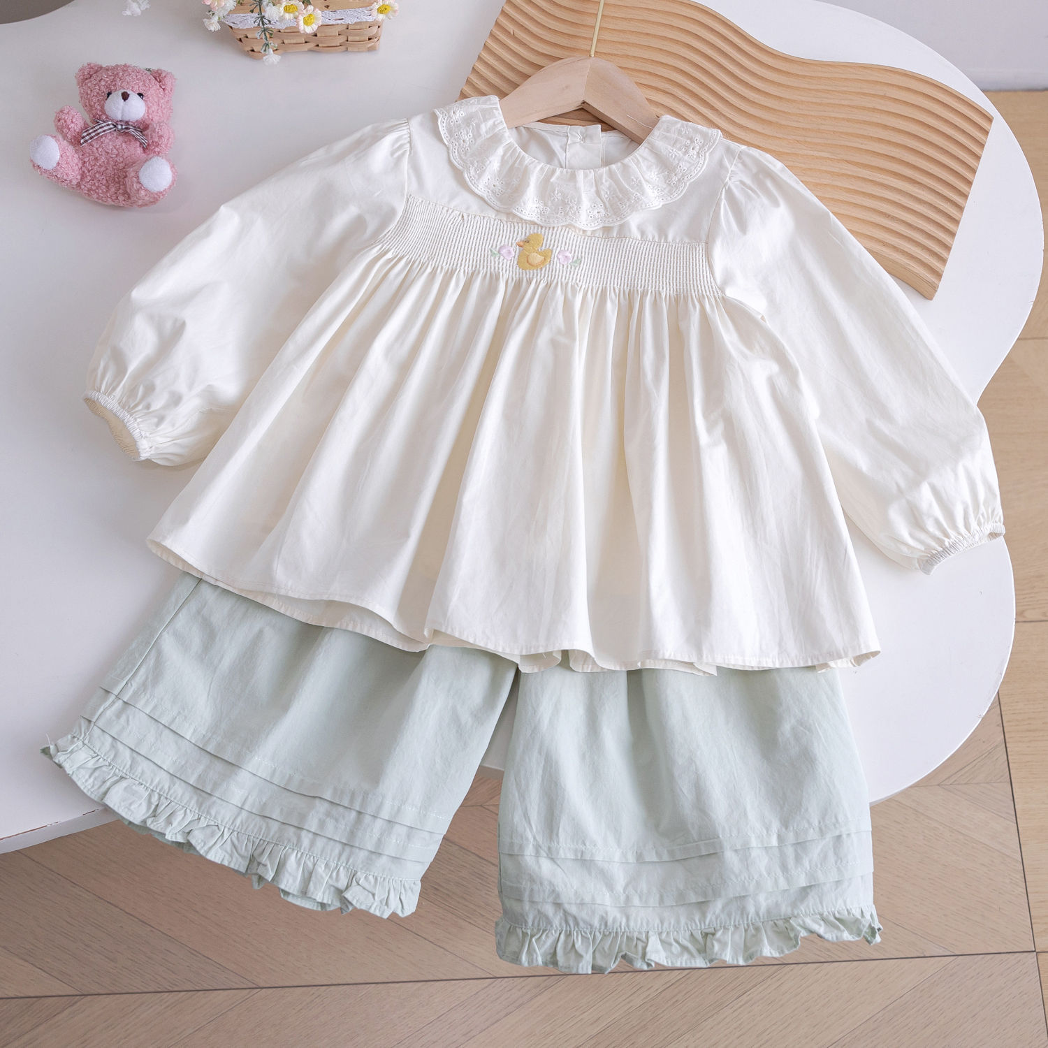 모리 스타일 어린이 신선한 올 매치 바지 2025 새로운 스타일 소녀 아기 단색 간단한 레이스 느슨한 와이드 레그 바지