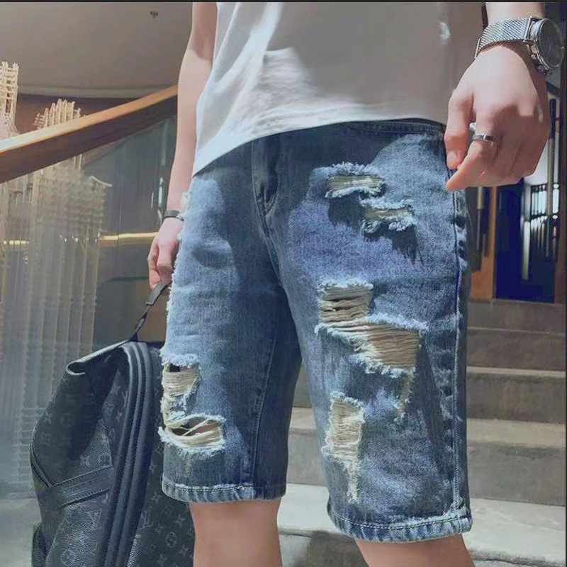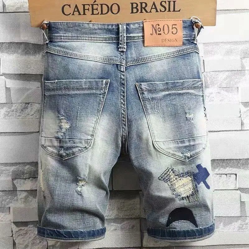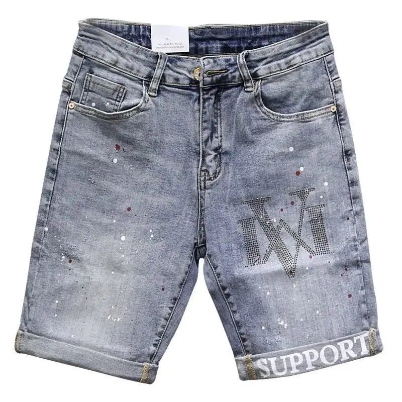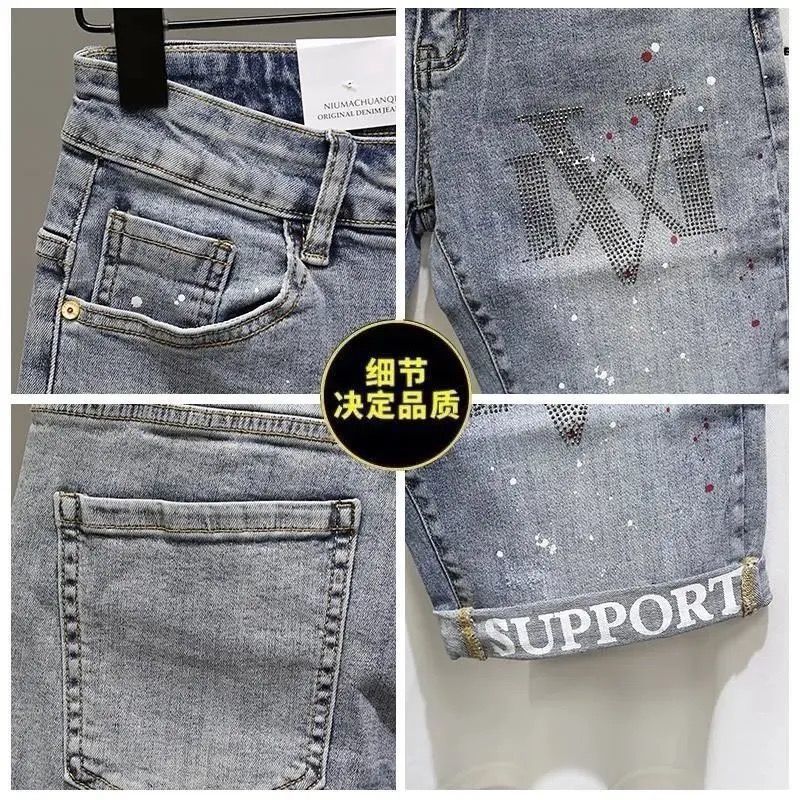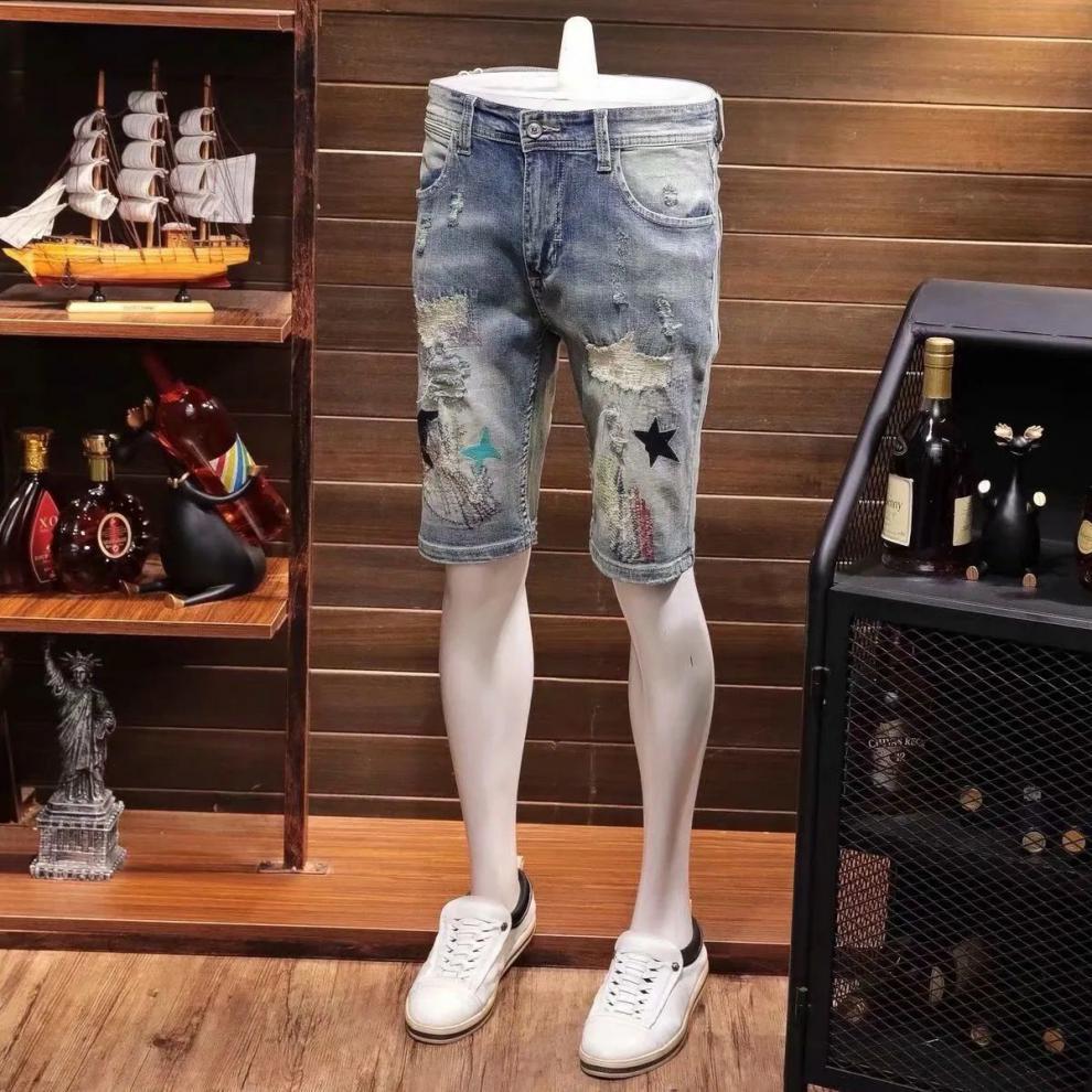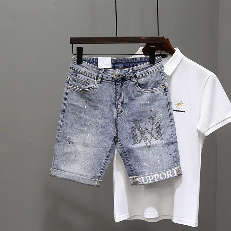 데님 반바지 남자 유행 브랜드 잘 생긴 밝은 색 여름 뜨거운 드릴링 슬림-맞는 올매치 유행 5 점 짧은스토어 가기