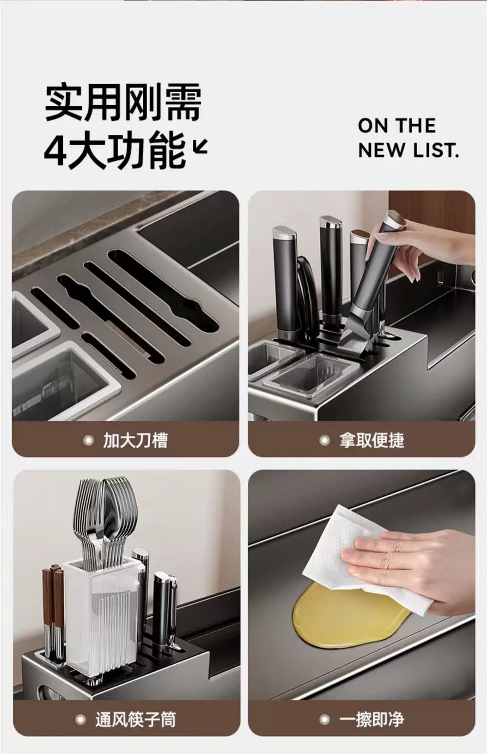 • [건그레이] 수납칸 3개, 2단 스테인리스 젓가락 꽂이 + 물받이 + 칼꽂이 + 고리 4개