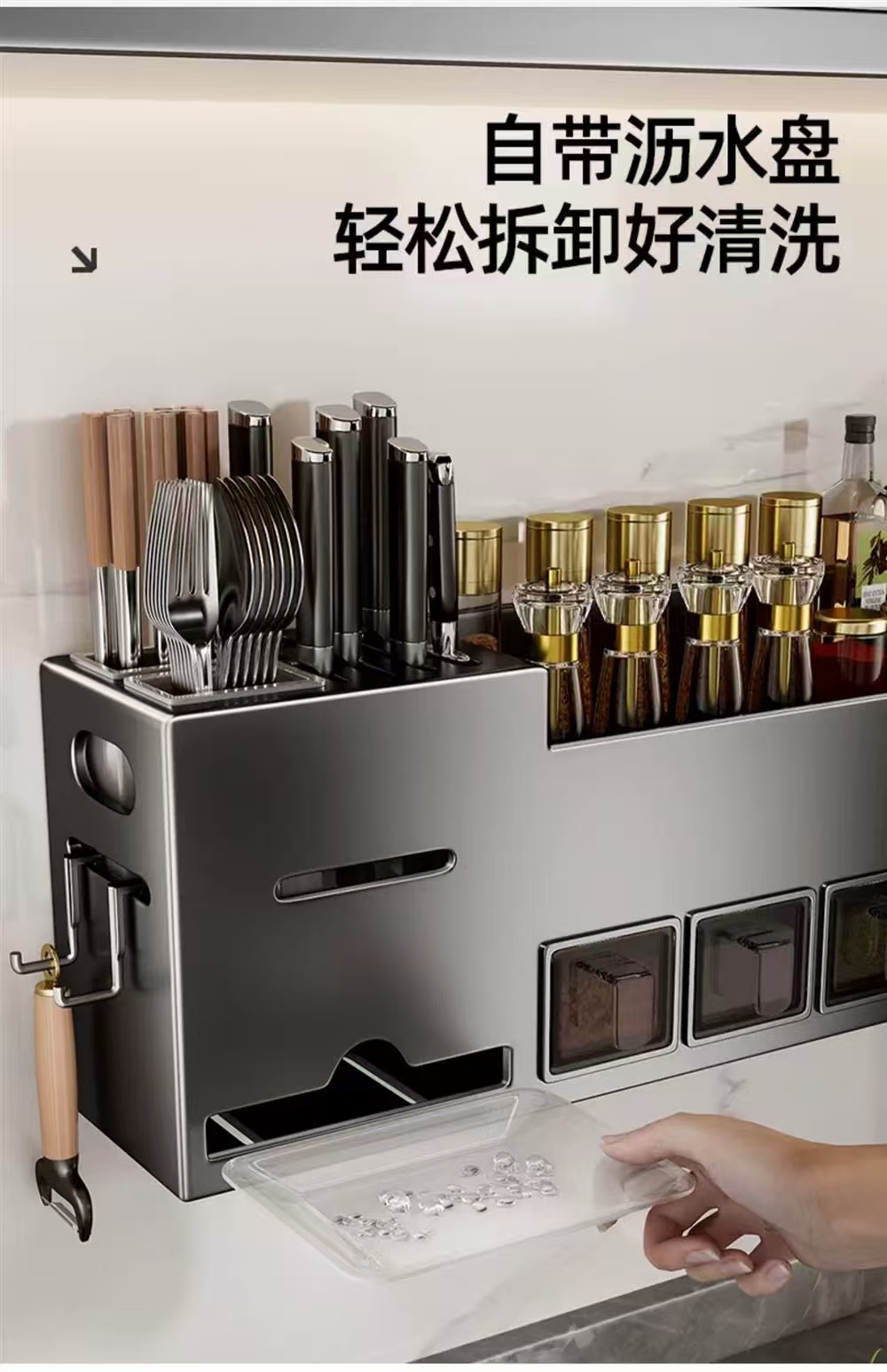 • [크림화이트] 수납칸 4개, 2단 스테인리스 젓가락통 + 물받이 + 칼꽂이 + 고리 4개