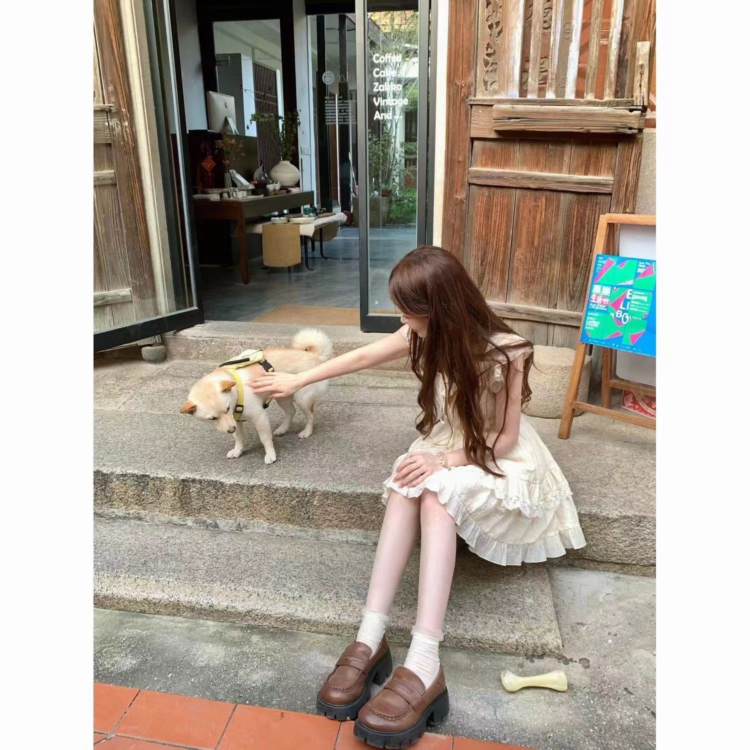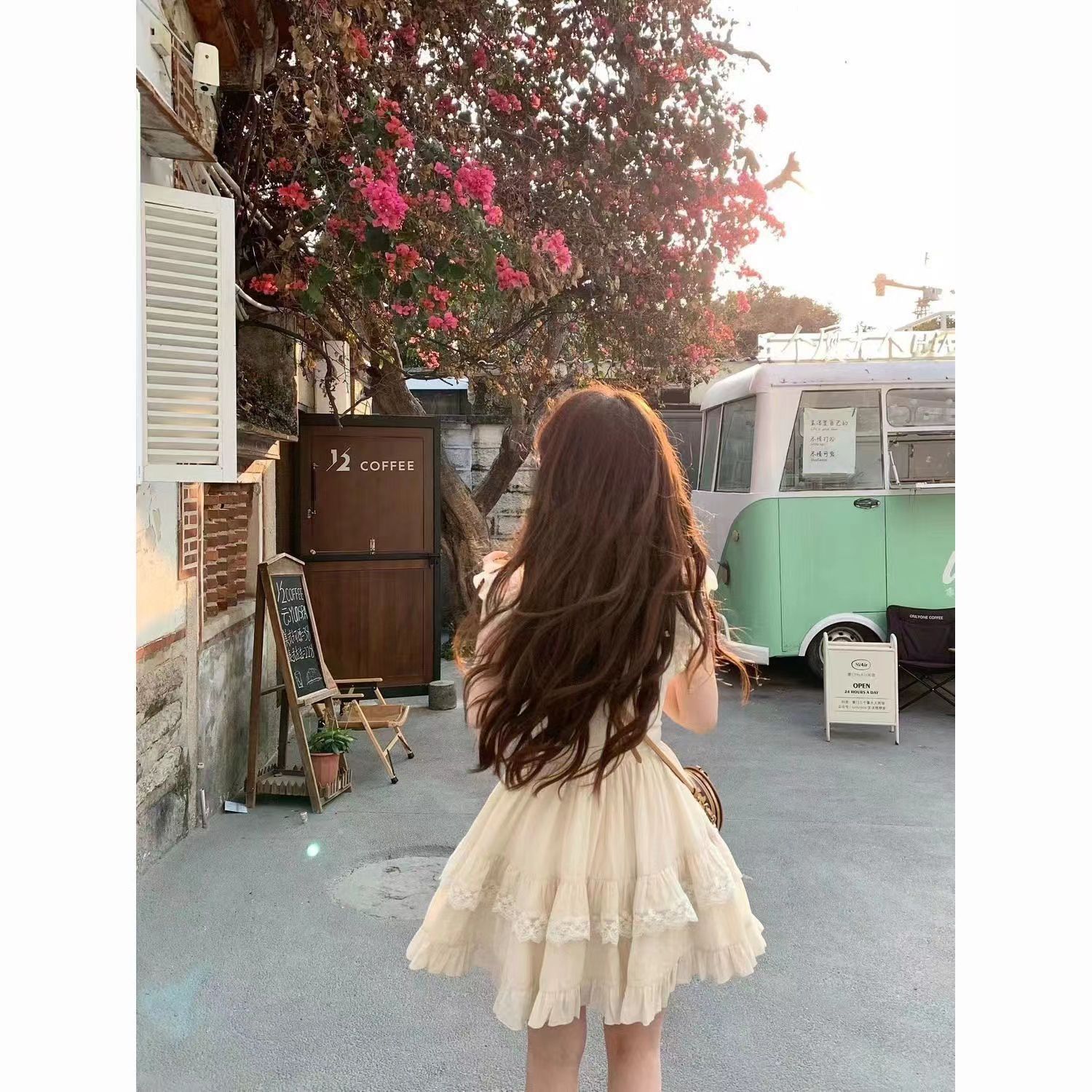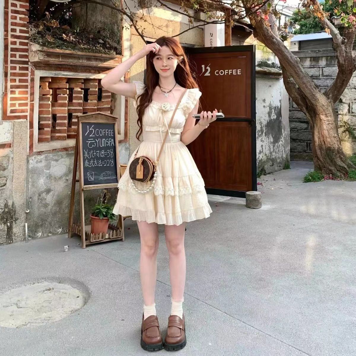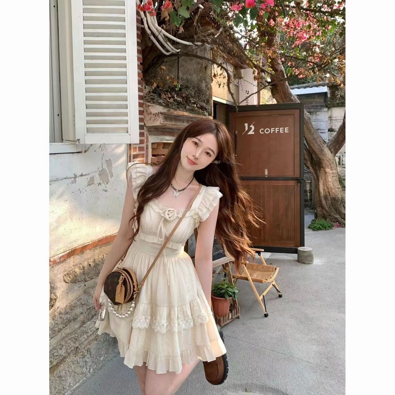 프랑스 달콤한 첫사랑 작은 비행 소매 원피스 어린이 여름 작은 기질 허리 A-라인 공주 스커트 짧은 치마스토어 가기