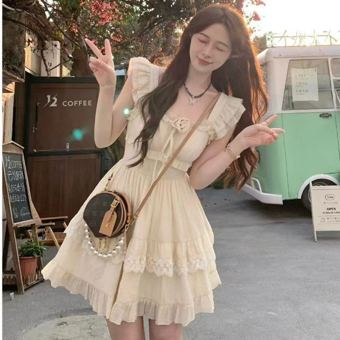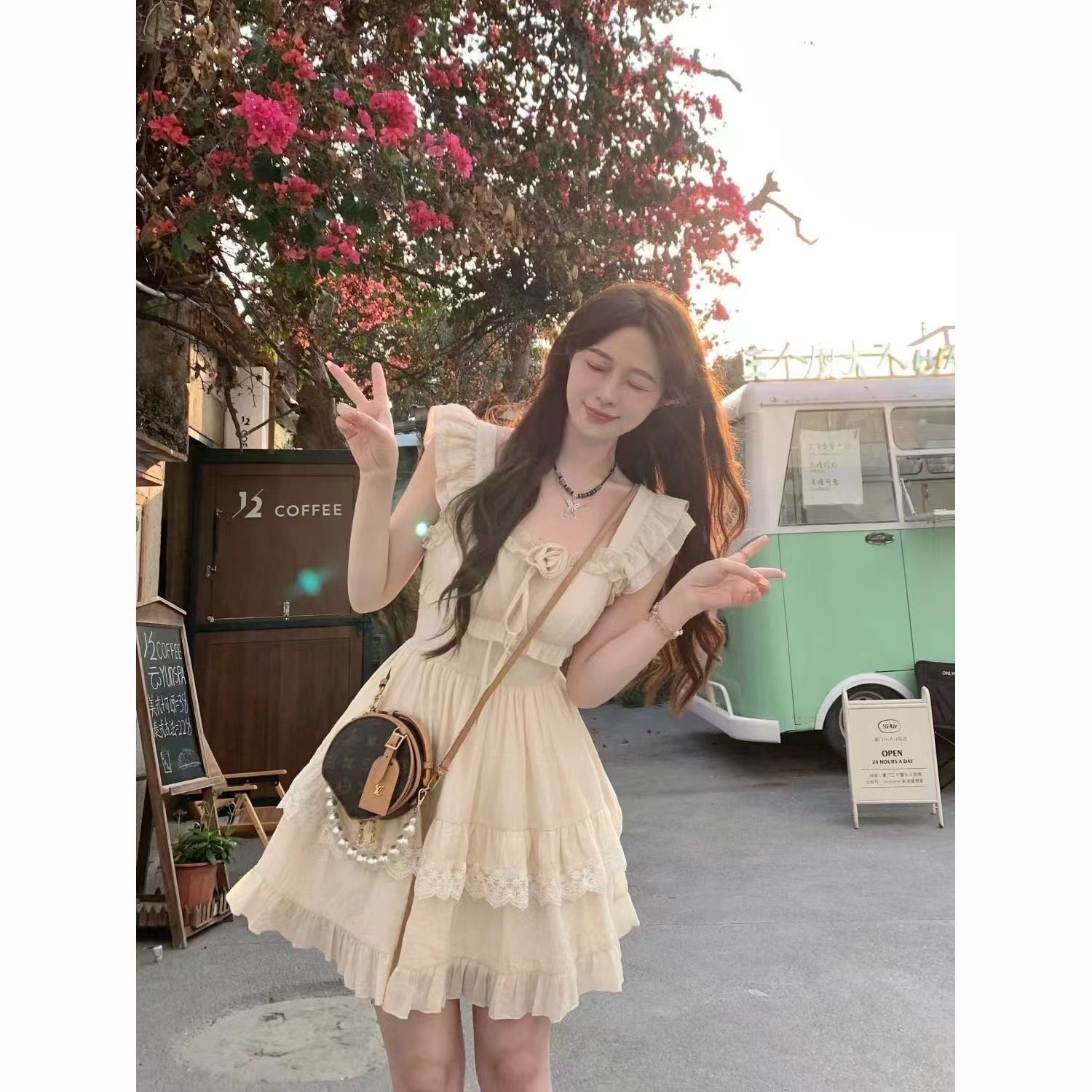 프랑스 달콤한 첫사랑 작은 비행 소매 원피스 어린이 여름 작은 기질 허리 A-라인 공주 스커트 짧은 치마