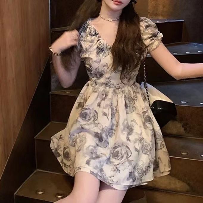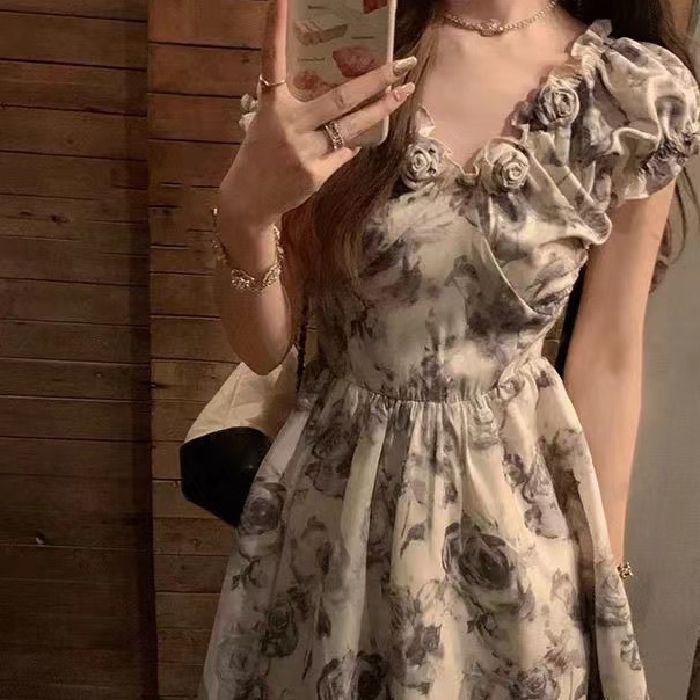 잉크와 워시 로즈 3 차원 꽃 테이퍼 스커트 여성 여름 2025 새로운 프랑스 스타일 작은 허리 우아한 원피스스토어 가기