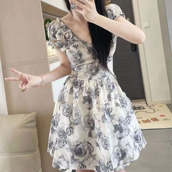 잉크와 워시 로즈 3 차원 꽃 테이퍼 스커트 여성 여름 2025 새로운 프랑스 스타일 작은 허리 우아한 원피스