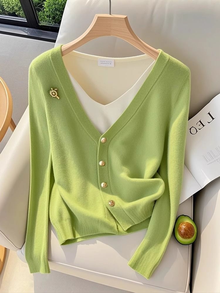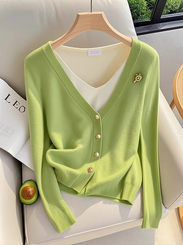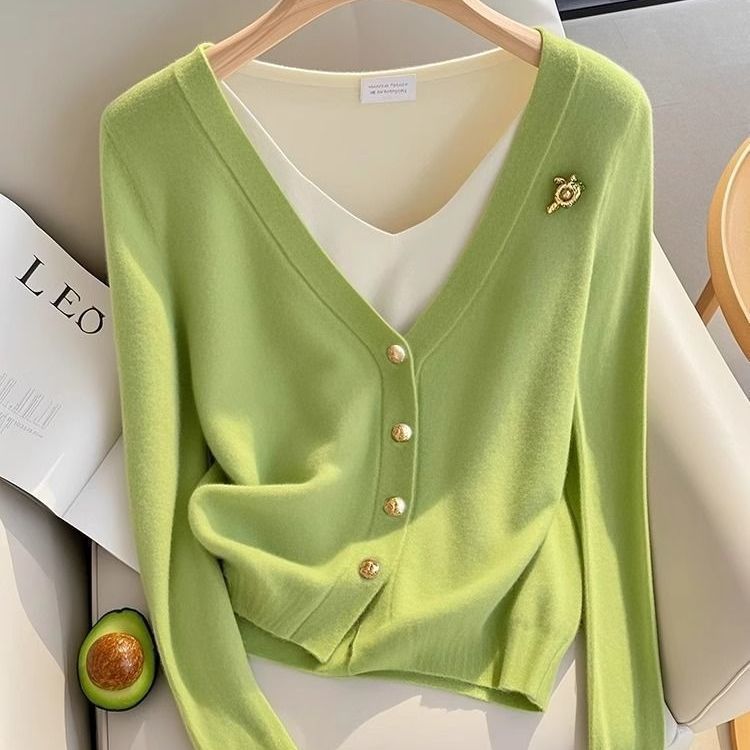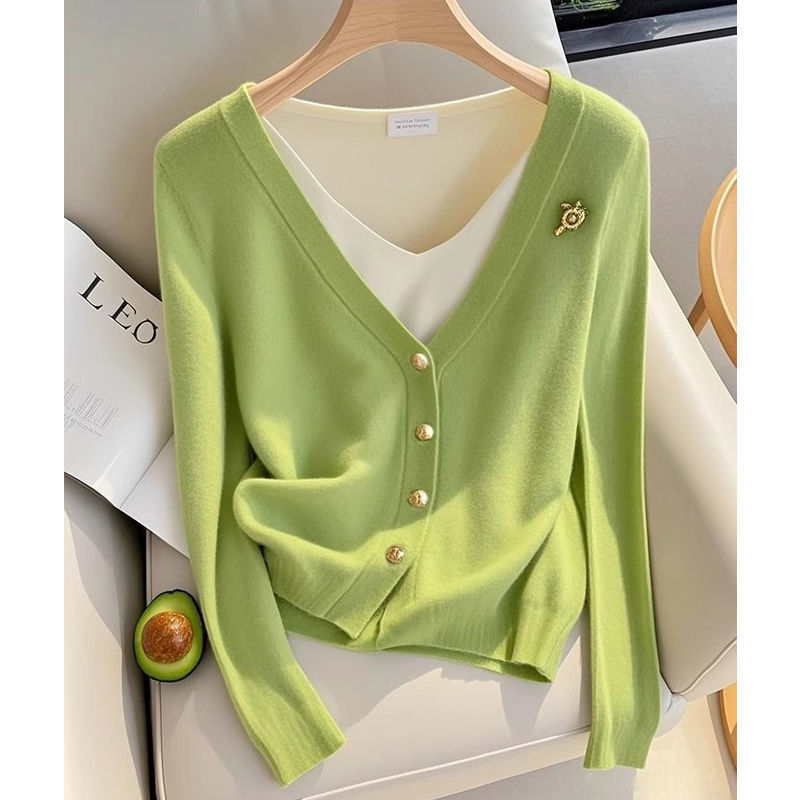 가을 2025 새로운 스타일 샤넬 스타일 가짜 투피스 그린 니트 카디건 여성의 독특한 슈퍼 굿스토어 가기