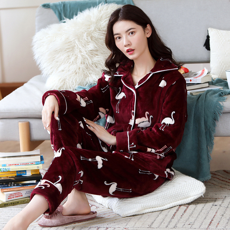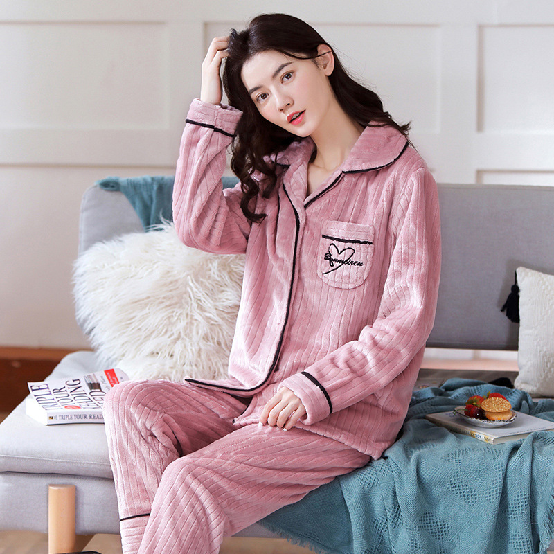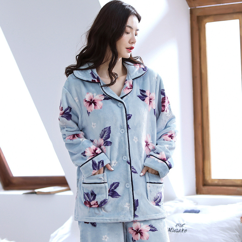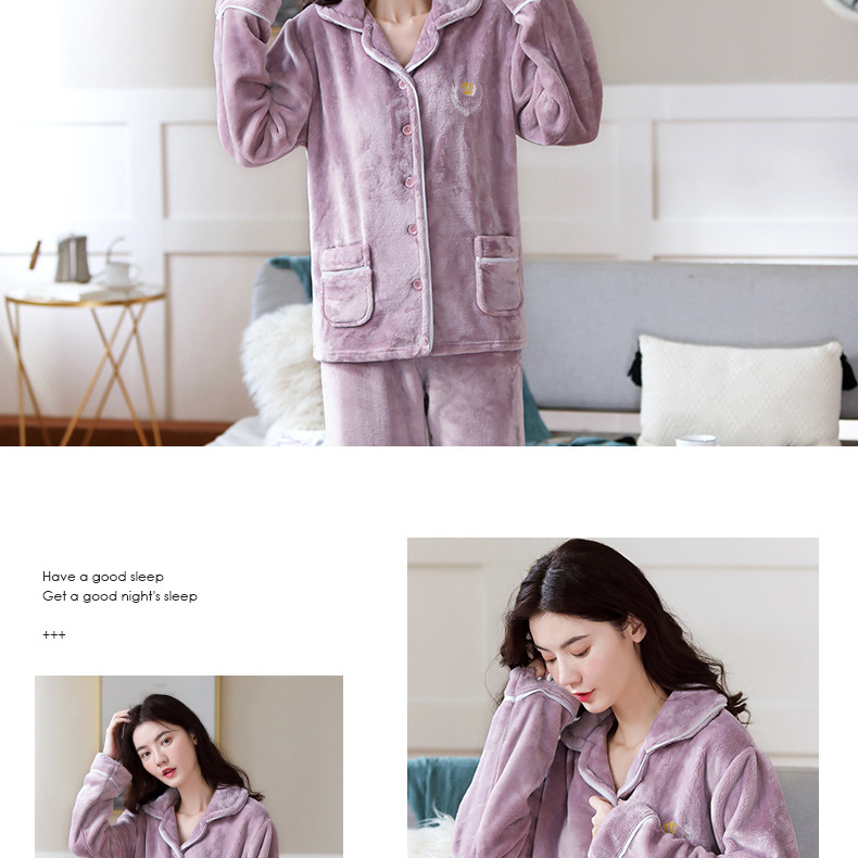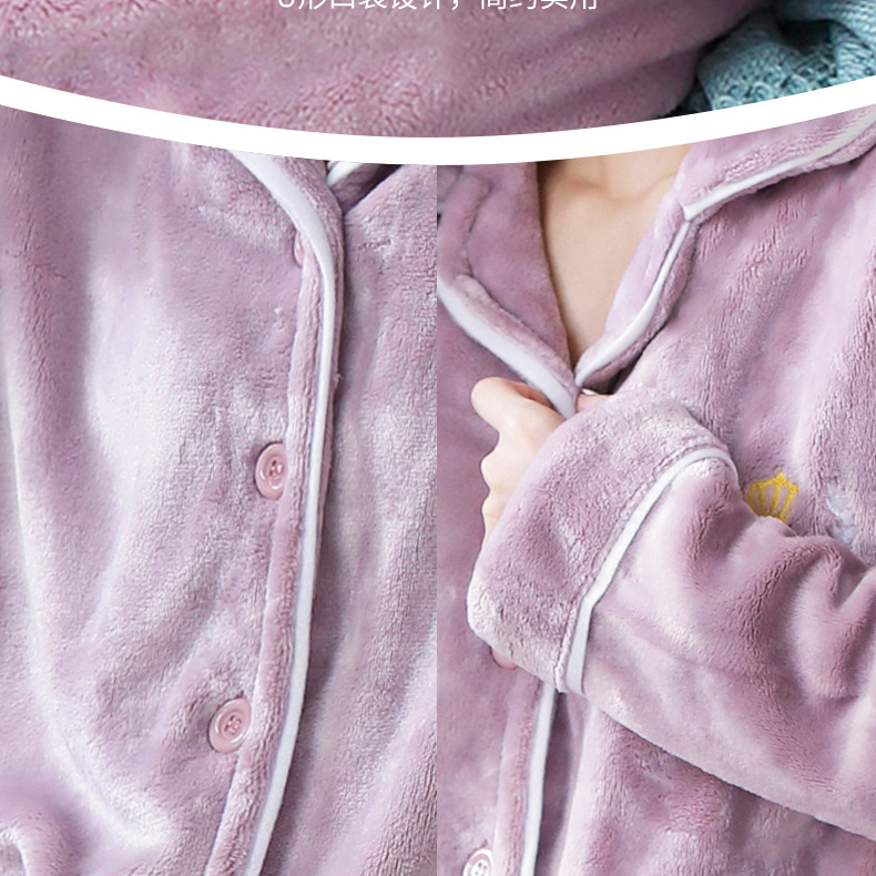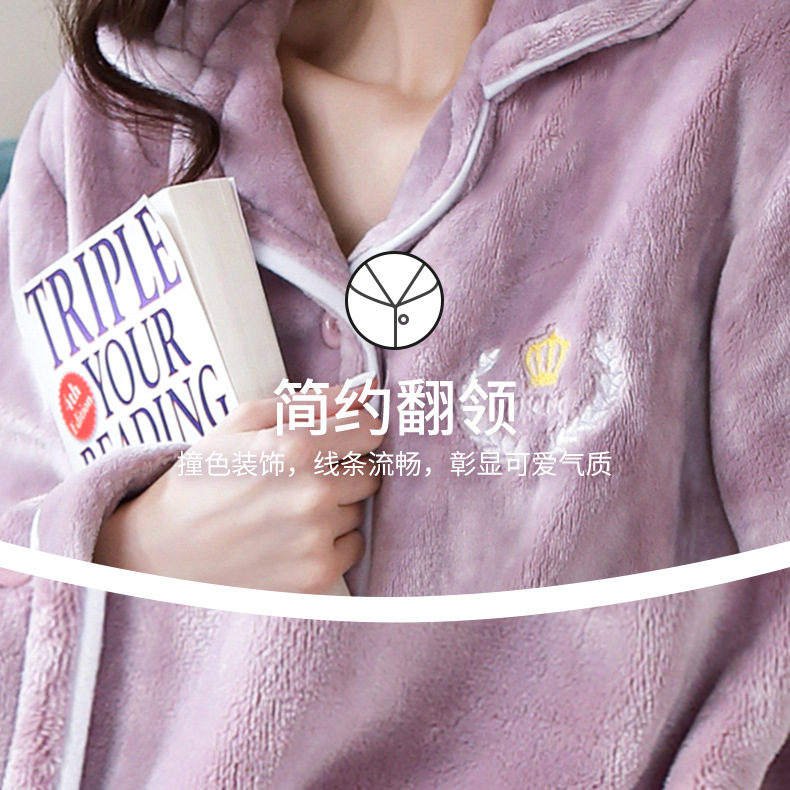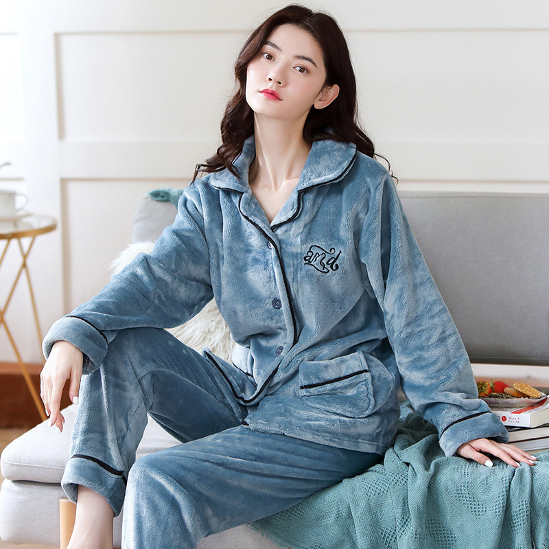 새로운 가을 겨울 산호 벨벳 잠옷 여성용 카라 오픈 플란넬 여성 홈웨어 세트