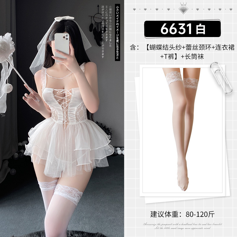• Pure Desire Little Wife [보우 베일 + 레이스 넥 링 + 드레스 + T 바지] + 흰색 스타킹